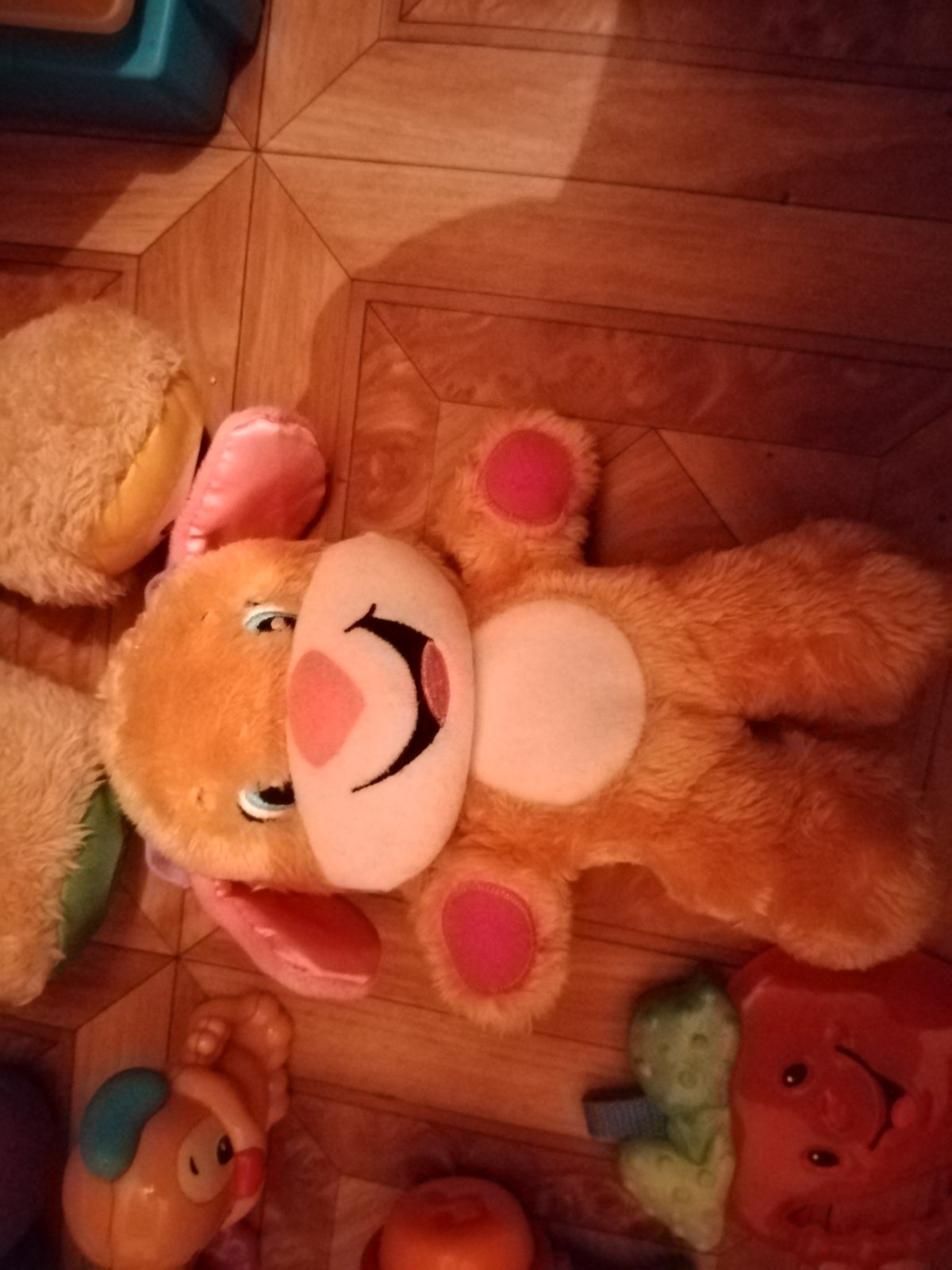 Zachovalá hračka, málo hraná. Po natiahnutí hra uspavaciu melódiu.