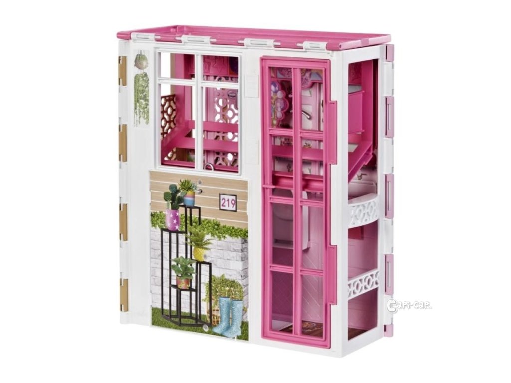 Tento plne vybavený Barbie® Skladací dom inšpiruje k nekonečnému hraniu vďaka dvom poschodiam a štyrom hracím miestnostiam vrátane podkrovnej postele, kúpeľne, kuchyne a jedálne.