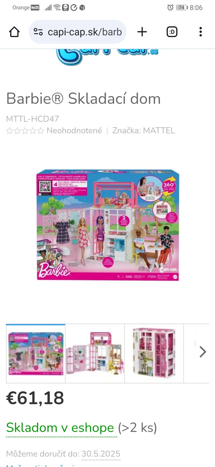 Tento dokonalý zariadený Barbie domček ti umožní skvelú hru s tvojou bábikou Barbie. Tento 360 stupňový domček obsahuje 4 izby – kuchyňu, jedáleň, kúpeľňu, spálňu- a obsahuje všetko, čo potrebuješ, vrátane rozkošného šteniatka! Bábika nie je súčasťou balenia. PC 45€, Na inej stránke cena vyše 60€, viď foto.V