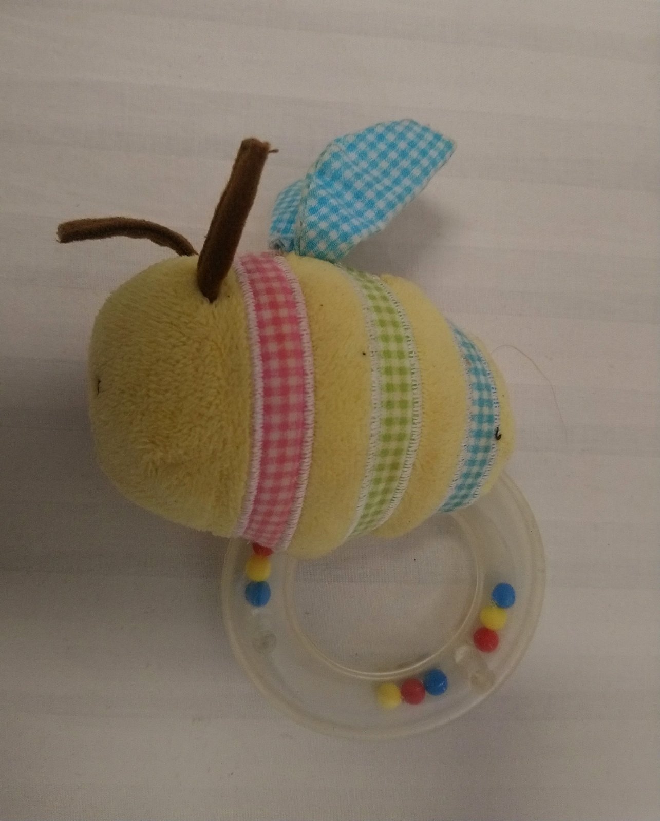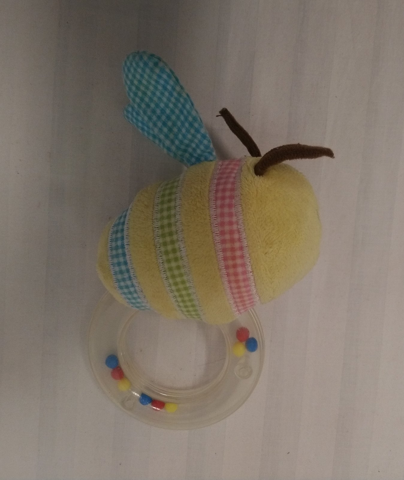 Hrkálka Včielka s kruhom, má plastový kruh s farebnými guličkami, na ktorom je upevnená látková včielka, hrkálka vydáva hrkajúci zvuk, krídla včielky šuchocú, vhodná pre všetky bábätká,