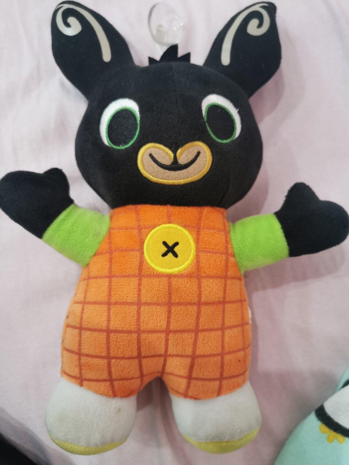 Plyšový zajačik z rozprávky Bing, ktorý sa dá aj zavesiť na okno v aute napr. Výška cca 29cm.V
