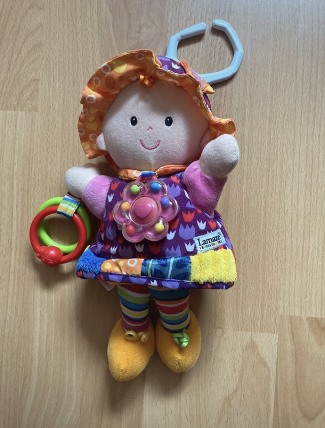Bábika má šuštiace šaty z rôznych druhov materiálov, ktoré stimulujú zmysly dieťaťa.