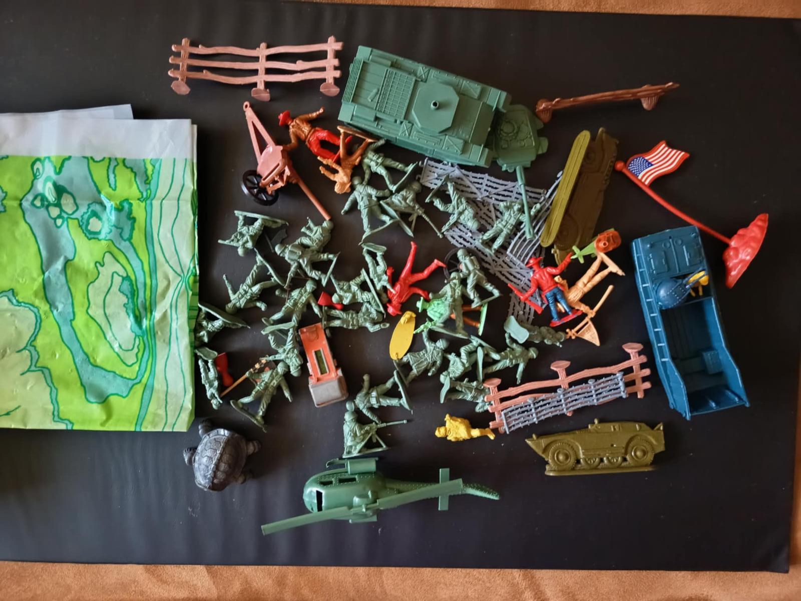 Kopa plastových vojačikov. Niektoré môžu mať chýbajúce končatiny, prípadne autičko je neúplne, ale na hranie sa ešte postačí. Cena všetko spolu