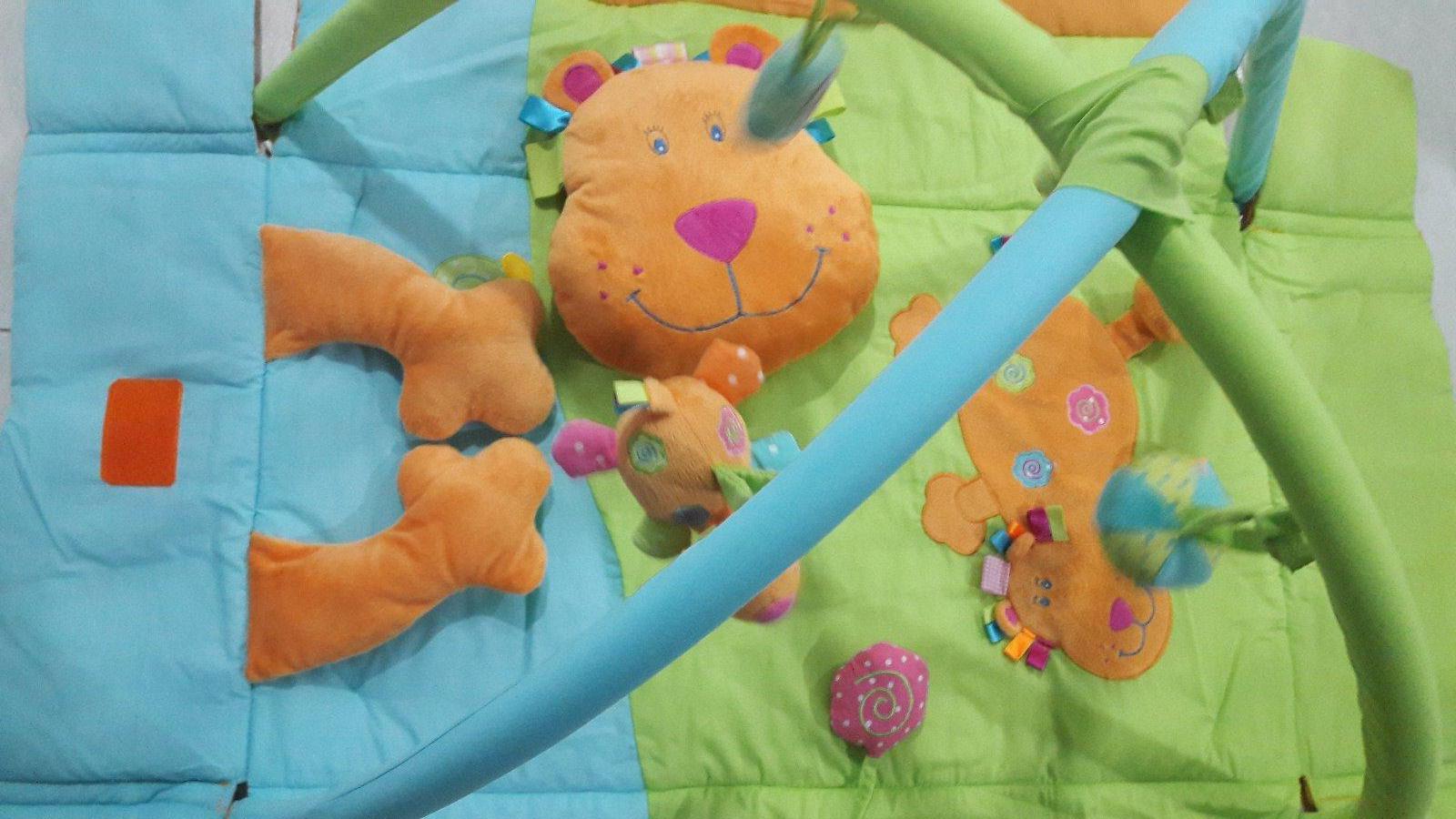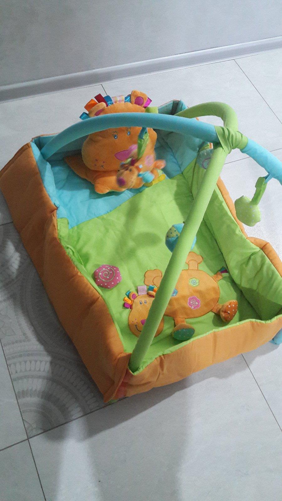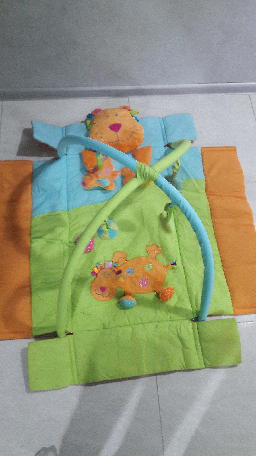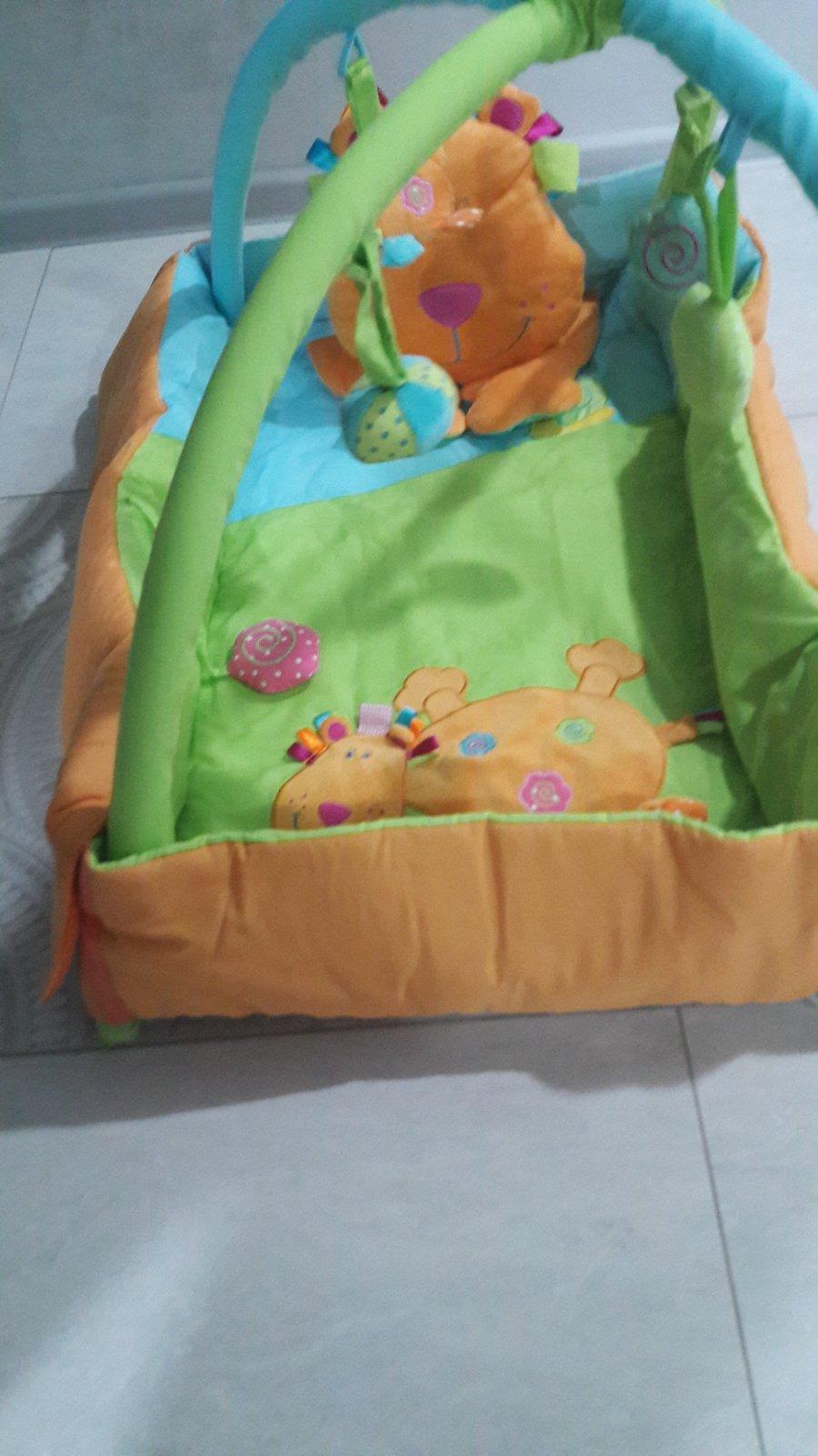 Ponukam peknu hraciu deku v prijemnych farbach. Decka ma hrazdicku, ktoru mozno odnimat a 4 zavesne plysove hracky, ktore mozno tiez snat a pouzivat samostatne alebo zamenit za ine zavesne hracky. V hrackach su piskatka, v jednej hrkalka. Decka sa moze pouzivat aj ako podlozka pri rozlozeni, pripadne sa boky daju zalozit, cim sa stava pre babätko bezpecnejsia. Na deke su taktiez 3D prvky, sustiace casti a kvetinka s piskatkom. Sucastou je aj vankusik v tvare roztomileho hrosika, ktory sa upevnuje suchym zipsom. Super viacucelova, s prenosnym obalom.