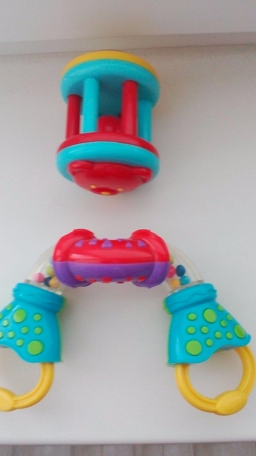 ako nové,kupovane v Tescu,valcek na jednej strane macko a na druhej pohybujúce guličky,dlha hrkalka hrka a dá sa otáčať,cena za oboje