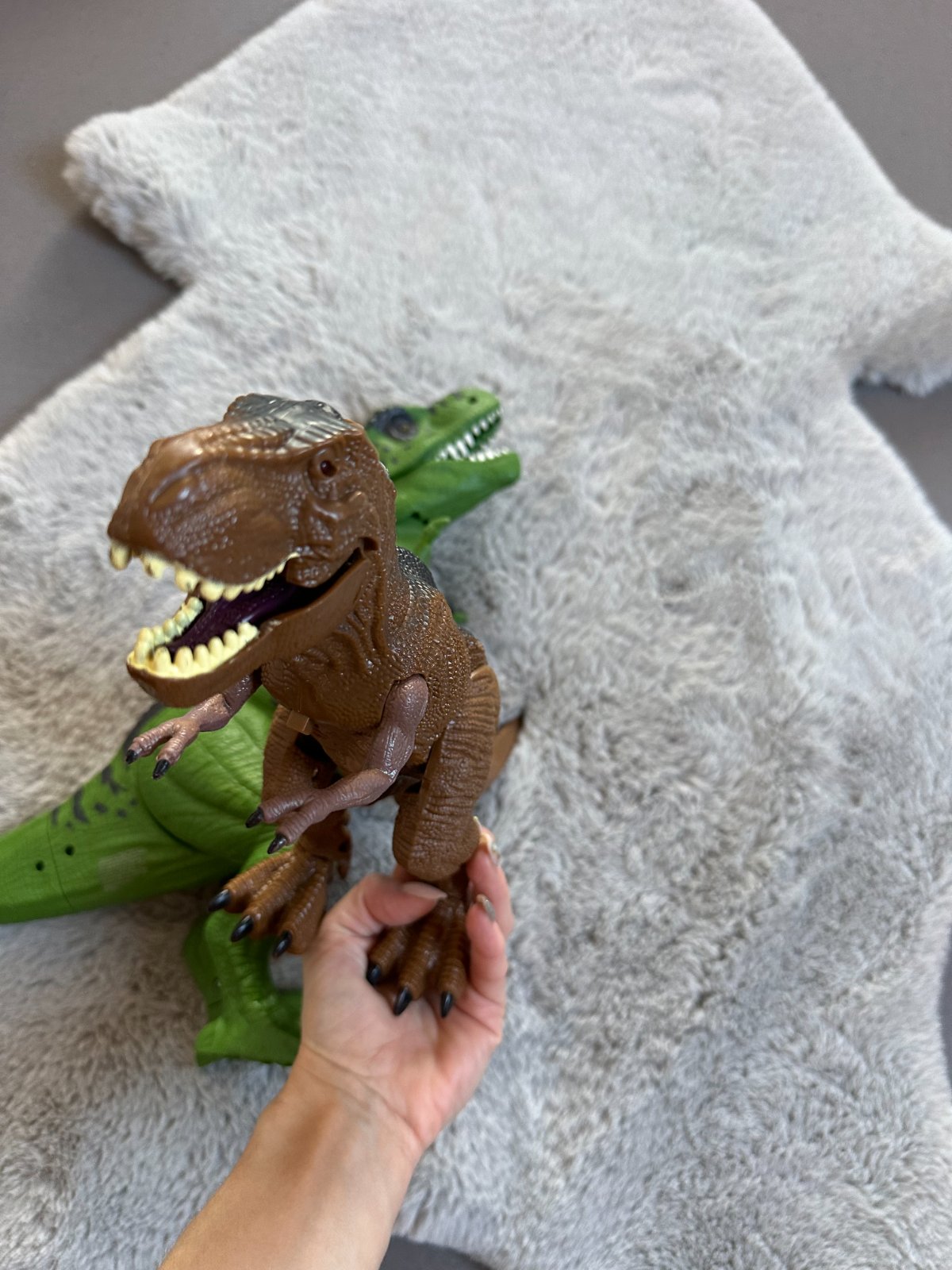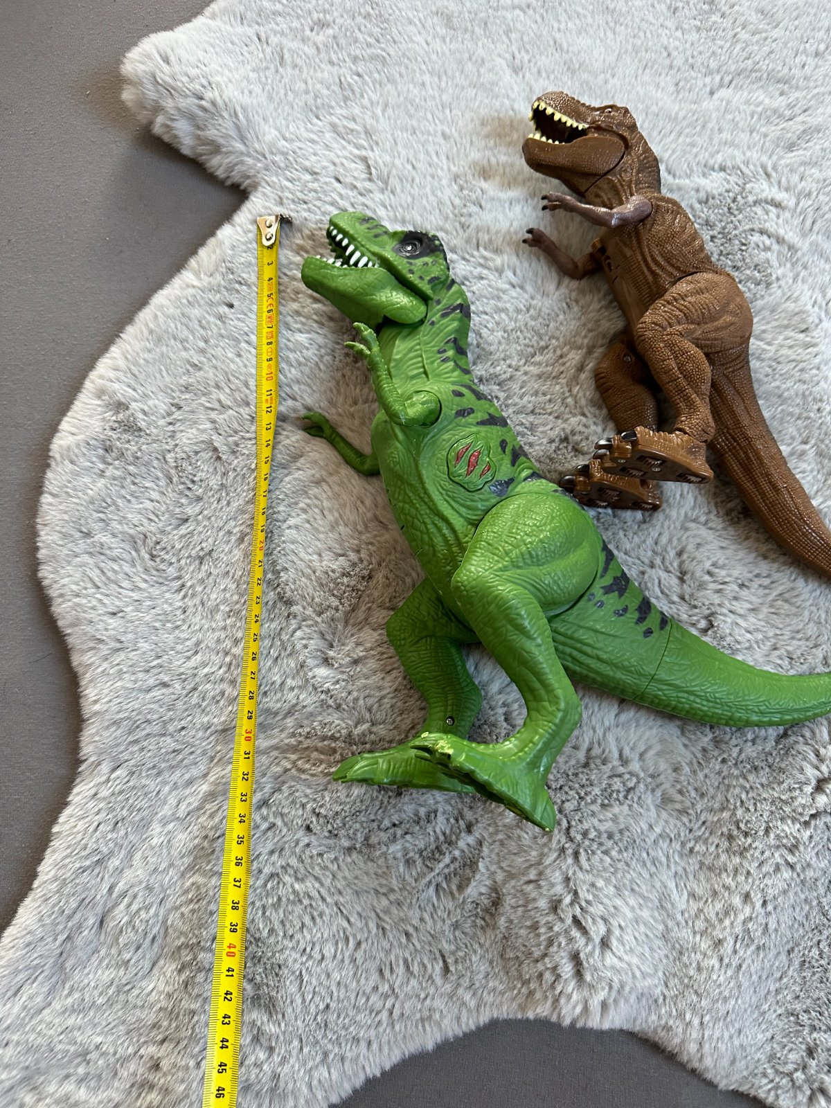 2x stredne veľký dinosaurus. boli elektricke ,hnedy utz nefunfuje ale zeleny sem tam este zahuci a zasvieti na cerveno- treba baterku vymenit. papulky sa dajú otvárať, nohy ruky sú pohyblivé. cena uvedena spolu
