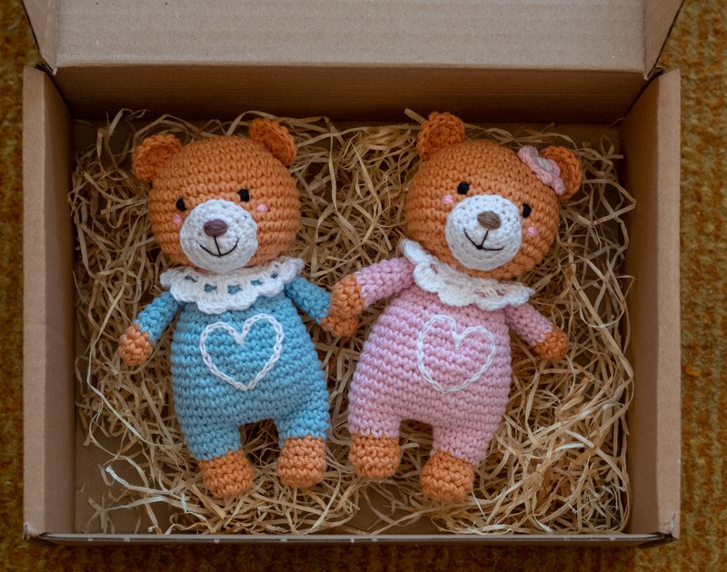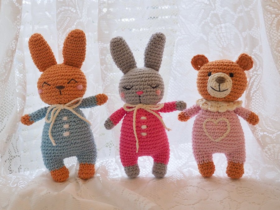 Háčkované medvedíķy a zajkovia. Bavlnená a bavlneno- akrylová priadza. Mackovia majú cca 15 cm, zajačiky 17 cm. V dvoch verziách - s vyšitým srdiečkom a golierikom alebo s mašličkou okolo krku ( mašlička sa dá dať dole) . Môžem rôzne nakombinovať.