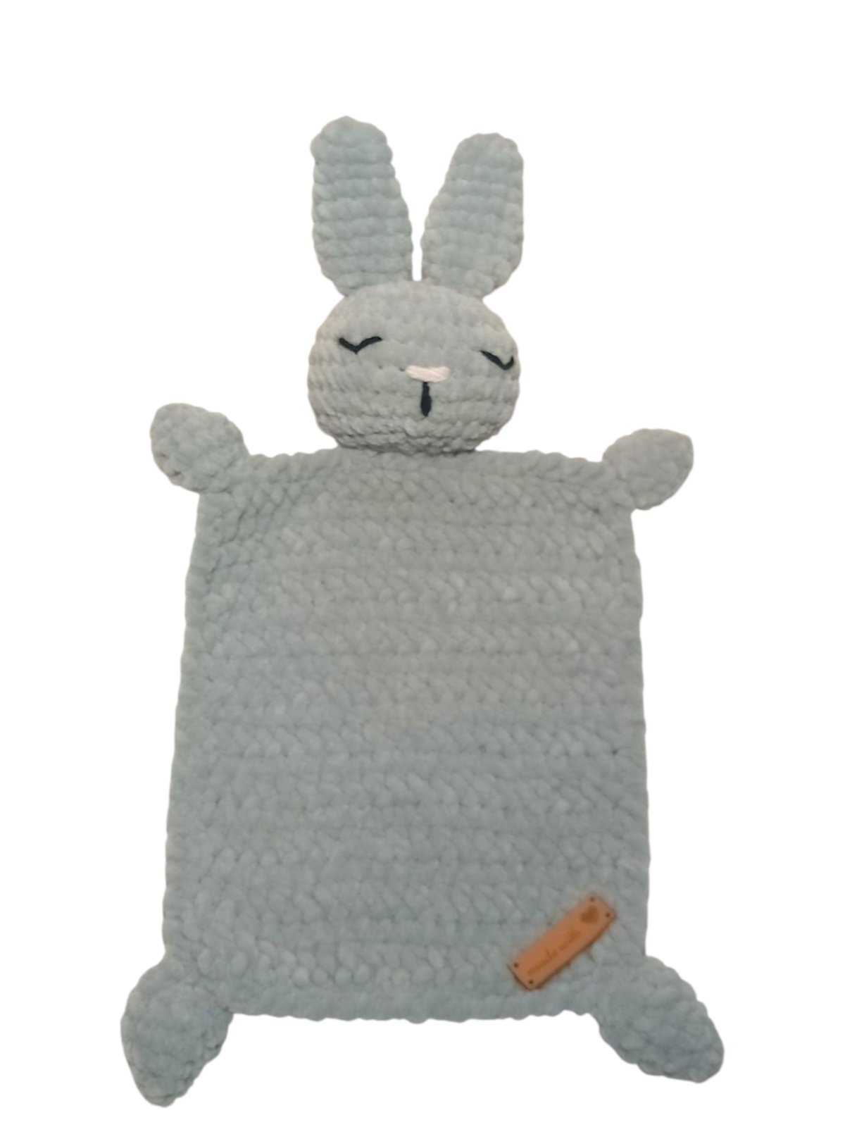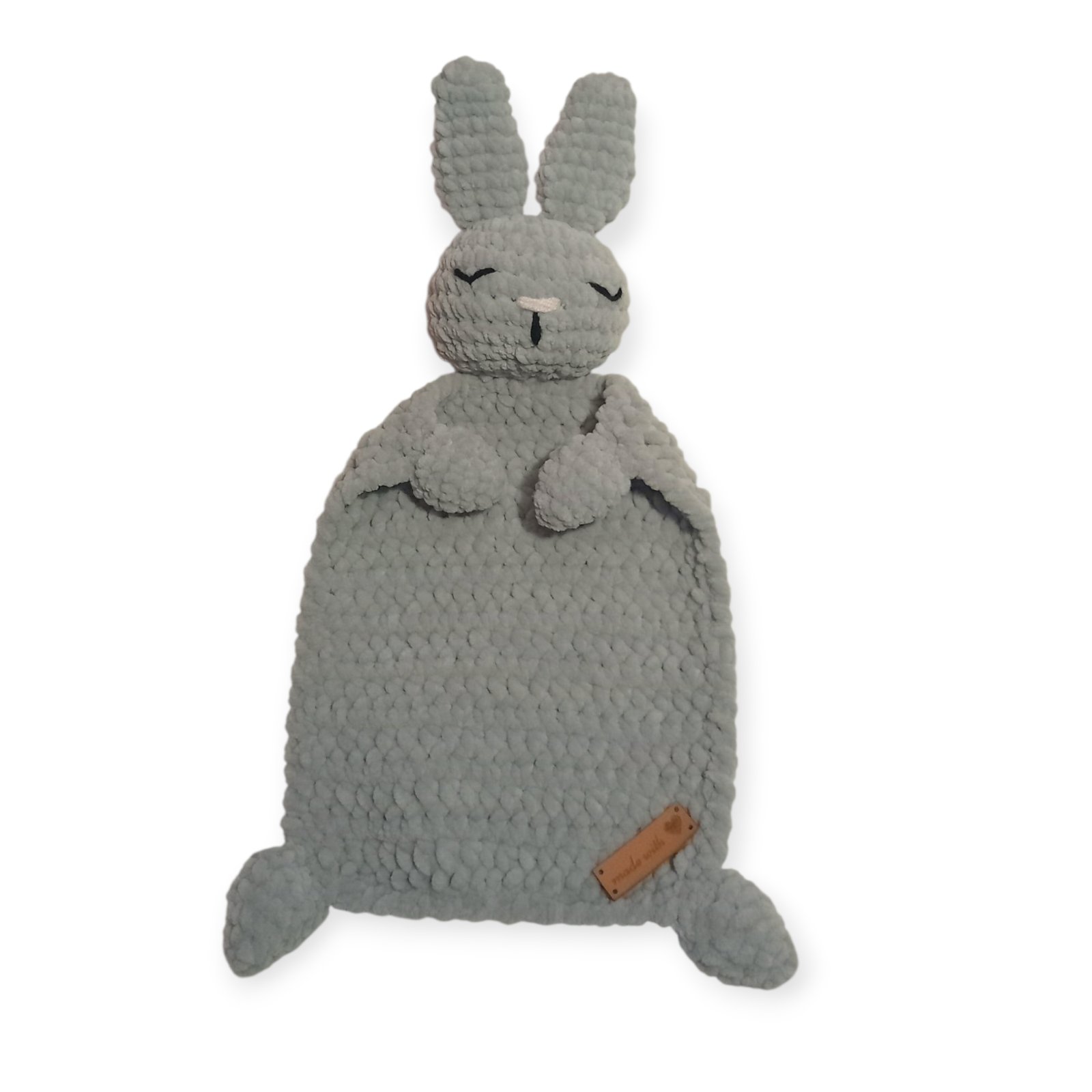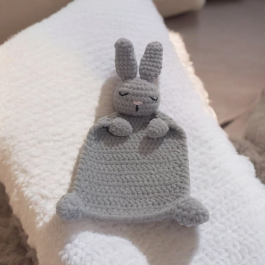 Háčkovaný mojkáčik Zajačik zo sivej hebkej vlny Himalaya. Veľkosť je 30 cm.