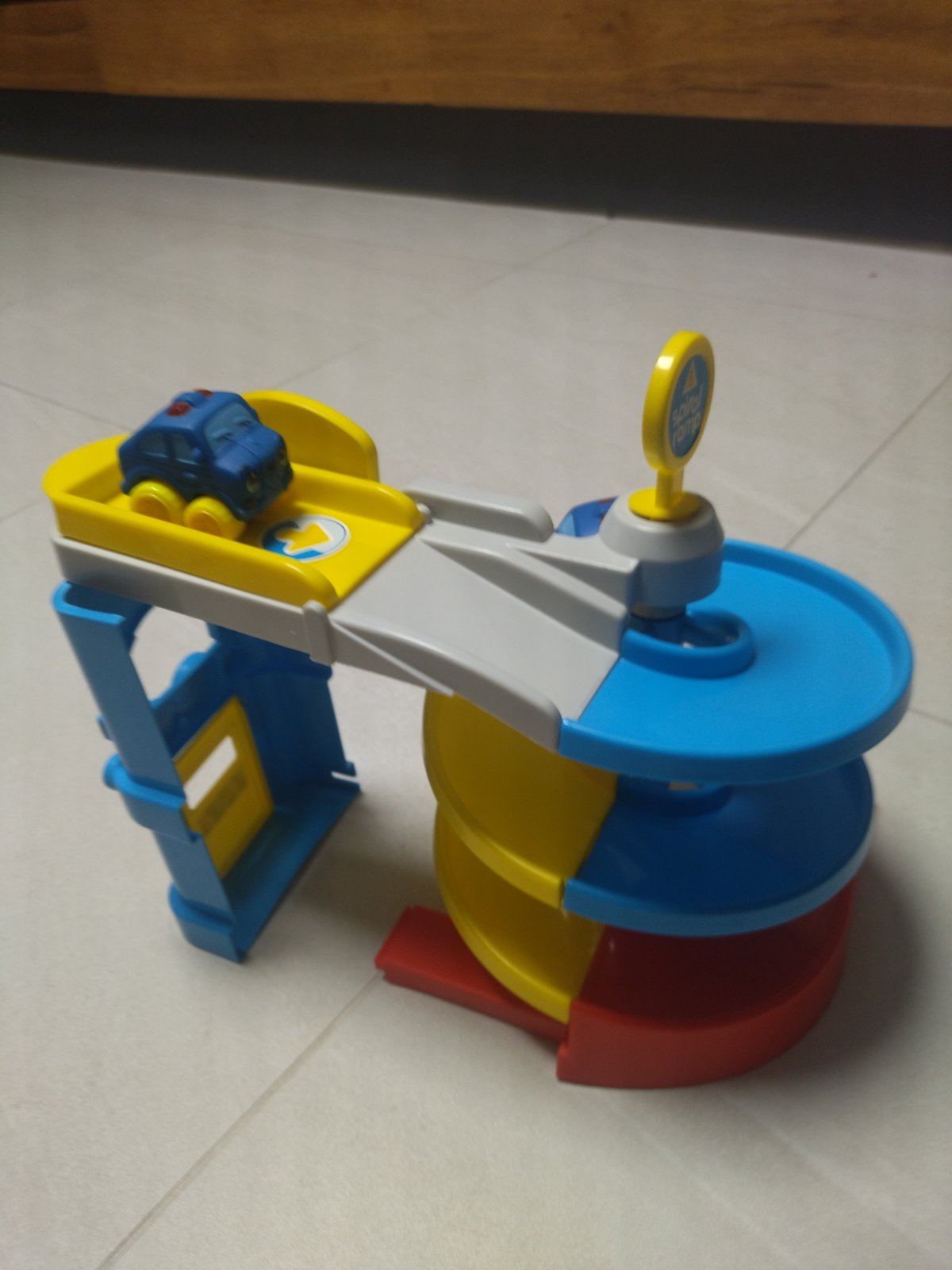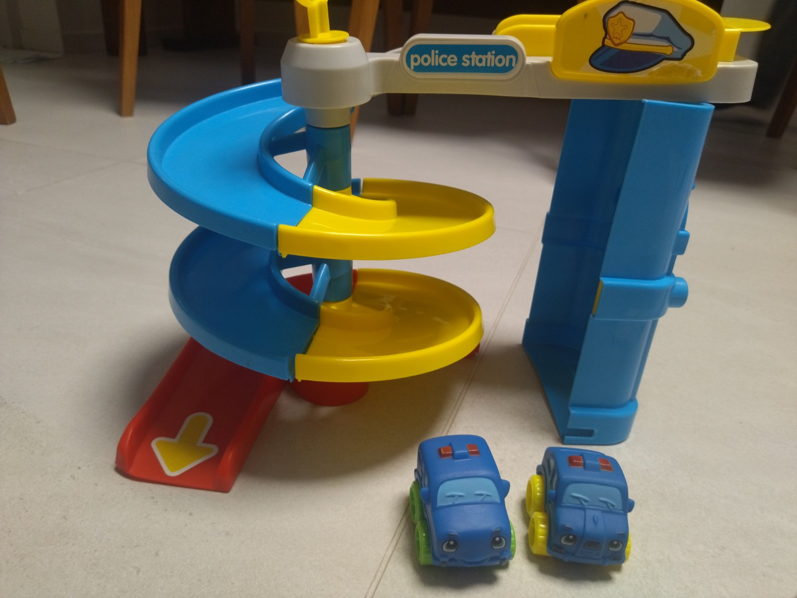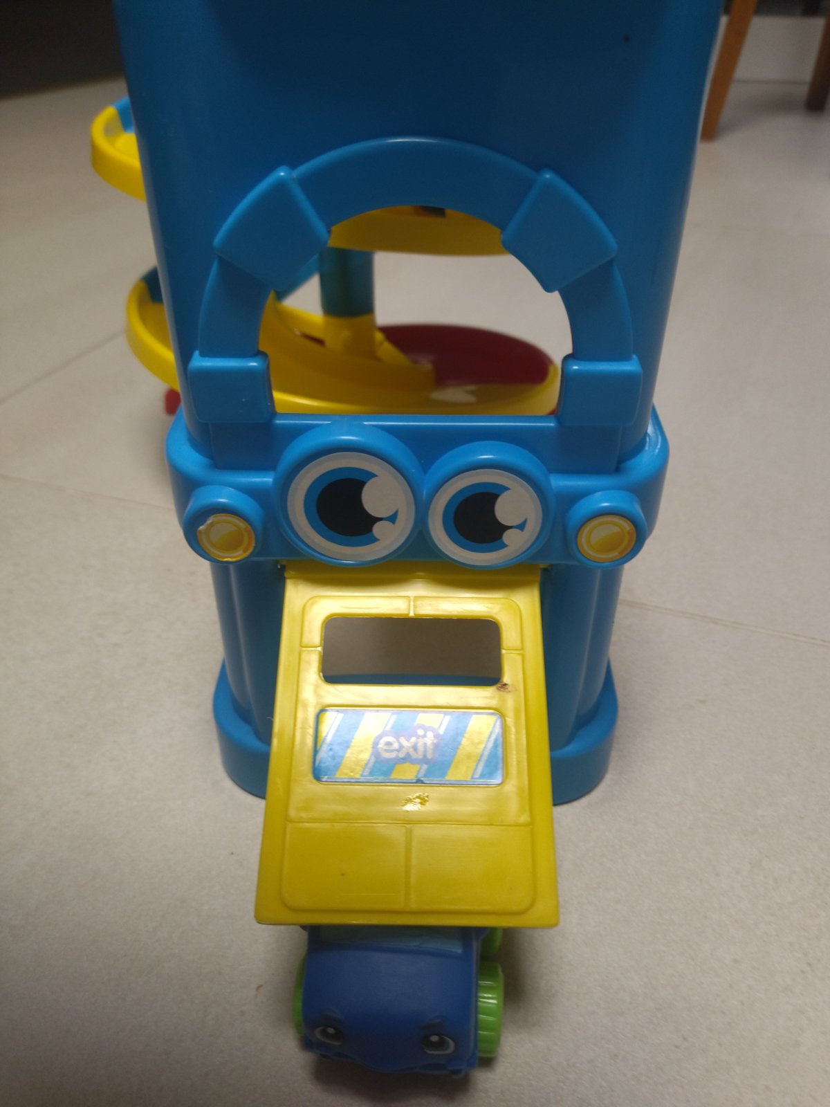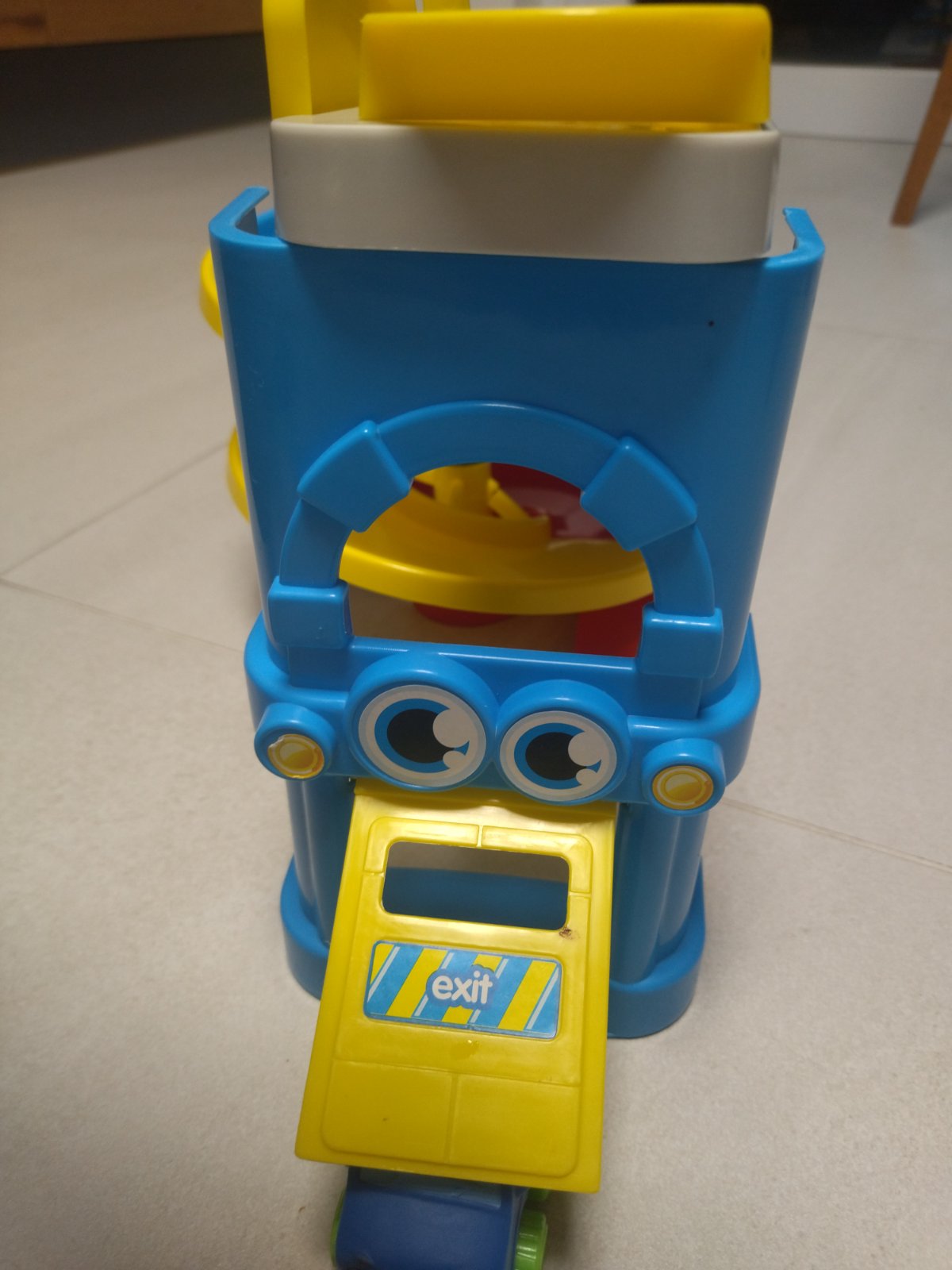 Predám jednoduchú autodráhu - garáž so špirálovou cestou. Výjazd z garaze má otváracie/pohyblivé dvierka. S dvoma autíčkami.