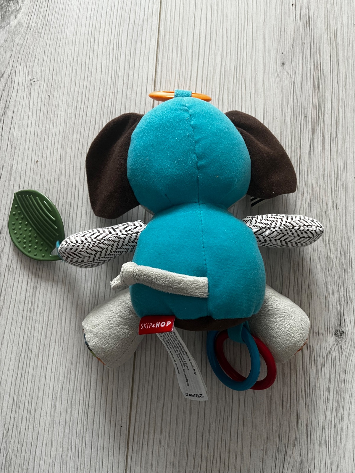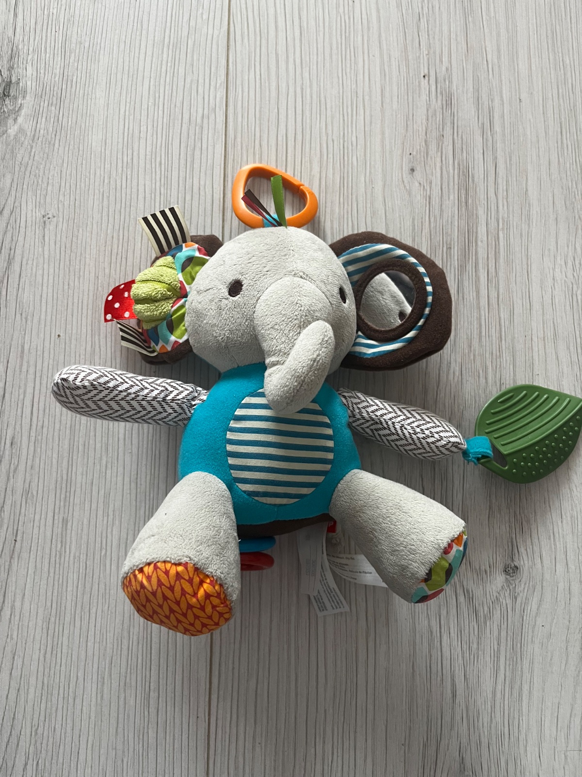Krásny slon s praktickým úchytom na kočík, ktorému šuštia ušká a nožičky, jedno uško po stlačení píska. V jednej ručičke drží hryzátko v tvare lístka. U nožičky má dva farebné krúžky a okolo krku hryzátko v tvare šatke. Celá hračka vydáva krásny zvuk ako rolnička, keď sa ju zatrasie.