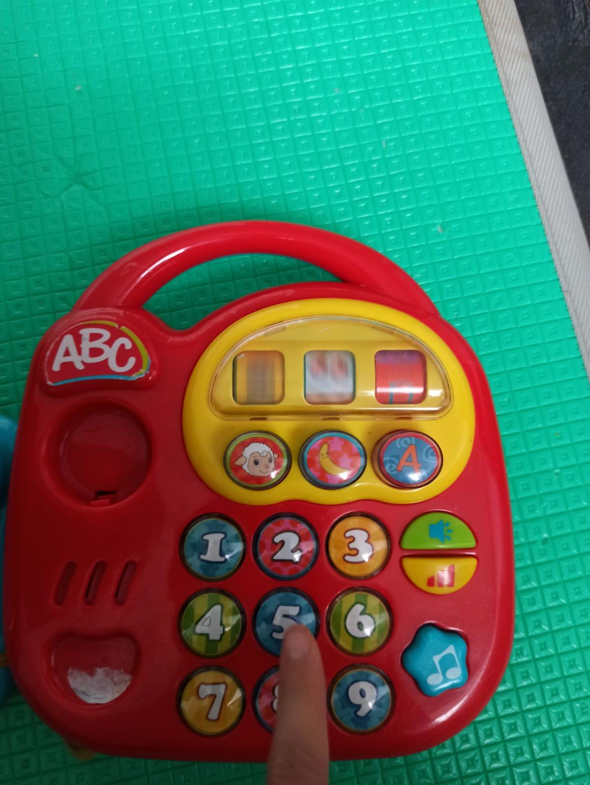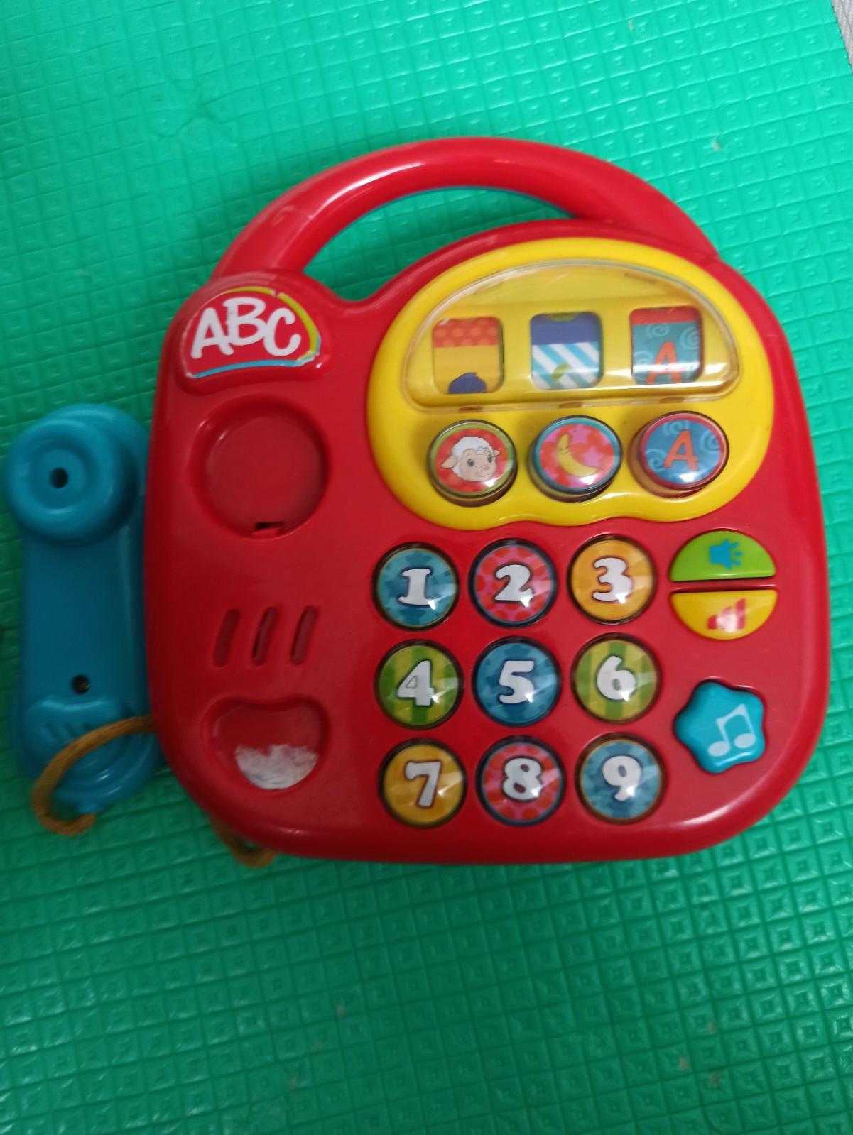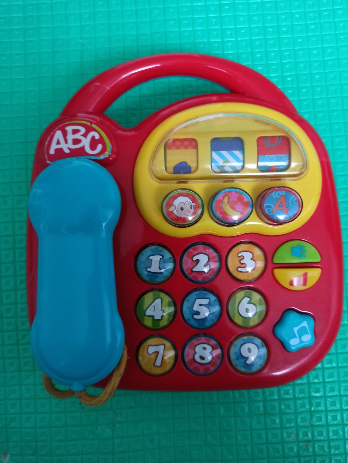Farebný baby telefón so slúchadlom vydáva rôzne zvuky a po stlačení tlačidla sa na „displeji“ točením zmení náhodne obrázok. 3 tlačidlá pre zmenu písmená, ovocia a zvieratiek. Zvuk pri stlačení jednotlivých číslic, zvuk vytáčanie tel. čísla, hrá aj niekoľko melódií. Hraný, bez poškodenia. Pôvodna cena 15,99€.