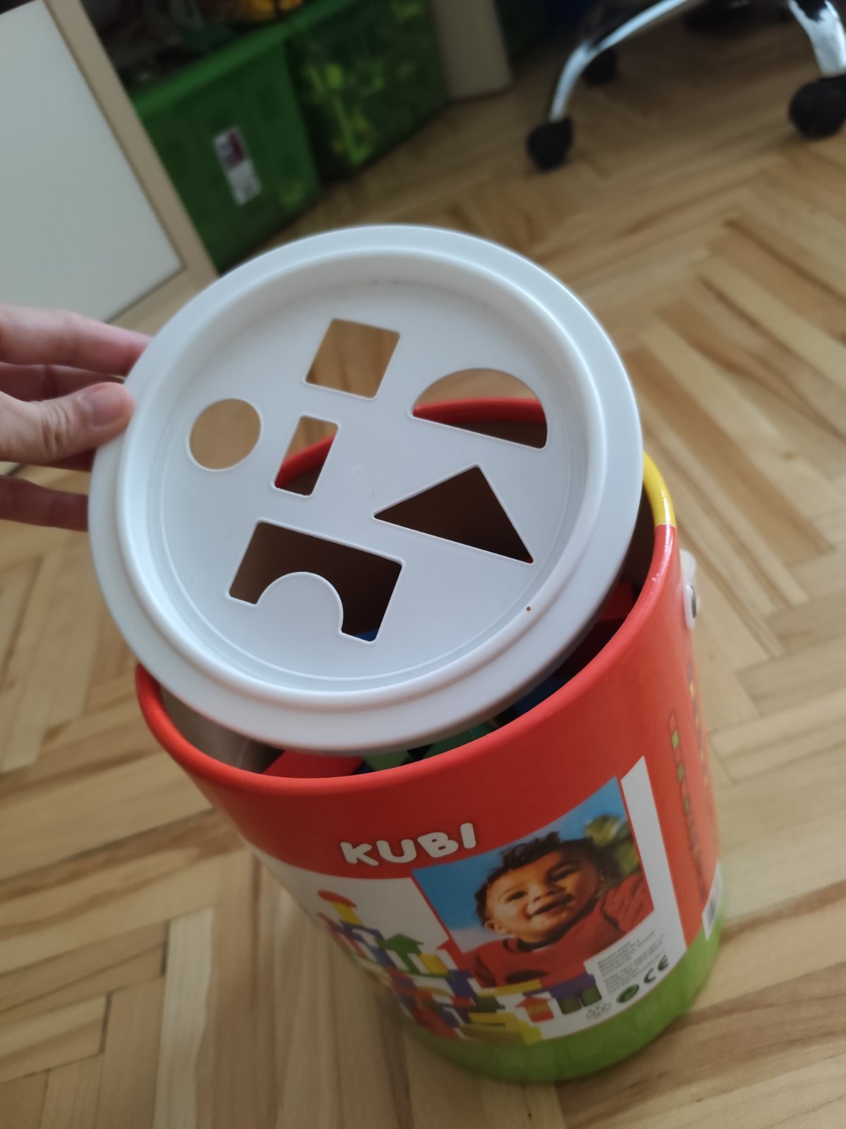 Drevená stavebnica pre deti od 18 mesiacov, z kociek sa dá staviate, alebo ich podľa vzoru vkladať do vedierka. Vedierko je z pevného kartónu, spodok sa odlepiť (odfotené) ale drží tam váhou kociek. Na niektorých kockách občas fliacik, pri kúpe tam bolo 100 kusov, mám 98. Ak ešte nejaké nájdem prihodíme. Cena 13 eur už vrátane poštovného. Pri osobnom odbere 8 eur