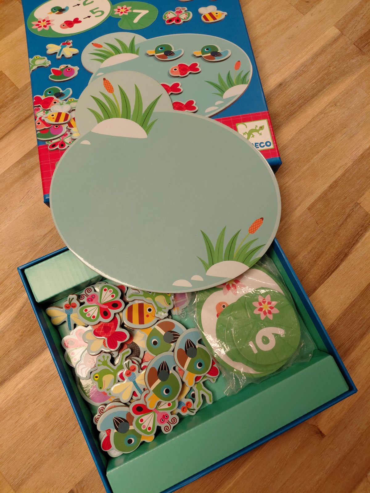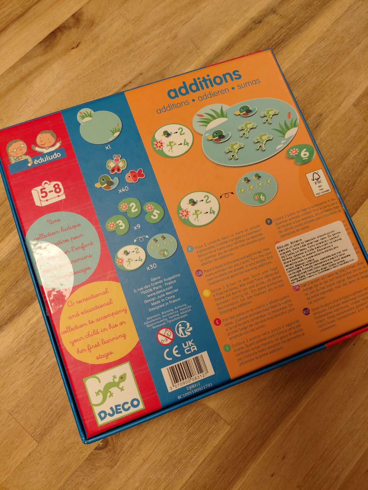 Veselá počítacia hra z radu Eduludo od francúzskeho Djeco (pôvodný názov: Eduludo Additions) pre jedného dospelého a jedno dieťa od 4 do 8 rokov. Deti zábavnou formou pochopia jednoduché sčítanie do 10. Najskôr si na základnú dosku položia správny počet zvieratiek, napríklad dve rybičky a 4 kačky. Potom musia správne spočítať počet zvieratiek a nájsť zodpovedajúce číslo na leknovej karte. Balenie obsahuje herný plán, 30 + 9 kariet, 40 žetónov a návod.