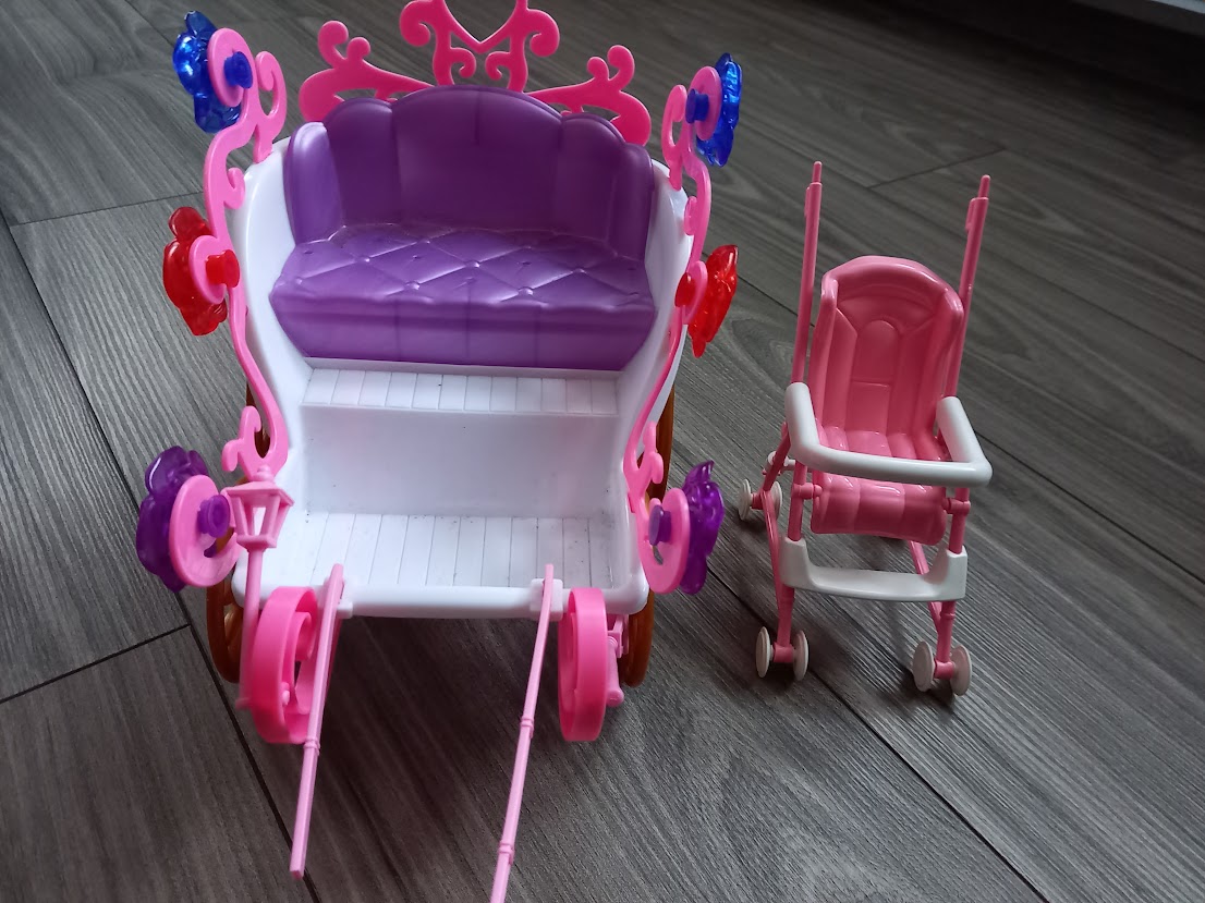 Kočíky-2 kusy, sem-tam už niečo na nich chýba. Veľký kočík má výšku 21 cm -meraný obrázok vzadu,po boku kde je sedadlo je výška 19 cm. Malý kočík má výšku 12,5 cm.Cena 2 € za obidva+poštovné.