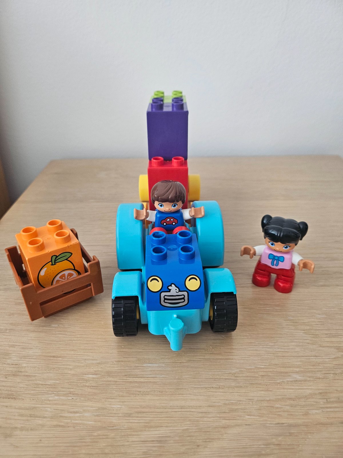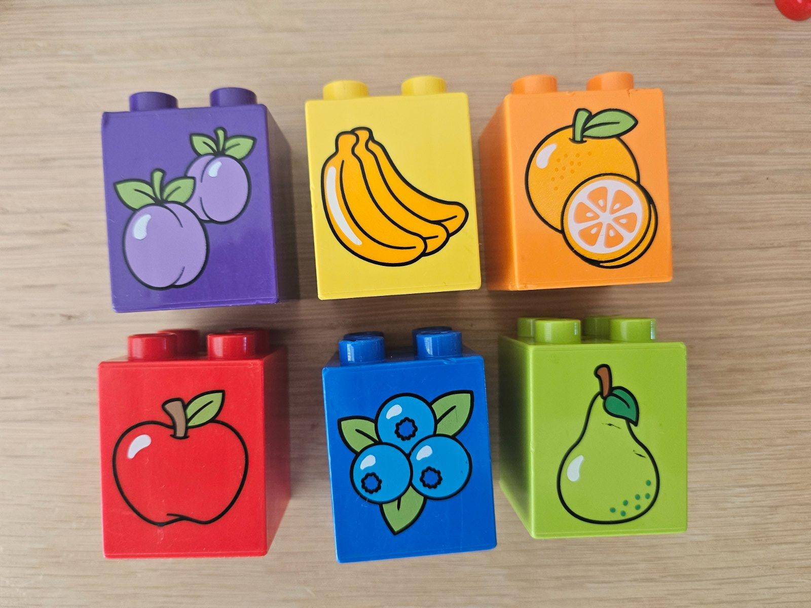 Hrane lego duplo, na niektorych kockach s ovocim vidno pouzivanie, pozri fotky. Traktor, vlecka aj figurky bez poskodeni.