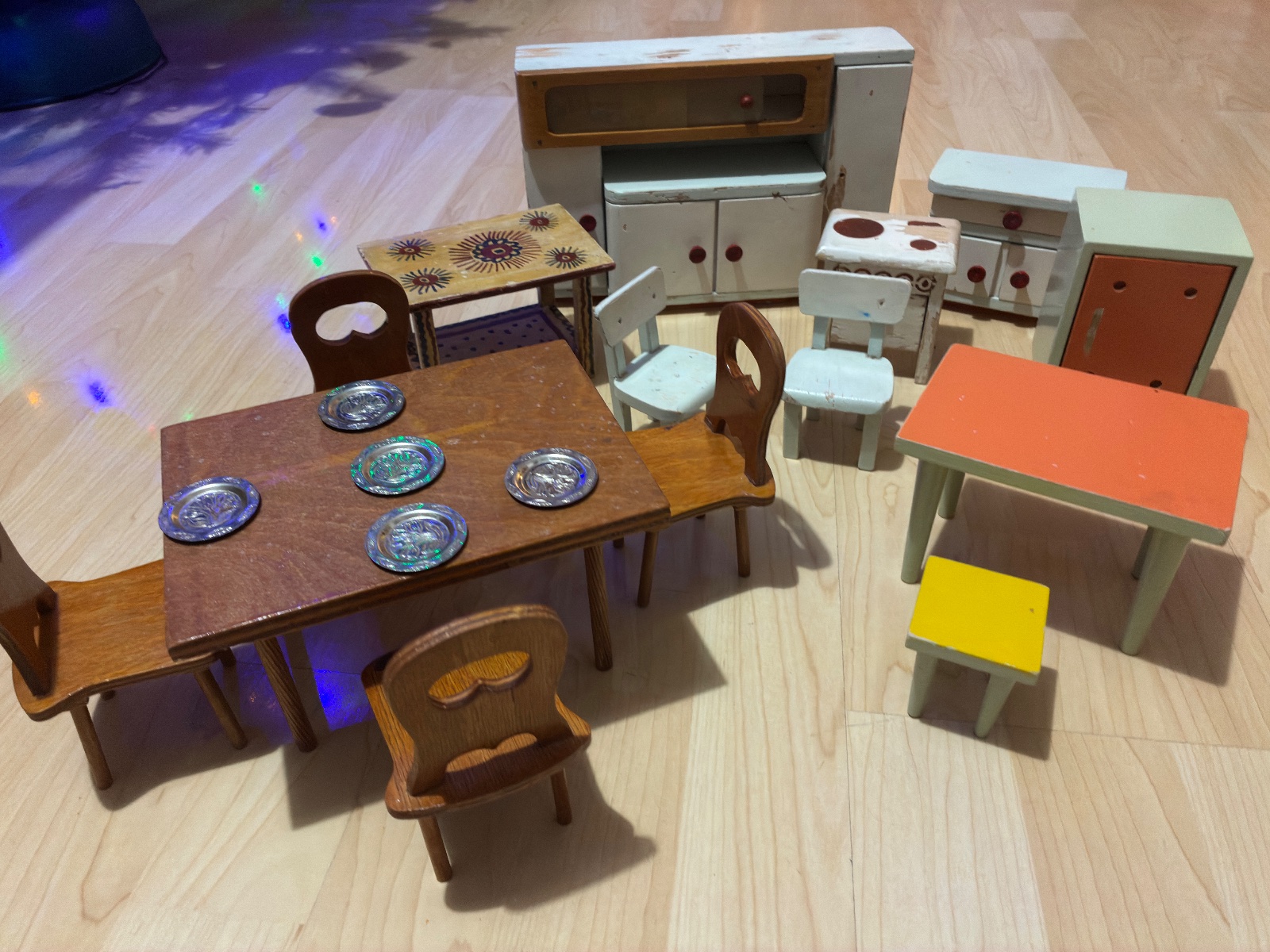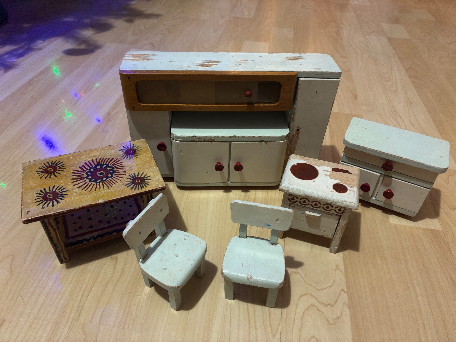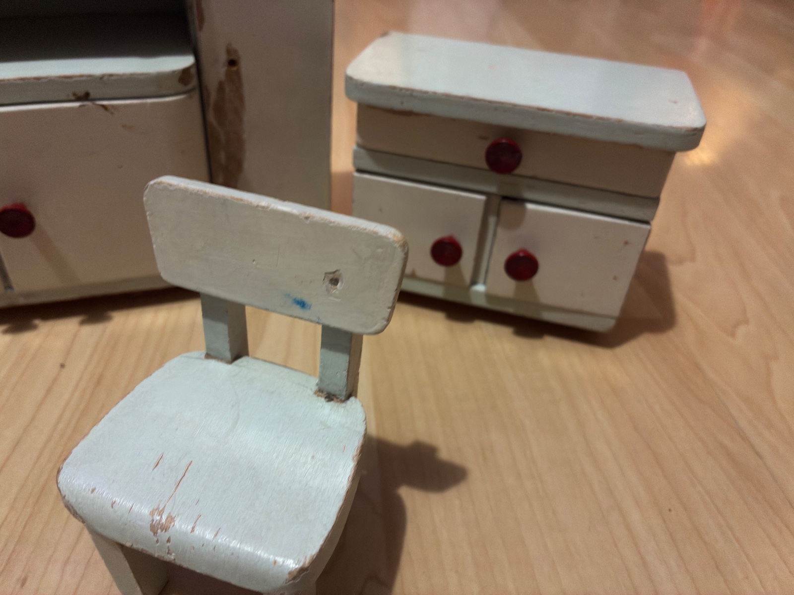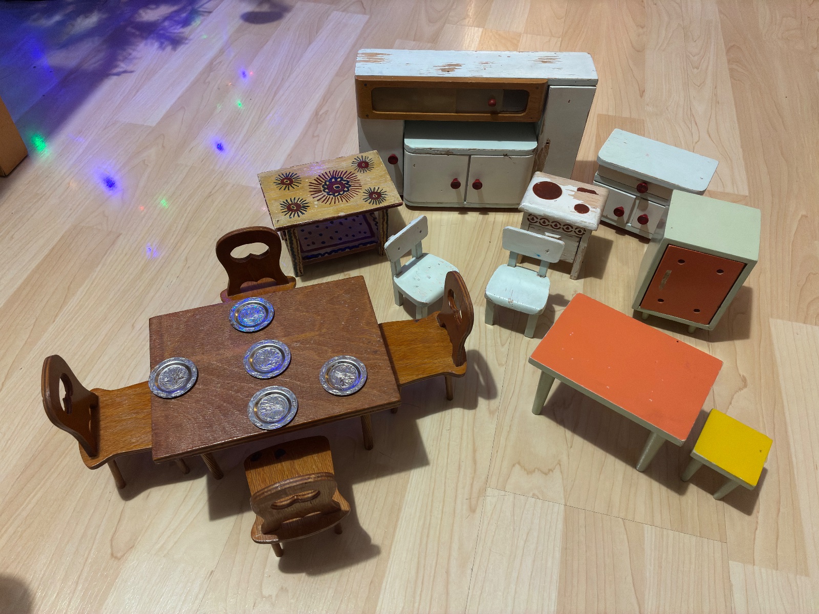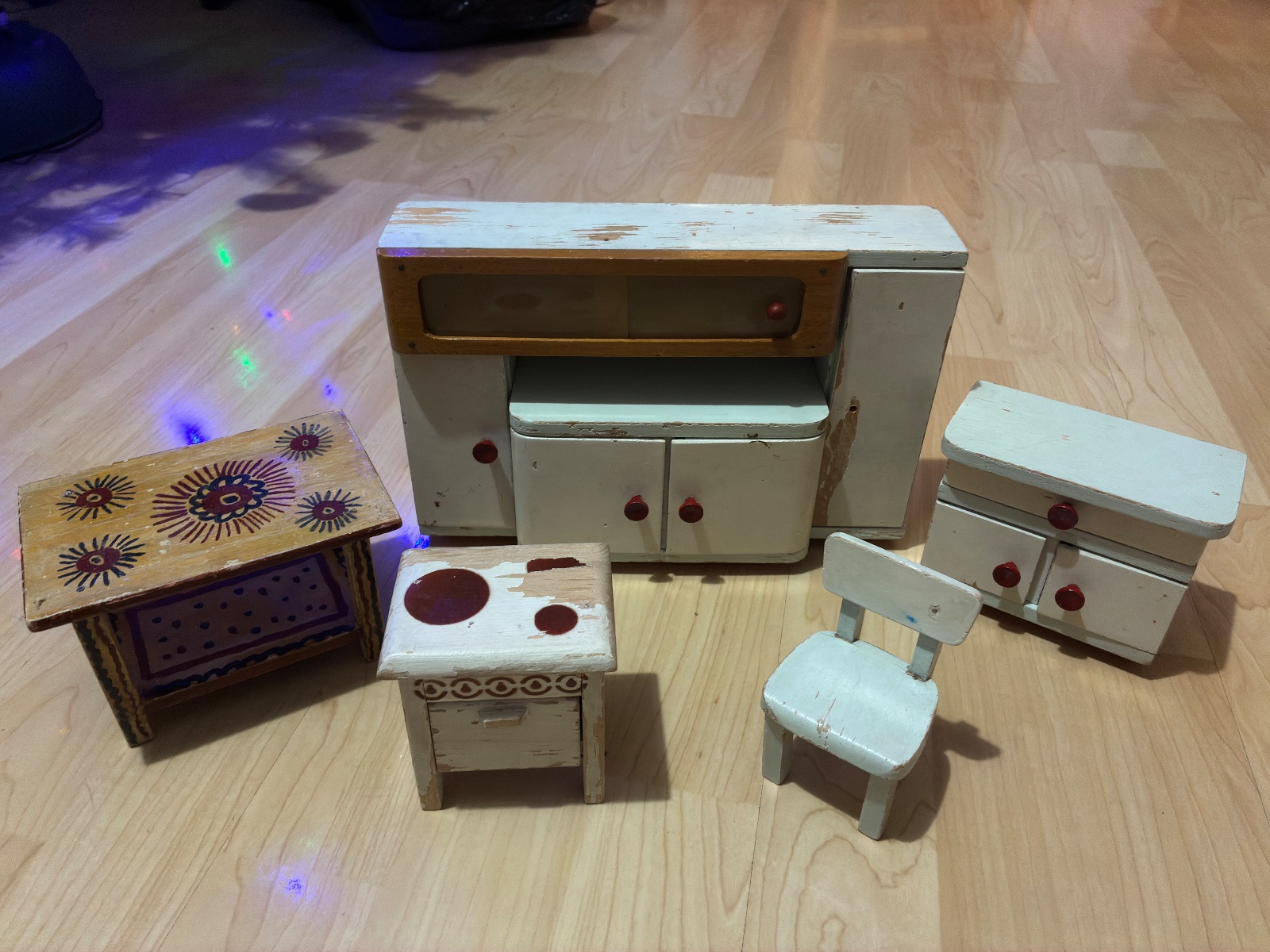 Niektoré veľmi staré kusky, nutne opravit, chýbajú drziaky na otvaranie skriniek a "skla" na kredenci. opadava farba, vidiet na fotkach. Niektore novsie kusky, este celkom pekný stav. Tmavohnedy stôl so stolickami je ručná vyroba. Na jednej stolicke lepene 2 nohy, ale funkcne.