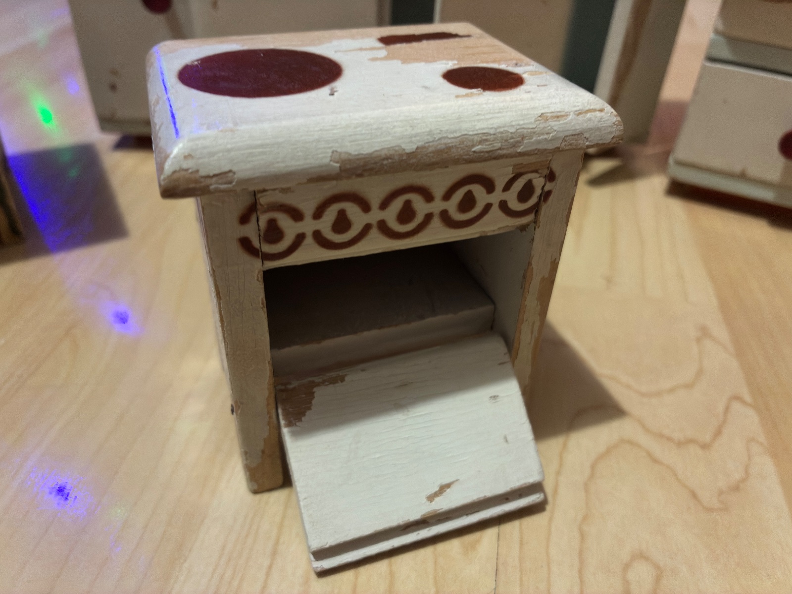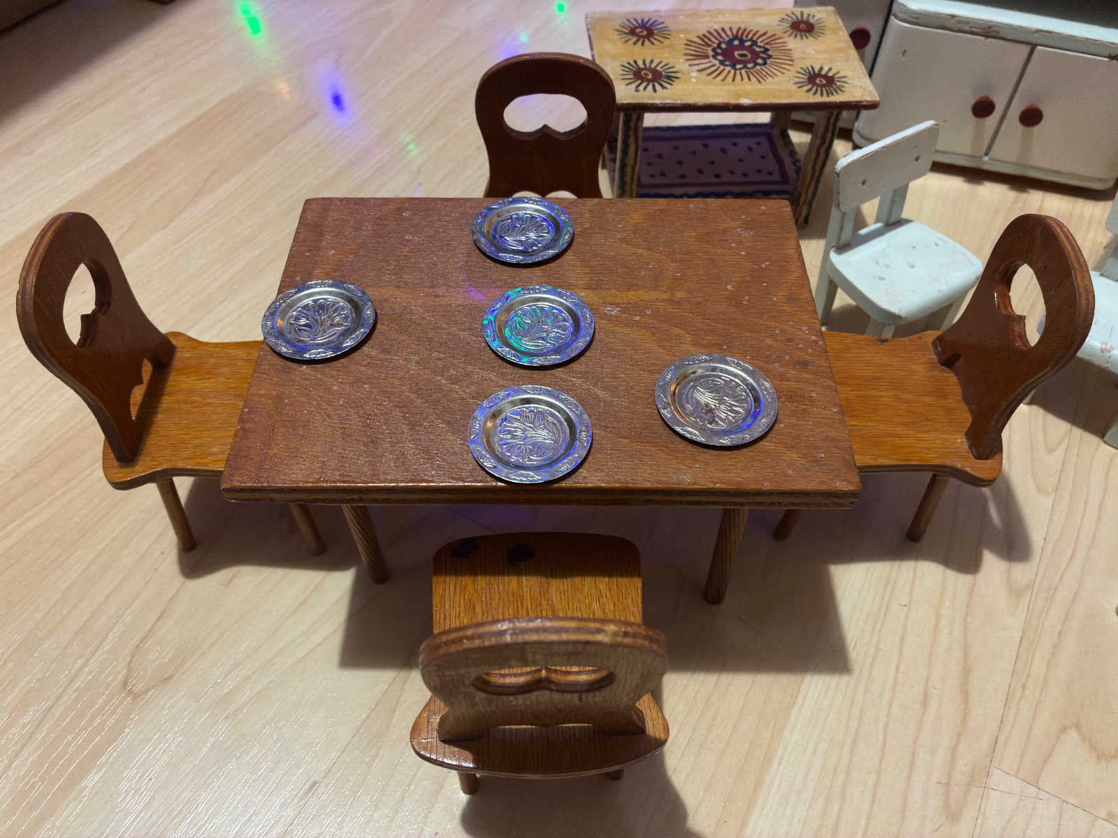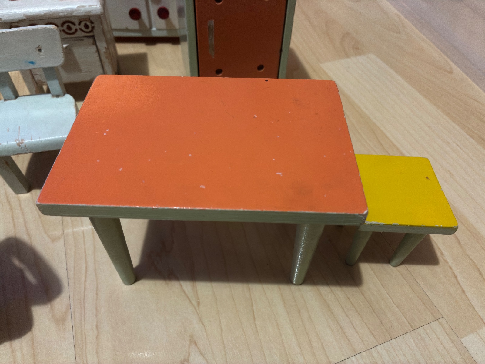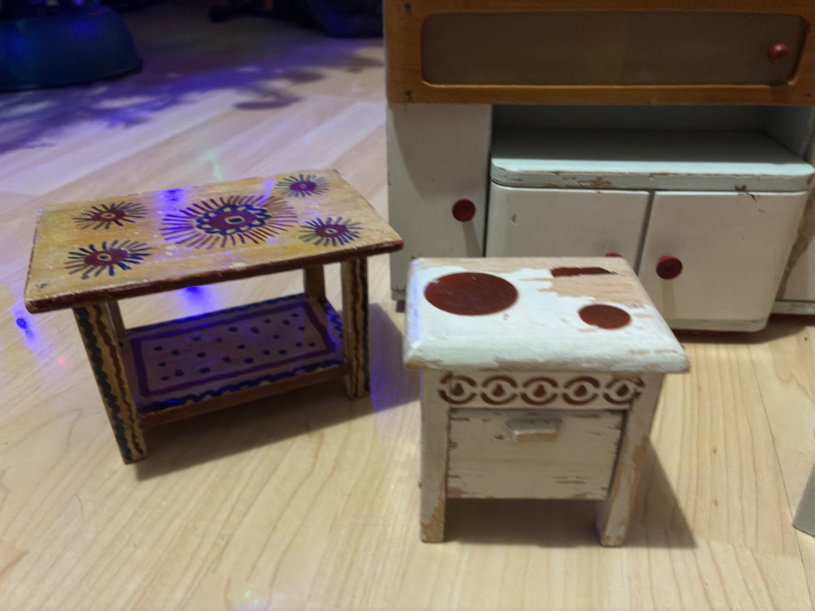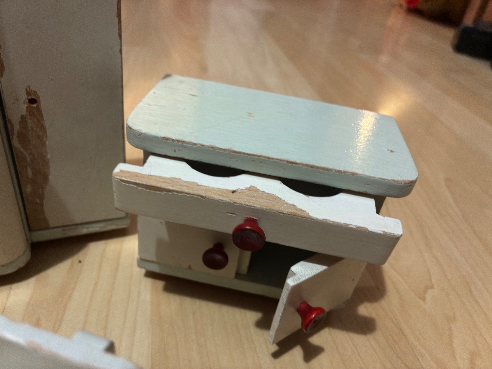 Niektoré veľmi staré kusky, nutne opravit, chýbajú drziaky na otvaranie skriniek a "skla" na kredenci. opadava farba, vidiet na fotkach. Niektore novsie kusky, este celkom pekný stav. Tmavohnedy stôl so stolickami je ručná vyroba. Na jednej stolicke lepene 2 nohy, ale funkcne.
