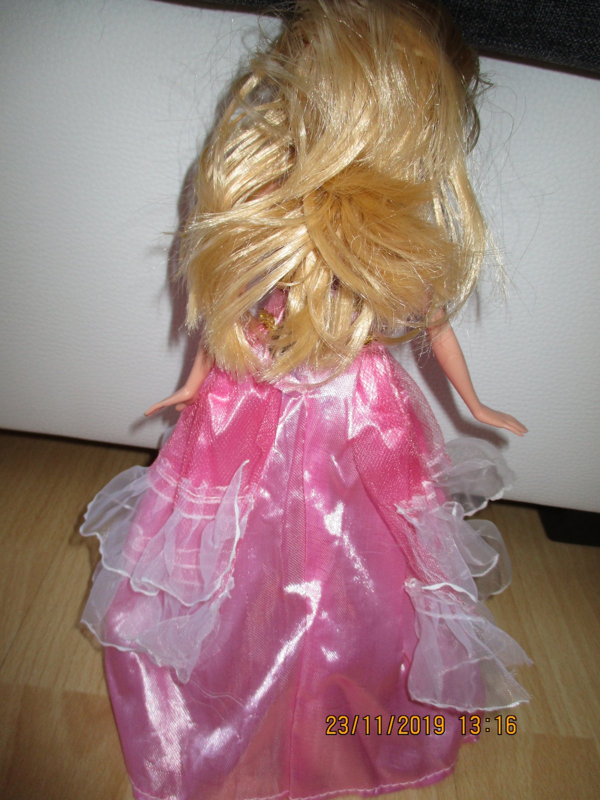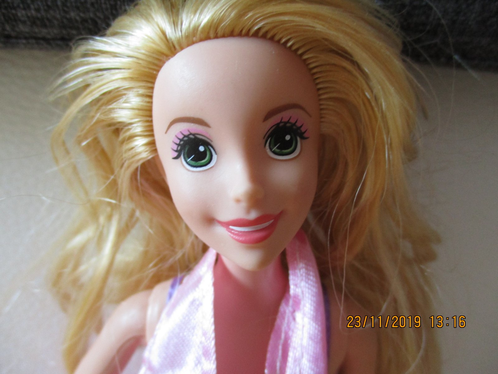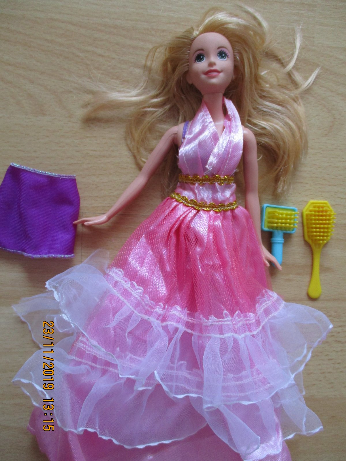 Predám peknú bábiku- princezná na vlásku. Originál bola iba v plavkách a na nich mala fialovú zavinovačku. Ja som jej pridala spoločenské šaty ( tie sú zdarma pre kupujúcu ) a hrebeň si môžte vybrať z tých dvoch. Cena je 4,50+ poštovné.