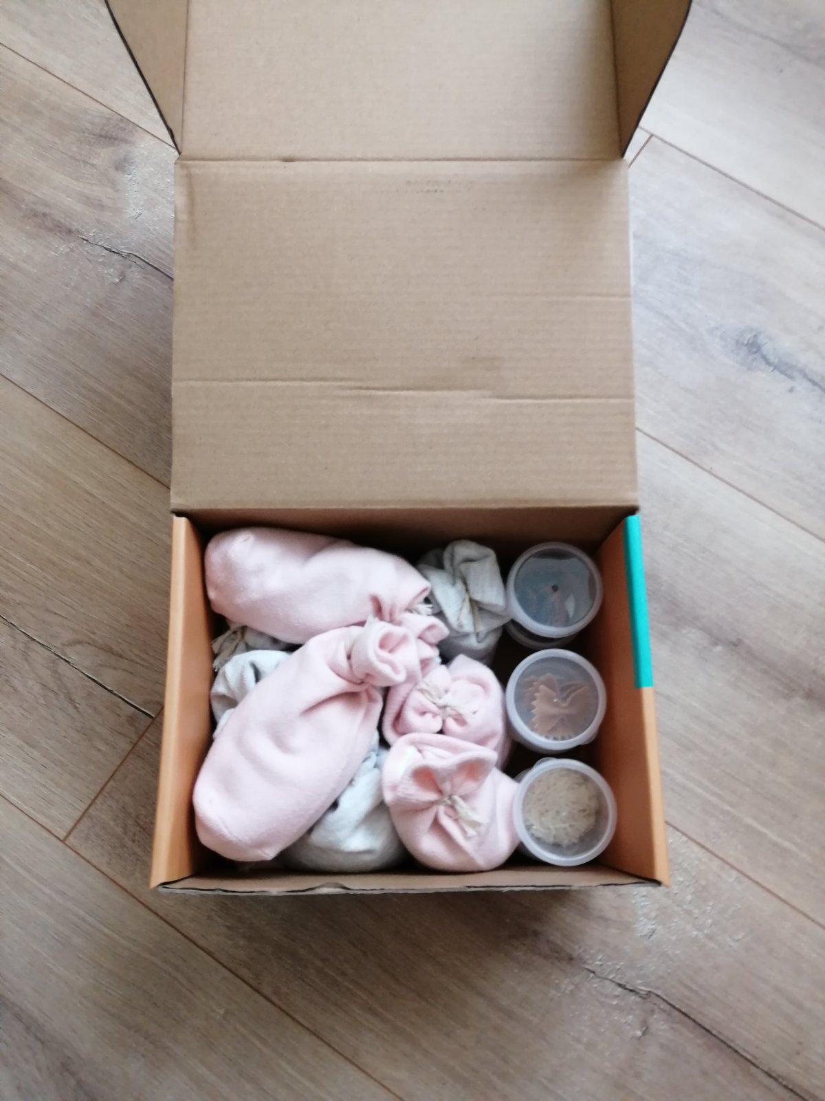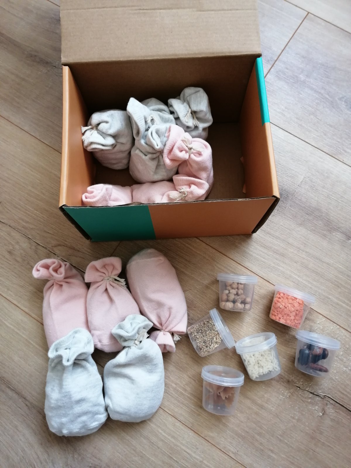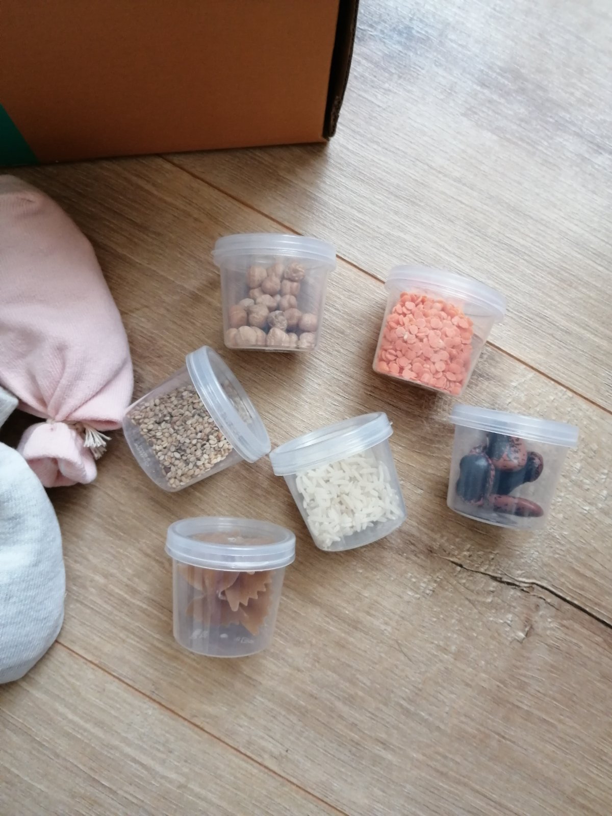 V kelímkoch sú vzory použitých materiálov, aby ich deti mohli aj vidieť a vyskúšať si ich.