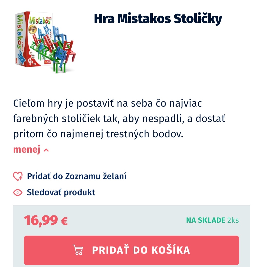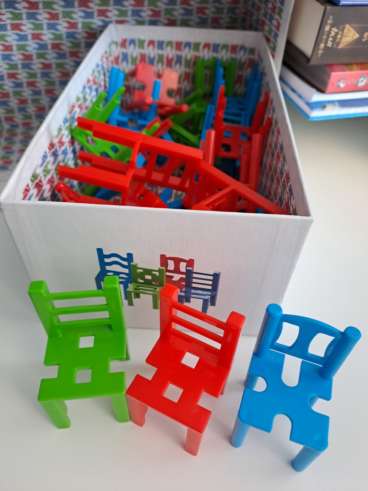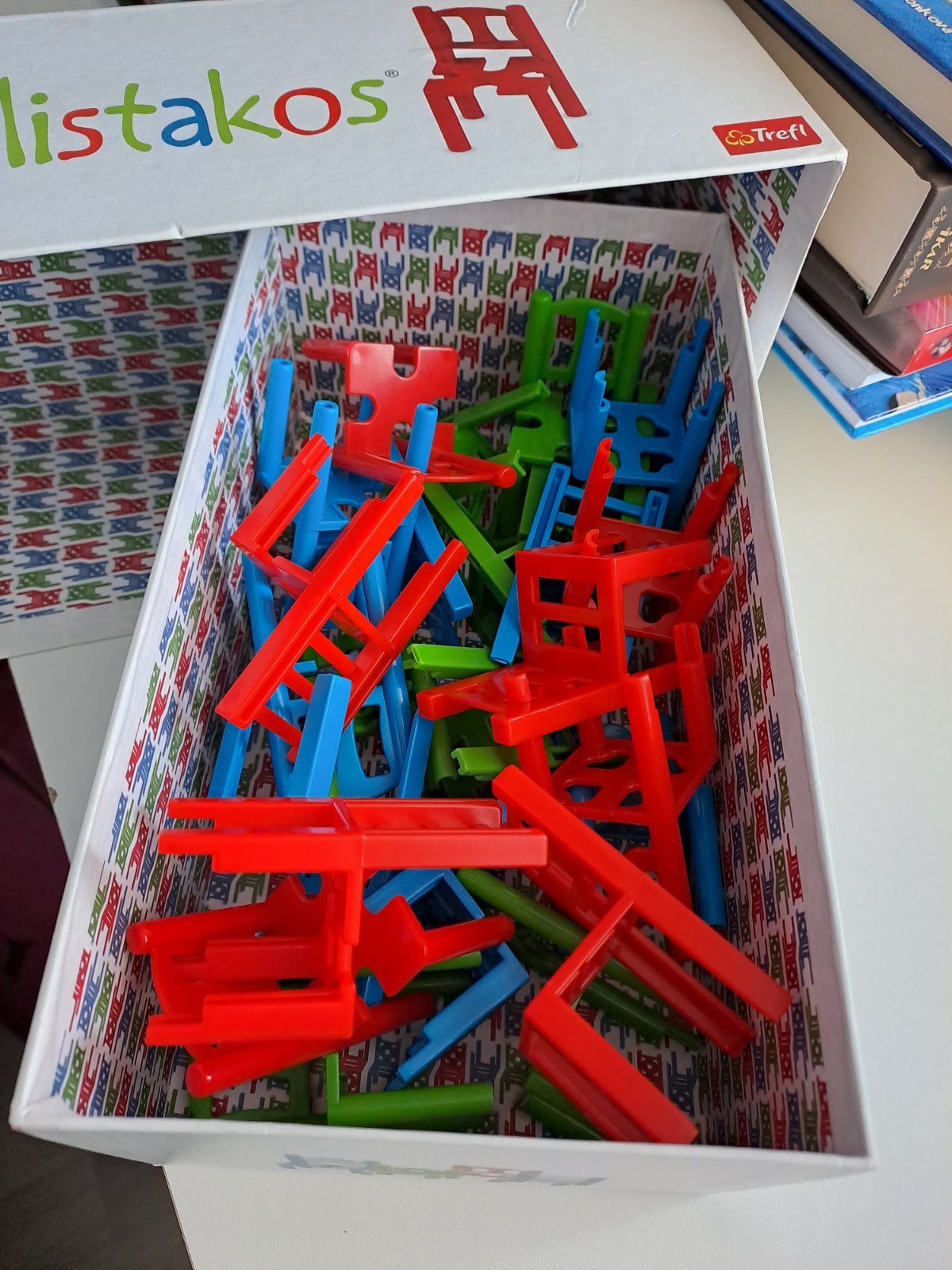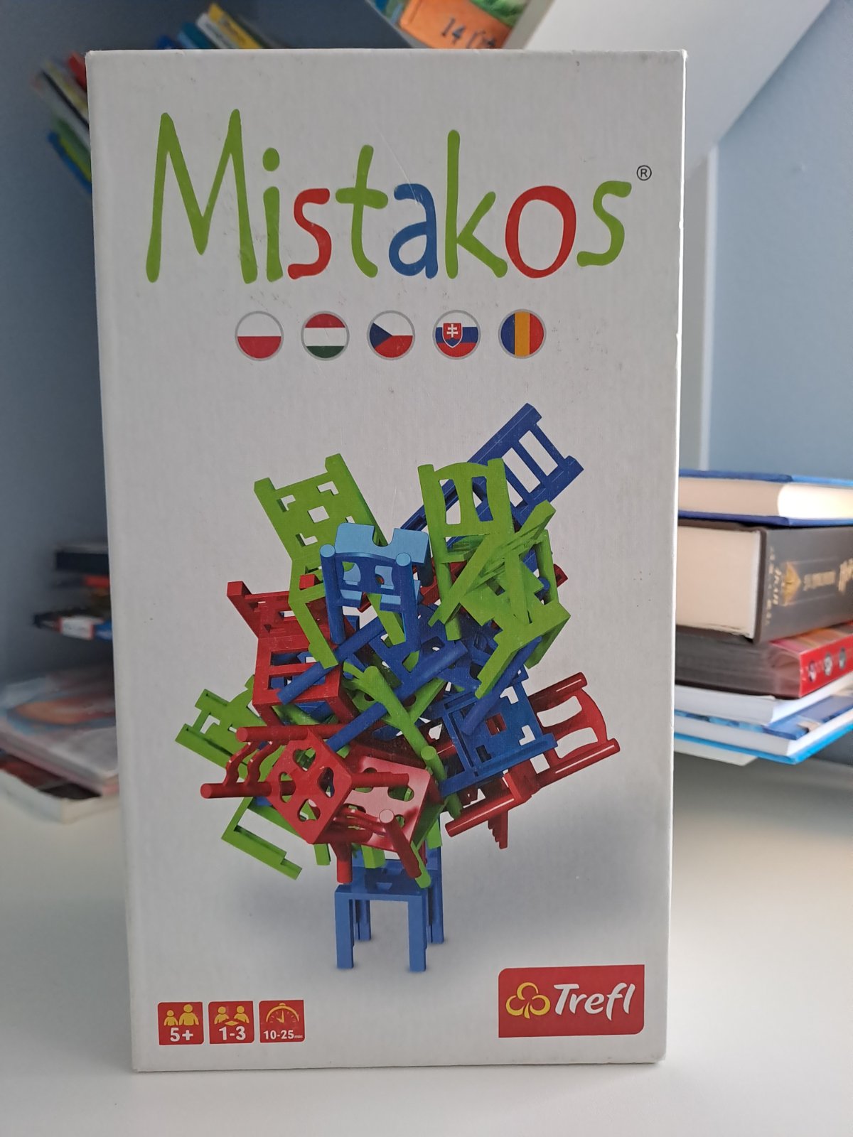 Spoločenská hra Mistakos so stoličkami. Cieľom hry je postaviť na seba čo najviac farebných stoličiek tak, aby nespadli, a dostať pritom čo najmenej trestných bodov. Super stav, komolet!