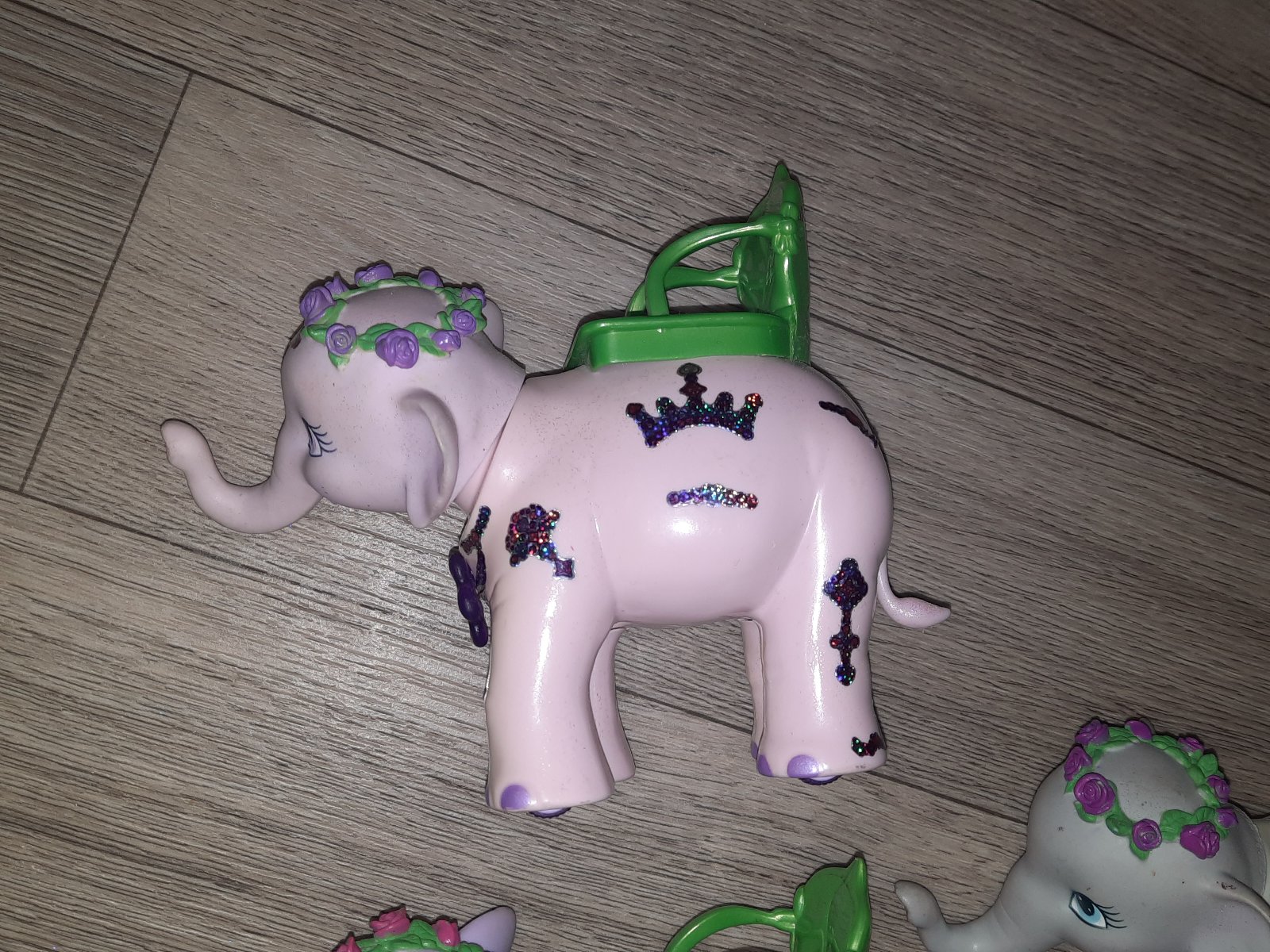 Kvetinky pod krkom sa dajú vysunúť a chobotmi sa spojiť, aby chodili spolu v jednom rade tak, ako naozajstné slony. Kvety je potrebné vytiahnuť a zasunúť ručne.