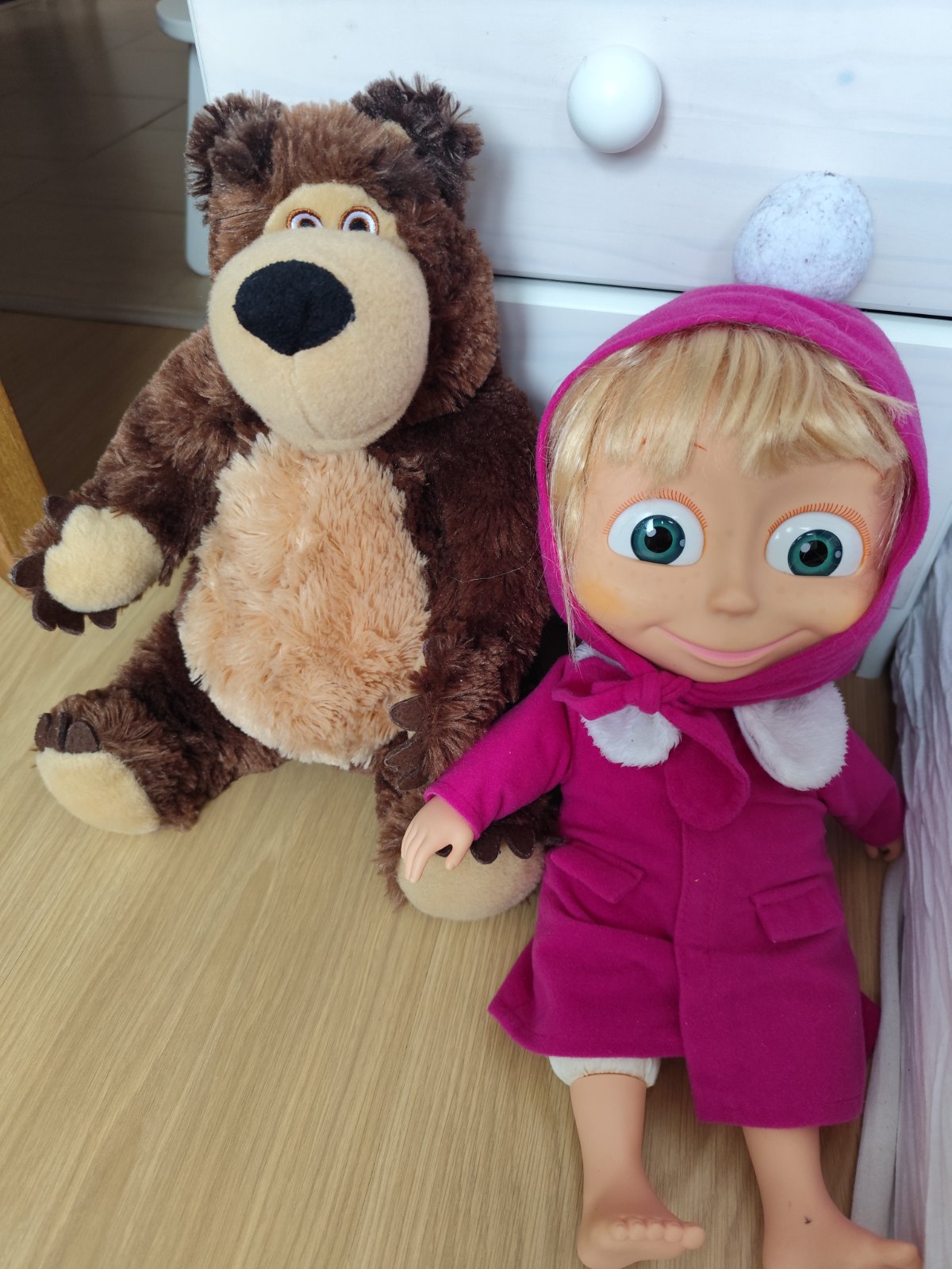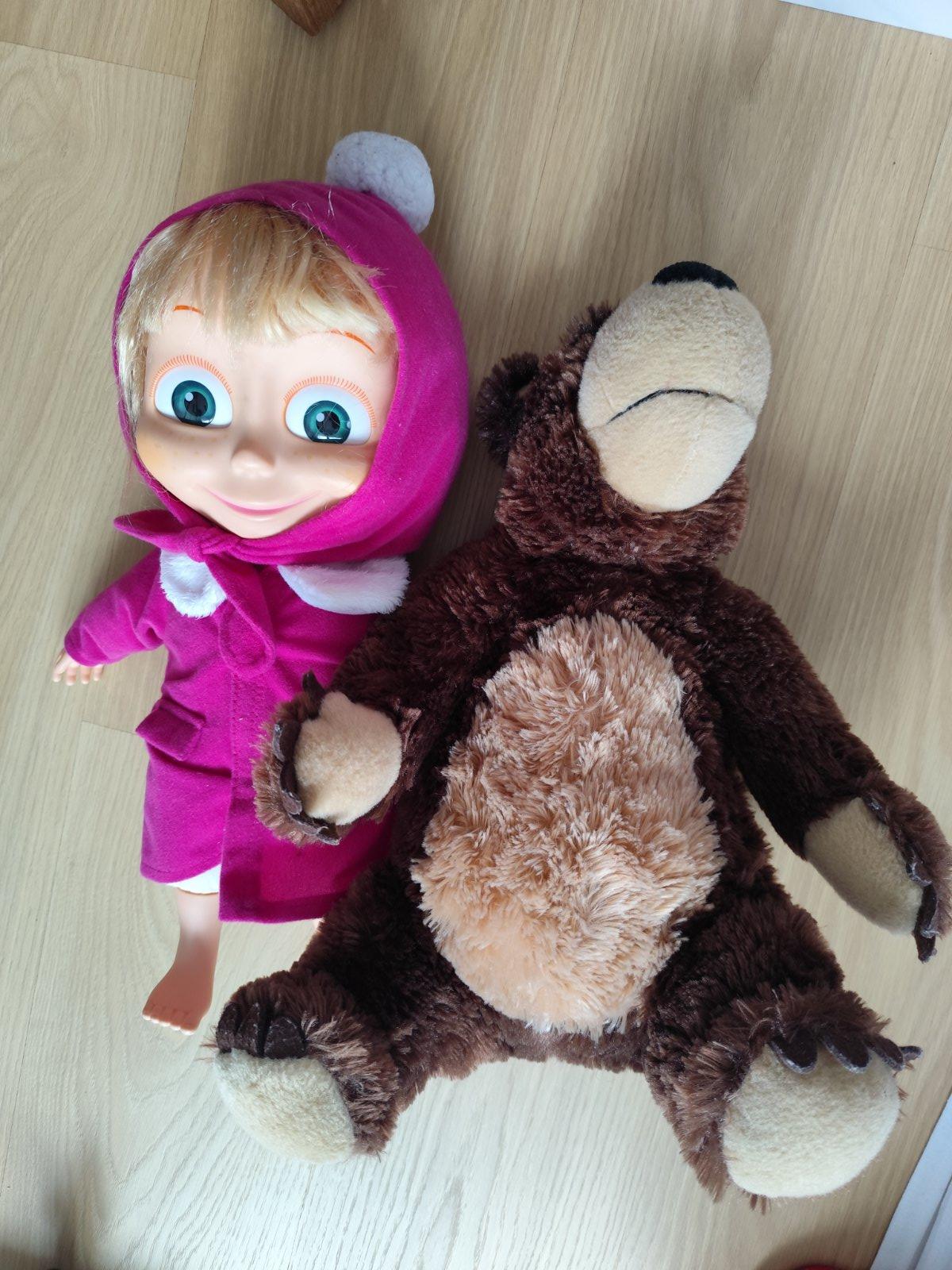 Bábika Máša (plastové telo) a plyšový medveď z rozprávky. Veľkosť cca 30 cm. Medveď v top stave, bábika Máša už nemá pekné vlasy, inak bez vád. Iba spolu. Cena za obe spolu