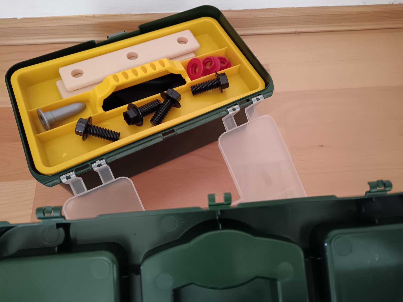 Není kompletný, stav ako na foto. Baterka svieti. Zeleny stredný uchyt zlomený, kufrík sa dá aj napriek tomu normálne zatvoriť. Cena prispôsobená stavu.