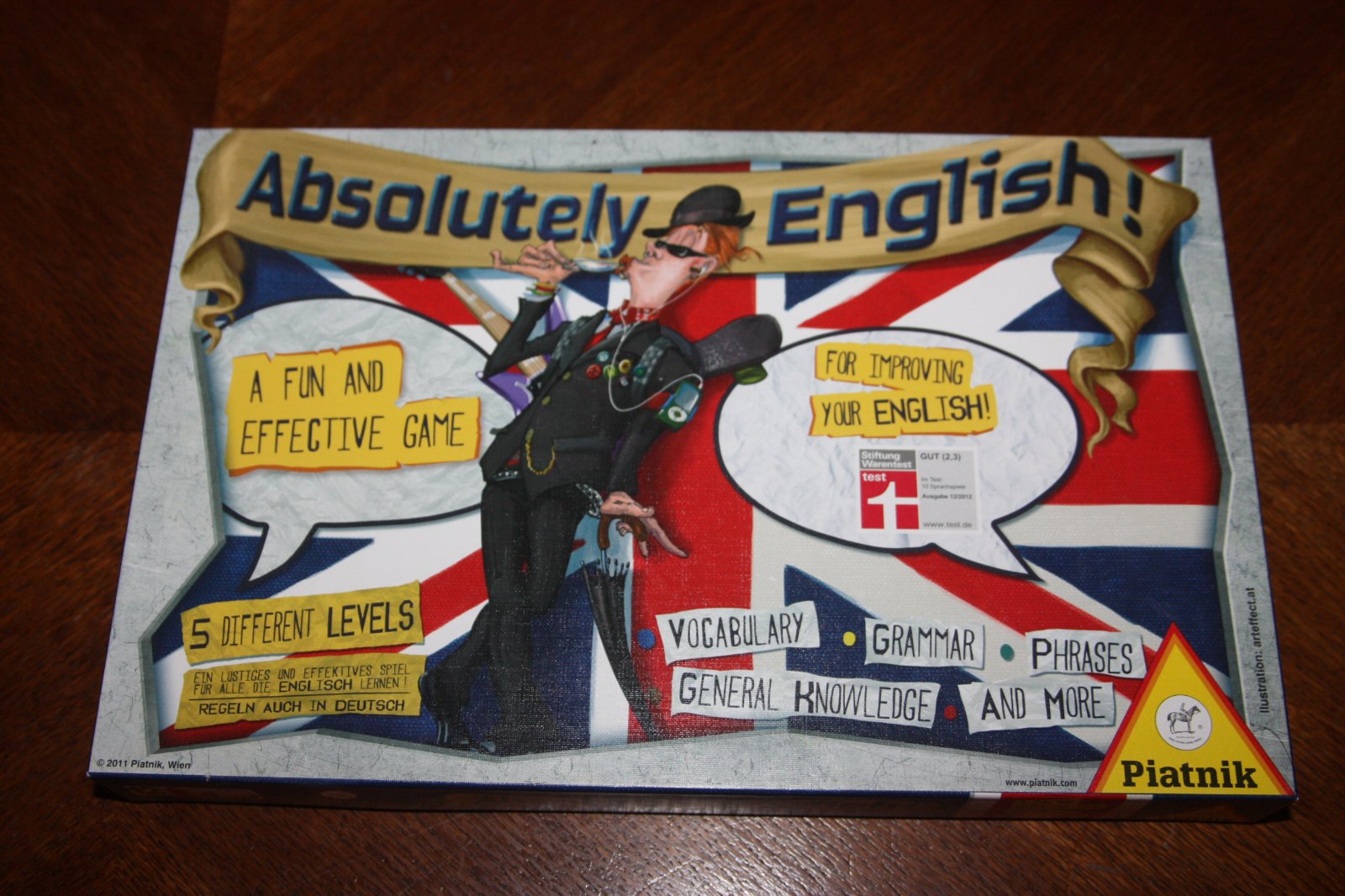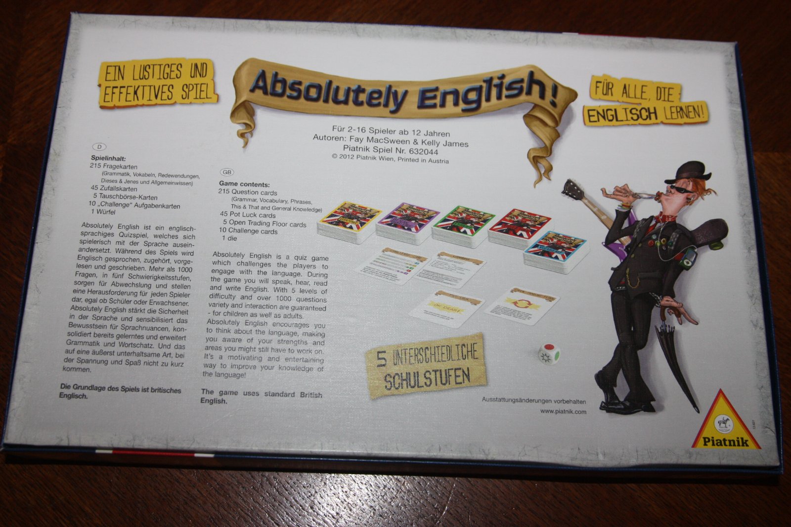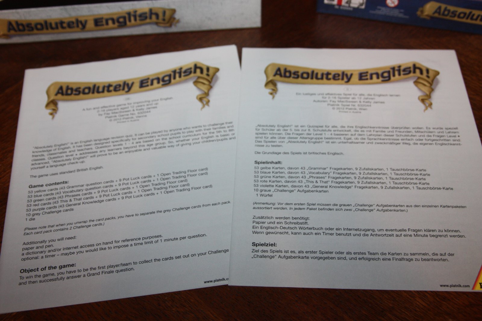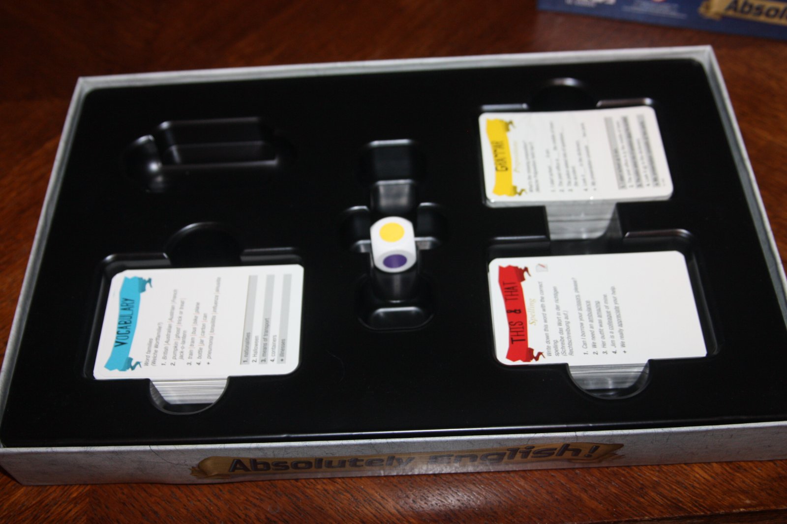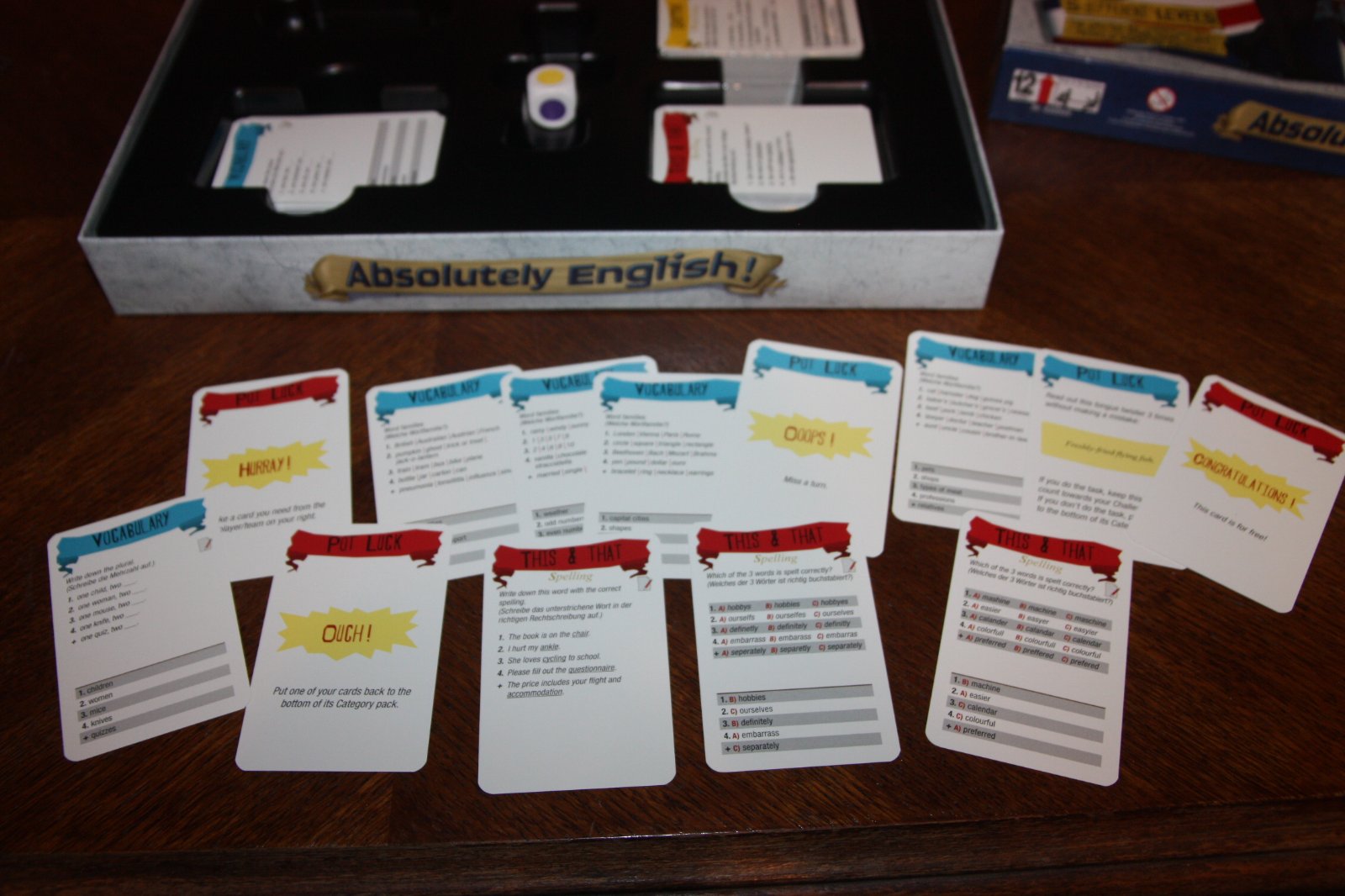 A die determines which category a question is asked from. It shows five colours or a star (let's the player decide if he/she wants a grammar or vocabulary question). If the player answers the question correctly, he/she wins the card. Cards are collected until one player is ready for the grand finale: The player who is first to answer correctly here wins the game.