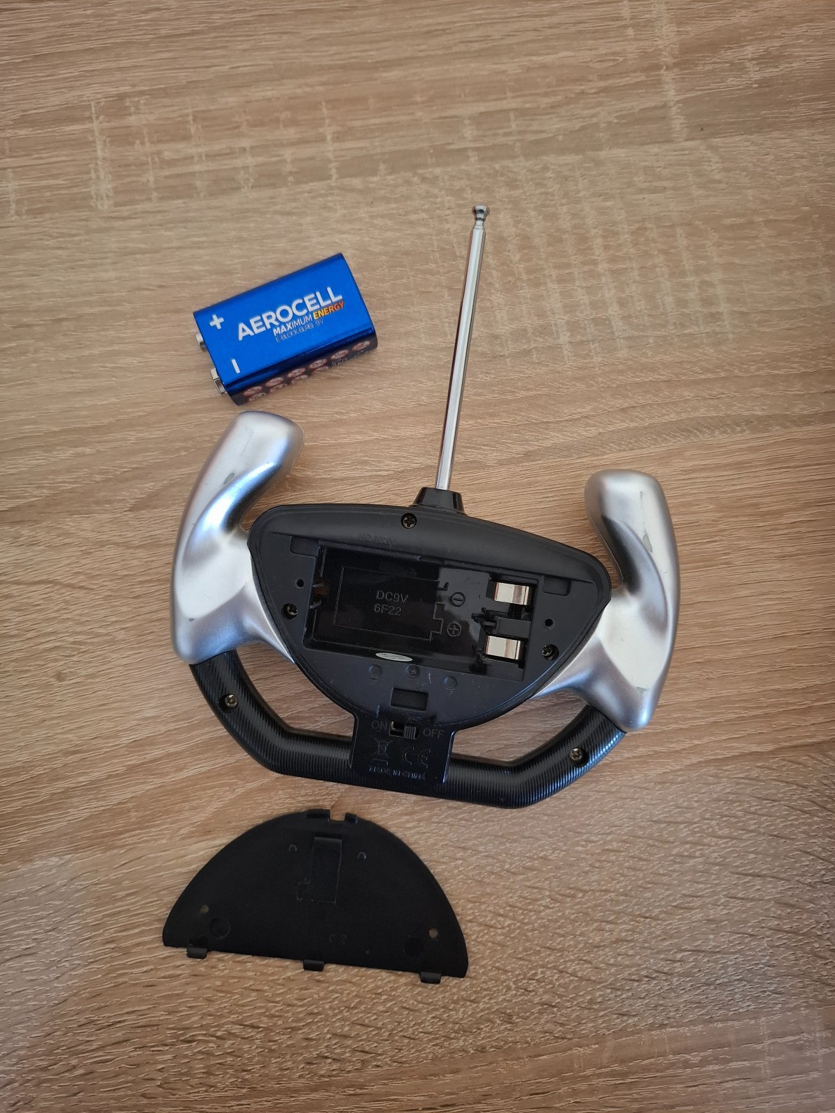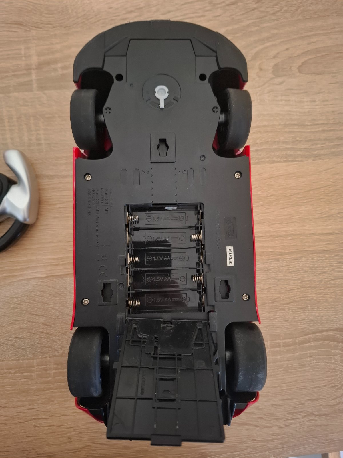 Do auta idu 5 krat AA=1.5V baterky a do ovladača 9 V baterka je na fotke.Keď auto ide do predu svietia svetla v predu na bielo,ked dozadu tak.svietia zadne svetla na červeno ide maximalne 13 km/h.Nove stoji 42 euro na alegre