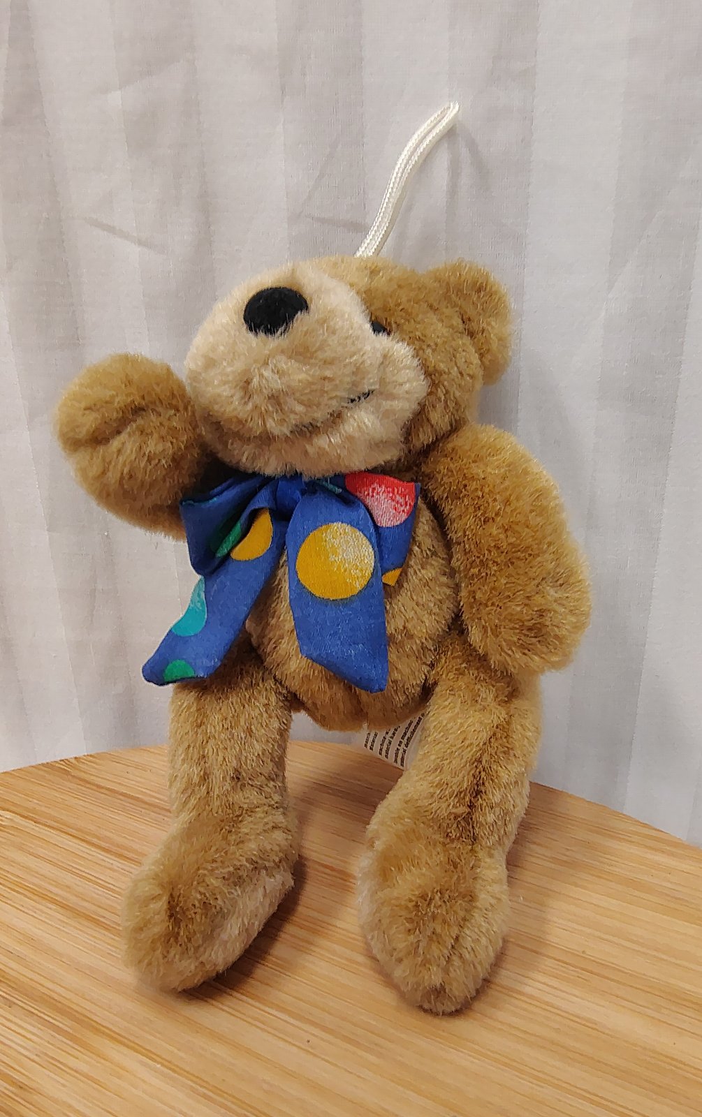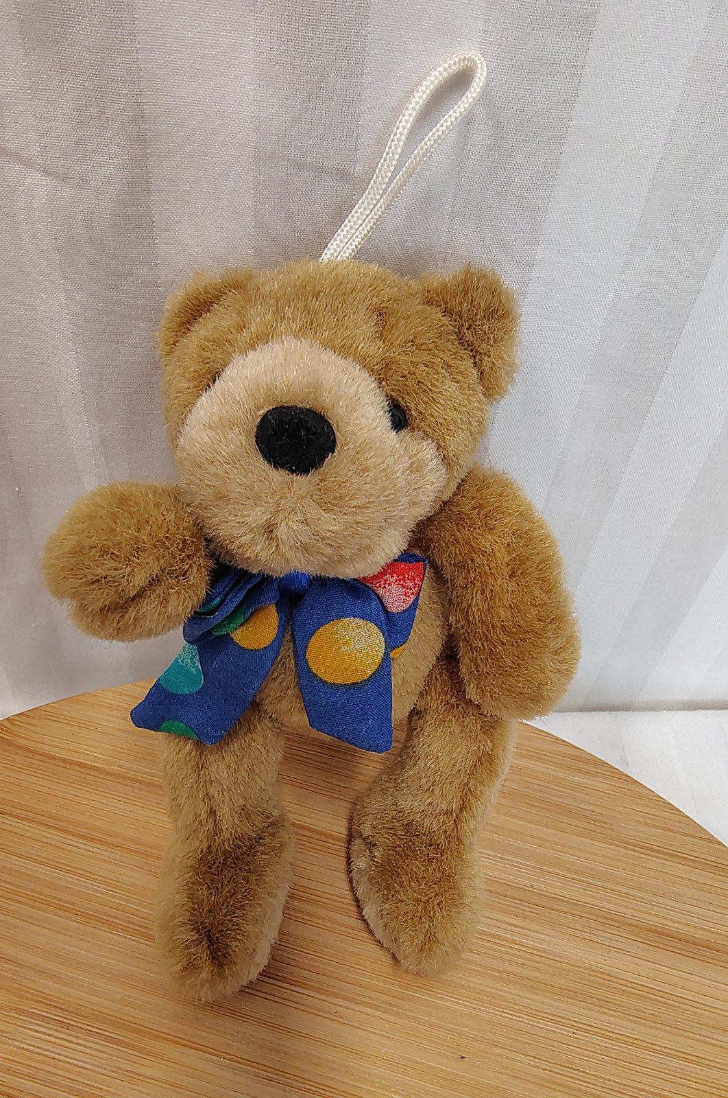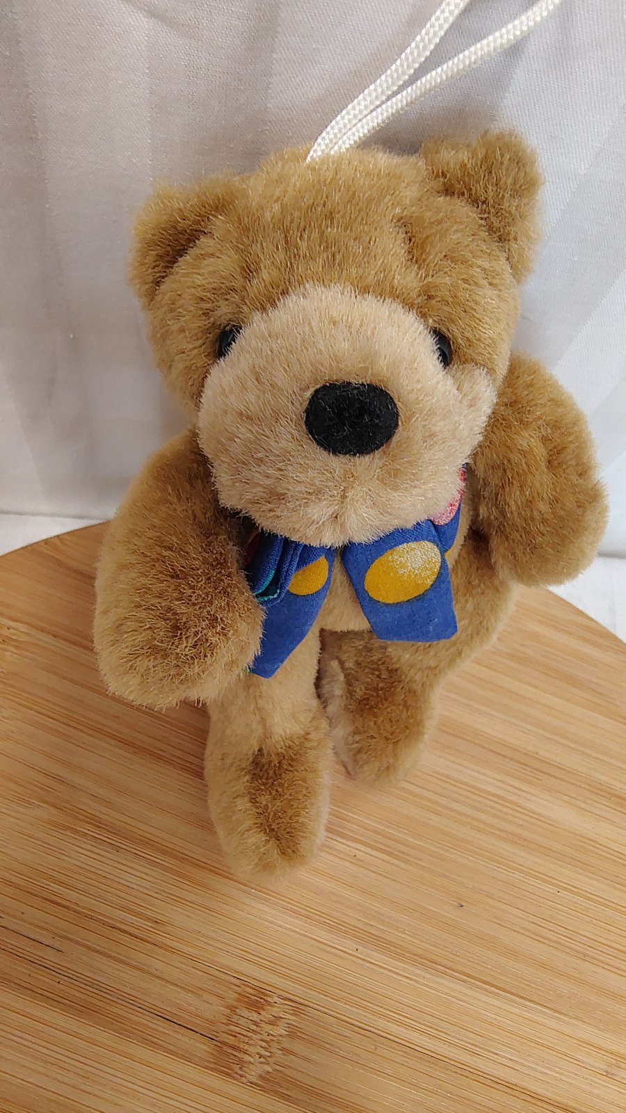 Plyšový hnedý medveď s mašlou, Bremen, 13 cm, sediaci, je svetlo hnedý, okolo krku má bodkovanú mašlu, na hlave putko na zavesenie, vyrobený z kvalitného jemného a mäkkého plyšového materiálu,