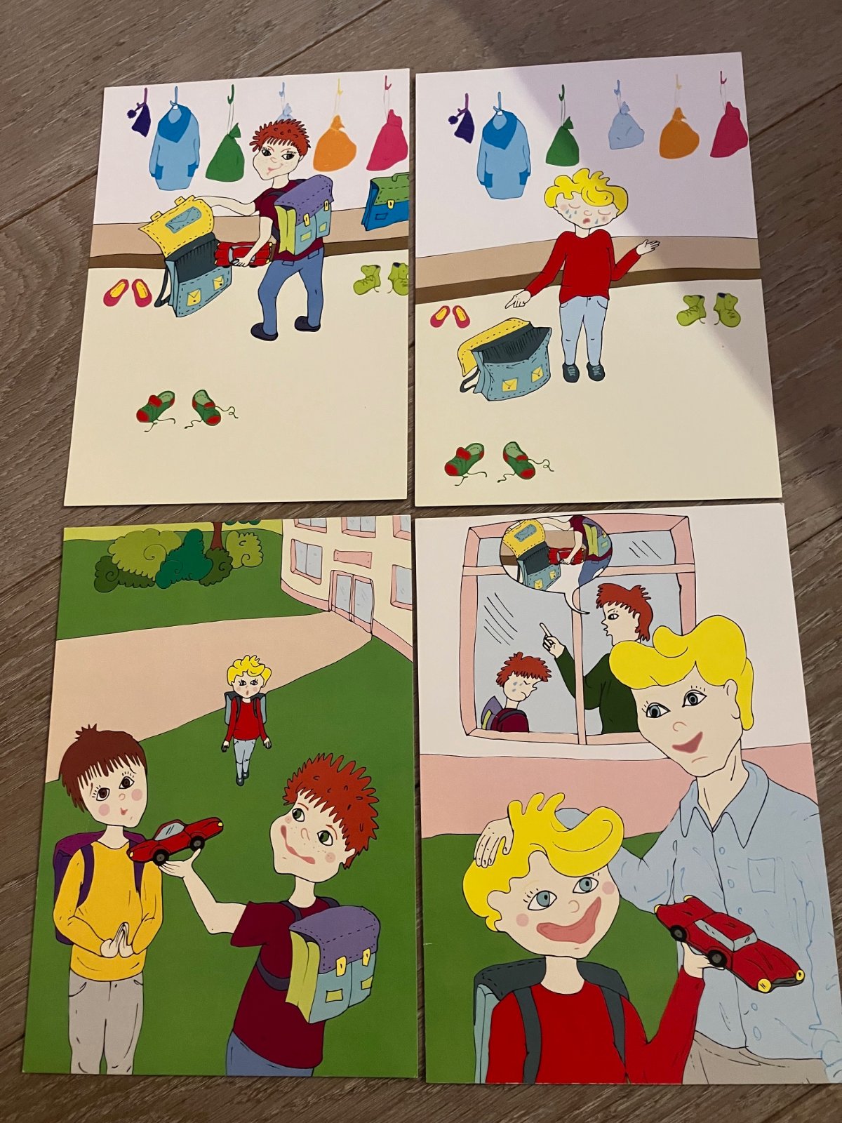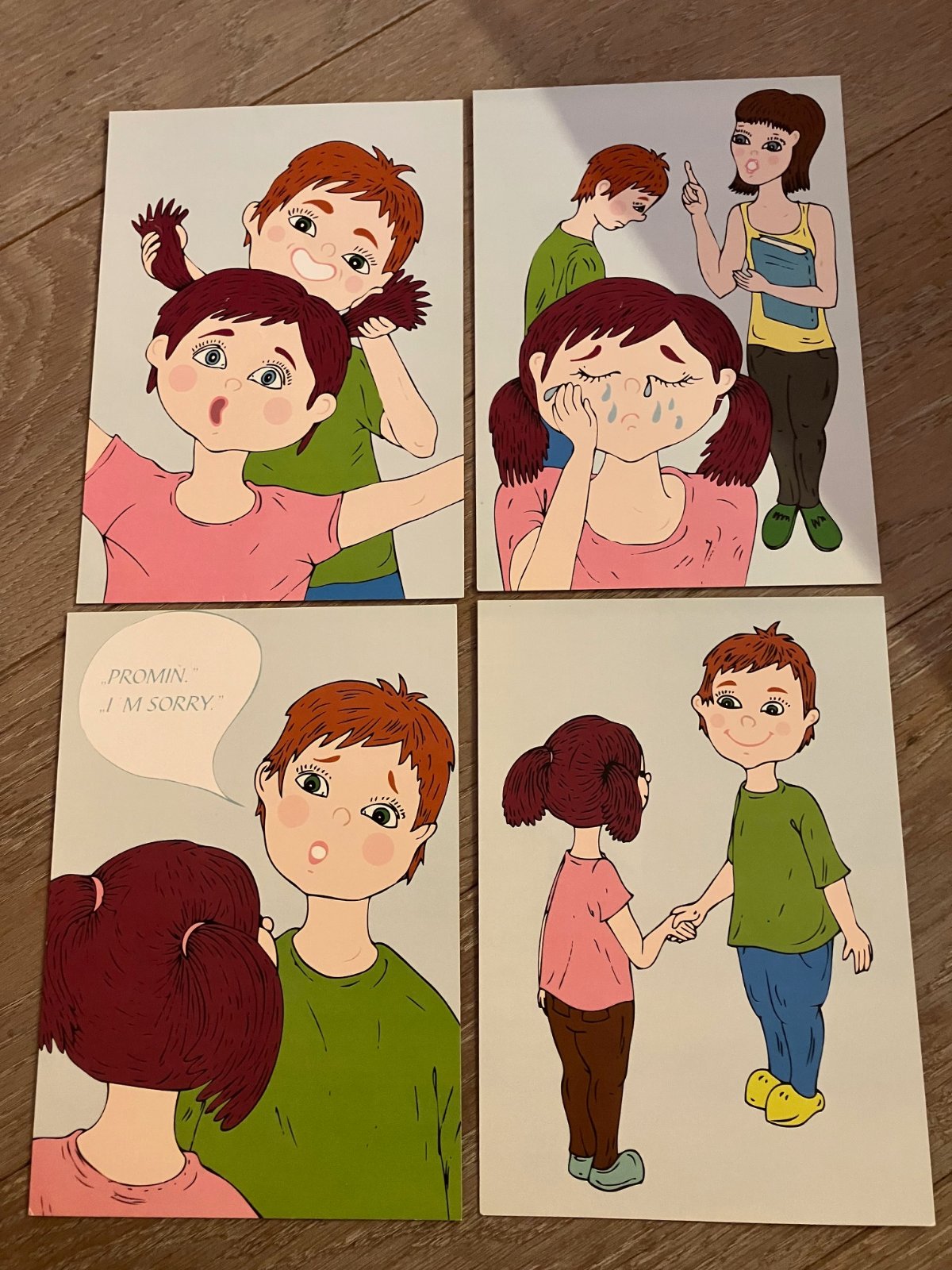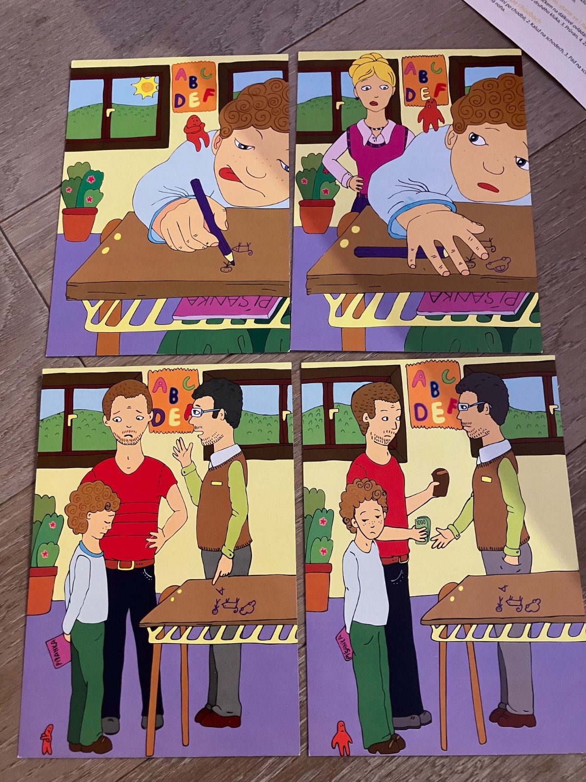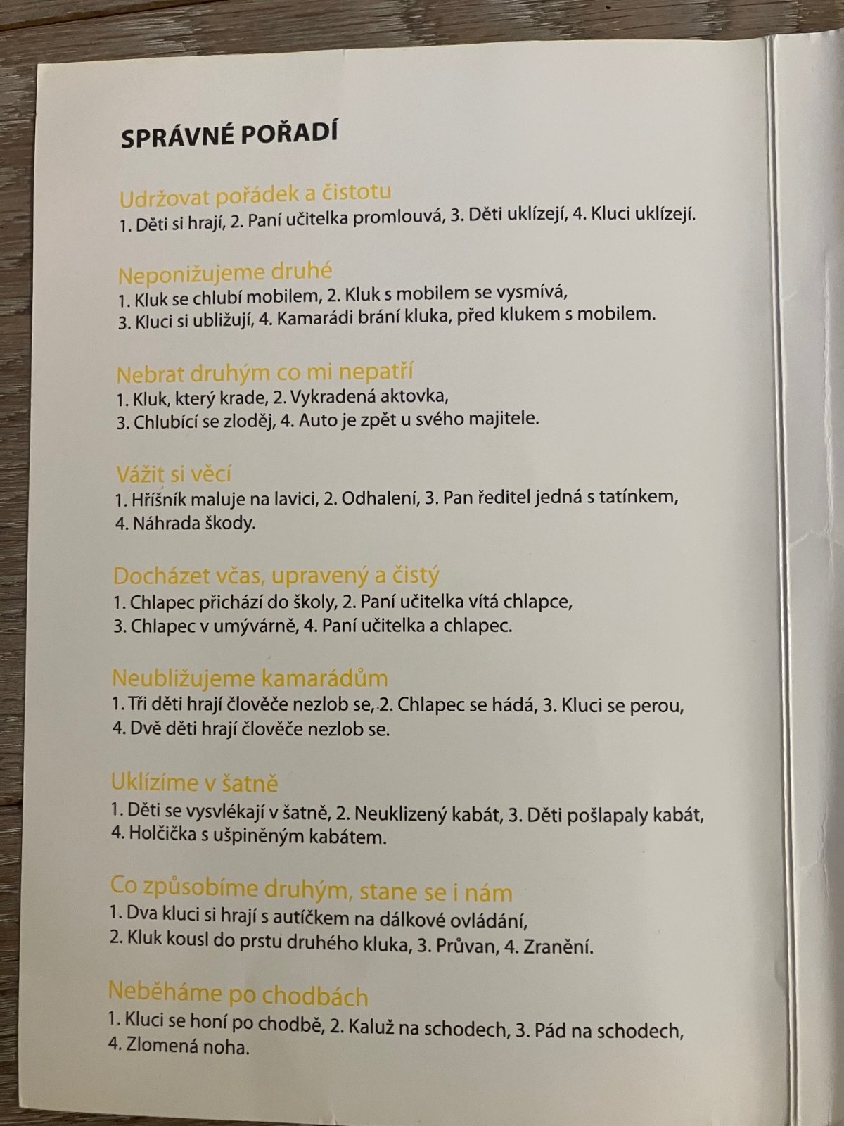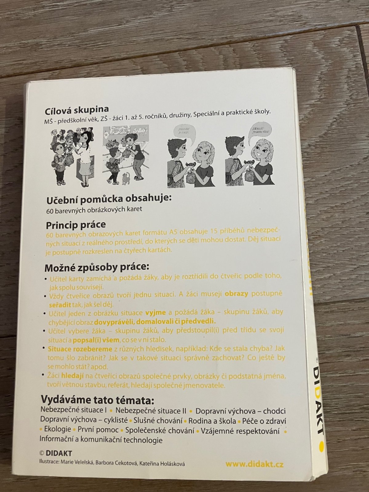 60 barevných obrazových karet formátu A5 obsahuje 15 příběhů situací z reálného prostředí, do kterých se děti mohou dostat. Děj situací je postupně rozkreslen na čtyřech kartách tak, aby z něho bylo možno vyčíst: Proč se to stalo! Jak se to stalo! Když se to už stane, co pro to udělat, aby se to příště nestalo. A když se to stane, jak se zachovat!