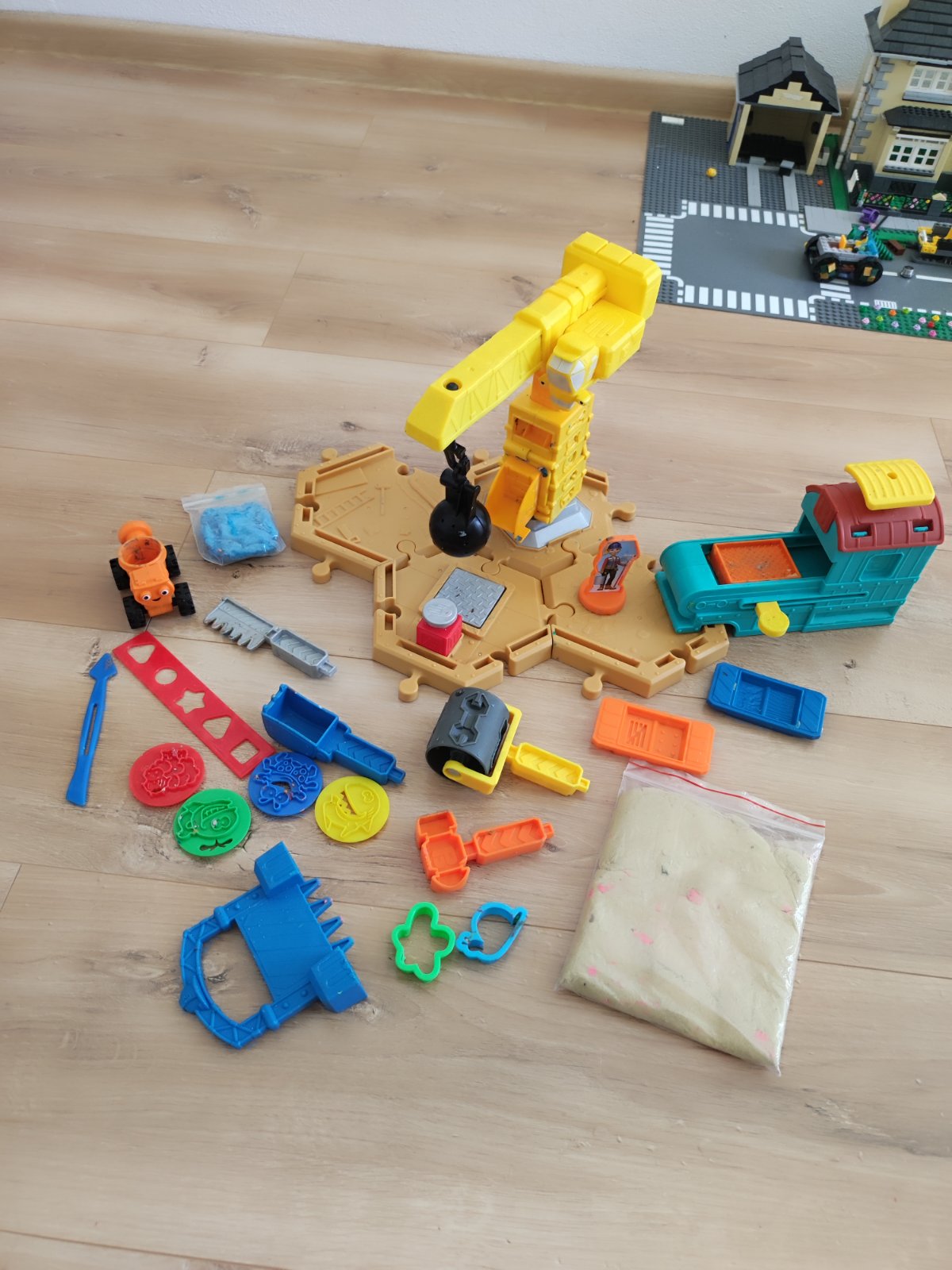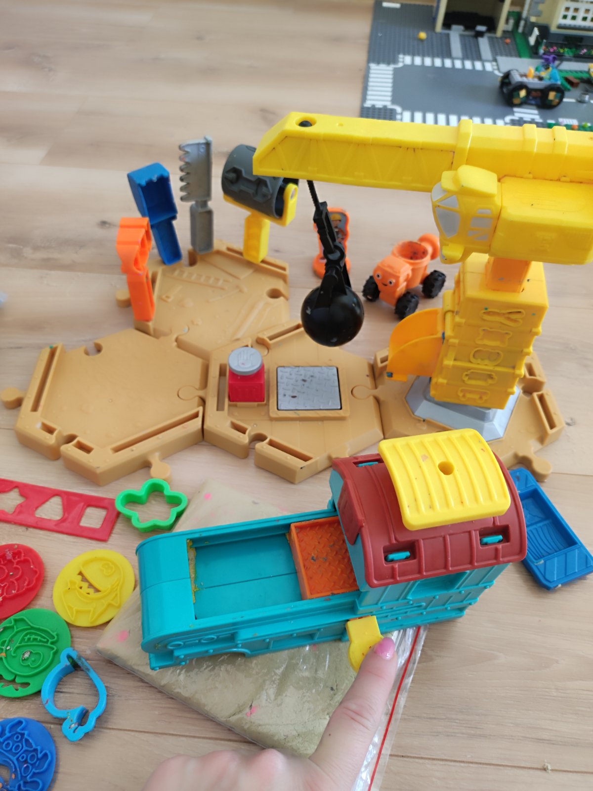 Štyri ľahko použiteľné a ľahko presúvateľné šesťuholníkové dlaždice fungujú ako základ hernej súpravy, takže malí stavitelia môžu svoje pracovisko znova a znova prestavovať. Táto vzrušujúca sada obsahuje obojstrannú pieskovú pečiatku postavy s Bobom na jednej strane a Wendy na druhej strane; žeriav inšpirovaný obľúbenou postavičkou Tiny, ktorý obsahuje viacero foriem a funguje ako demoličná guľa; pieskové vozidlo Dizzy; dva vlastné podnosy na formy; ikonická brána „Bobov dvor“, ktorá slúži ako forma alebo hrable; a garáž na lisovanie foriem, ktorú možno použiť na vytváranie chladných pieskových tehál. Navyše, keď si deti postavia svoje pieskové výtvory, môžu ich pomocou Drobečkovej demolačnej gule zraziť na zem alebo pomocou demolačnej podložky TNT ich vyhodiť do vzduchu