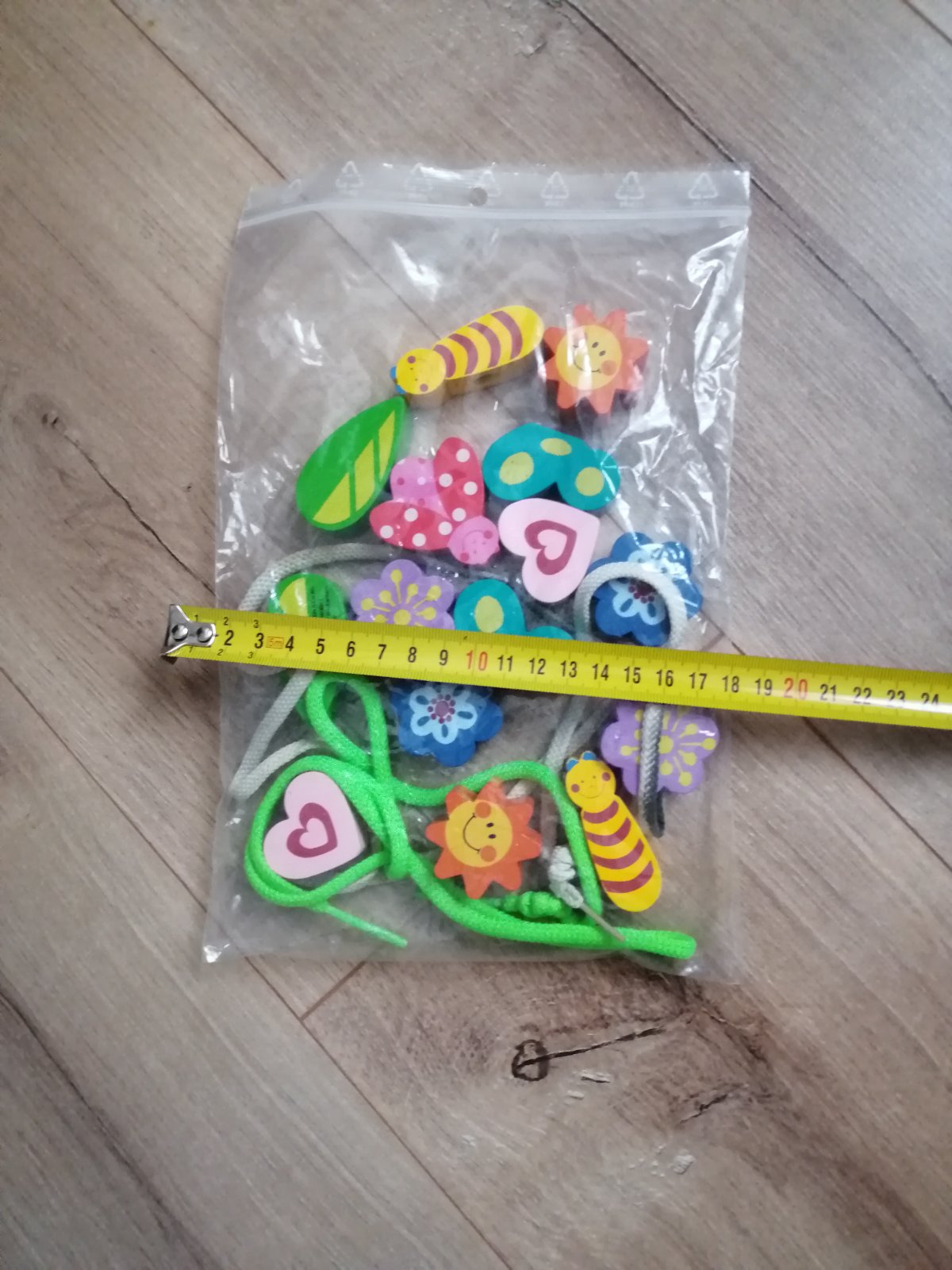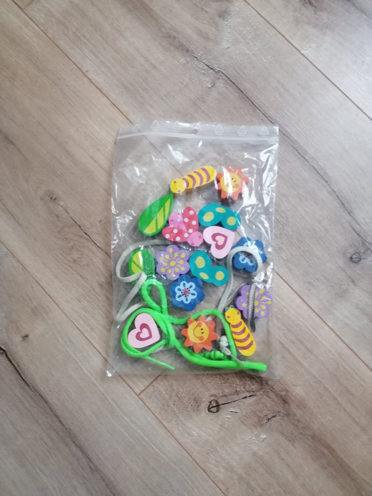 Navliekanie veľkých koralok, motýľ, lienka, kvety