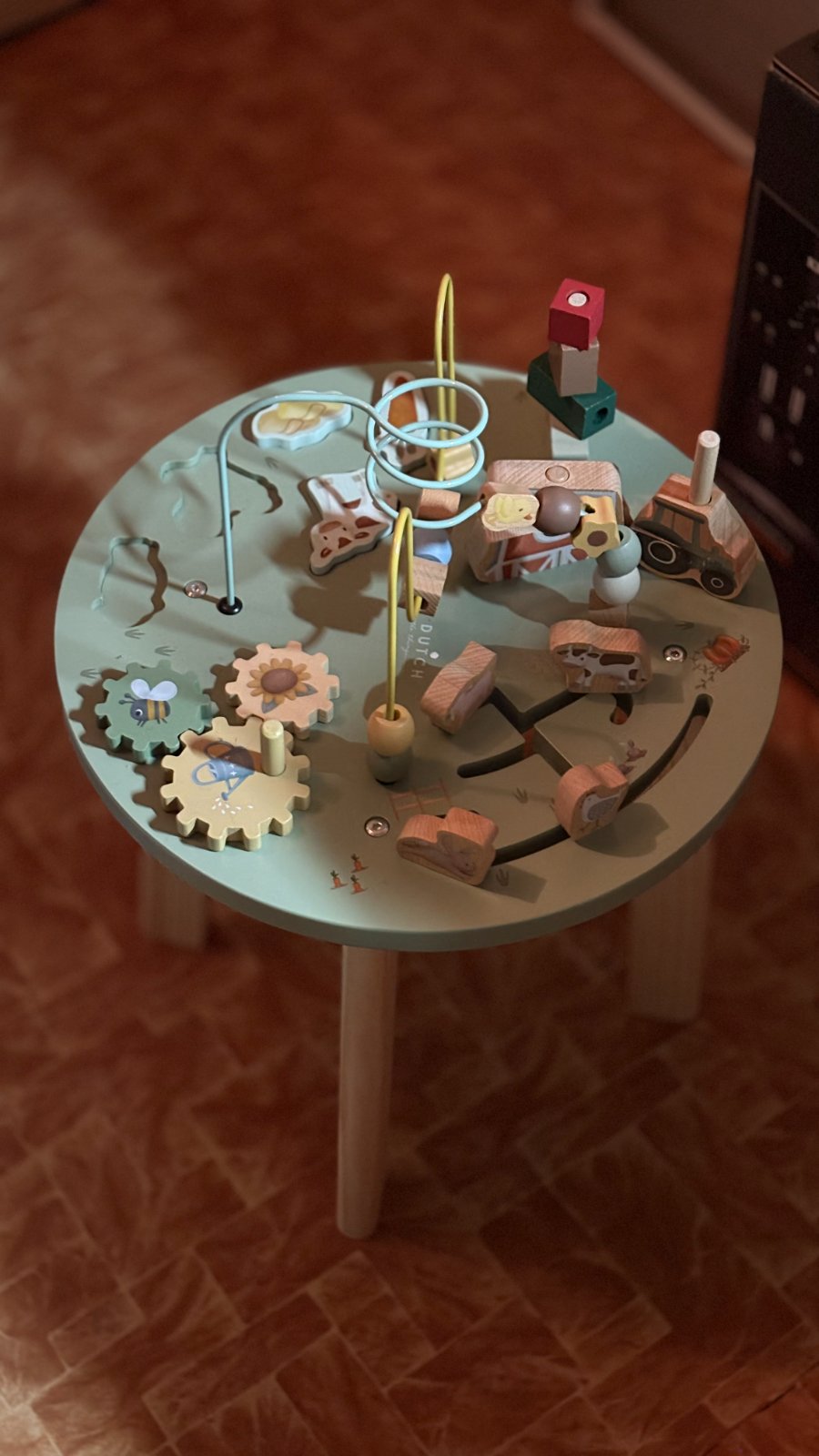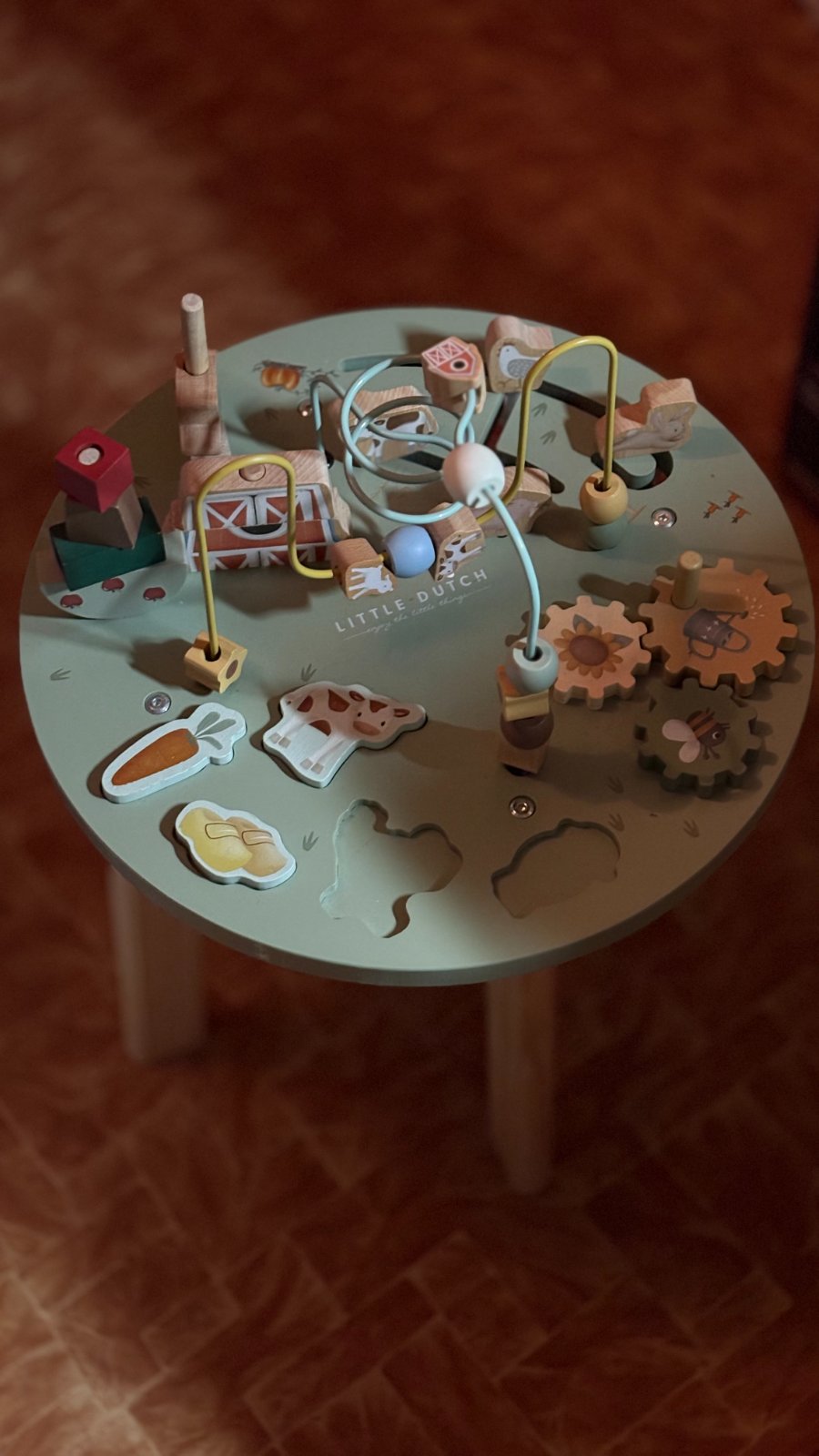 Doprajte svojmu malému objaviteľovi dostatok podnetov na skúmanie. Stolík s aktivitami Little Dutch prenesie vaše dieťatko do prostredia farmy. Tešia sa naň ovečka, kohút, kravička aj ďalšie zvieratká. Malí prieskumníci objavia celkom päť aktivít, ktoré rozvíjajú ich jemnú motoriku aj jednotlivé zmysly. Koráliky sa dajú presúvať po špirále, farma čaká na postavenie, ozubené kolesá sa točia, niektoré zvieratká sa pohybujú a iné čakajú na stlačenie. Vďaka bezpečnému a stabilnému dizajnu je stolík Little Dutch tiež výbornou oporou pre deti, ktoré začínajú vstávať, alebo sa púšťajú do prvých krôčikov. Stolík je súčasťou dizajnovej kolekcie Little Dutch Farma a bol vyrobený z dreva. Je vhodný pre deti od 12 mesiacov.