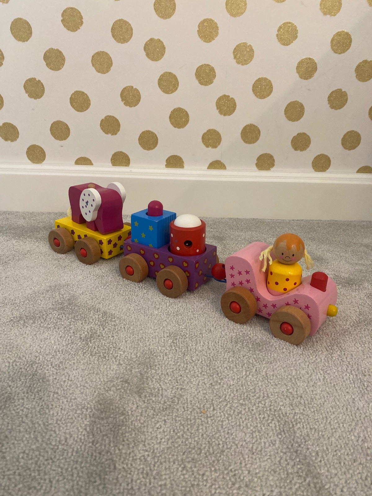 Krásny dreveny vláčik. Veľmi mierne znamky poškodenia, dá sa povedať že iba na prednom ružovom vláčiku. Postavičky sa dajú vkladať. Cerveny valec s bielou guľôčkou má v sebe rolničku, Modra kocka po stlačeni píska. Slonovi sa hýbu uška. Pôvodná cena 30€. Veľkosť cca 40cm na dĺžku. Na vysku cca 12cm.