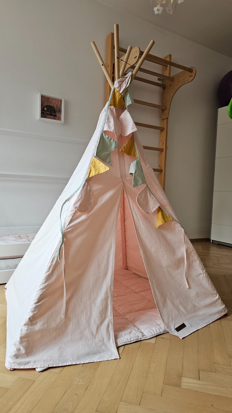 Drevené stanové tyčky, mäkká podložka, dekorácia pierok a farebný záves.