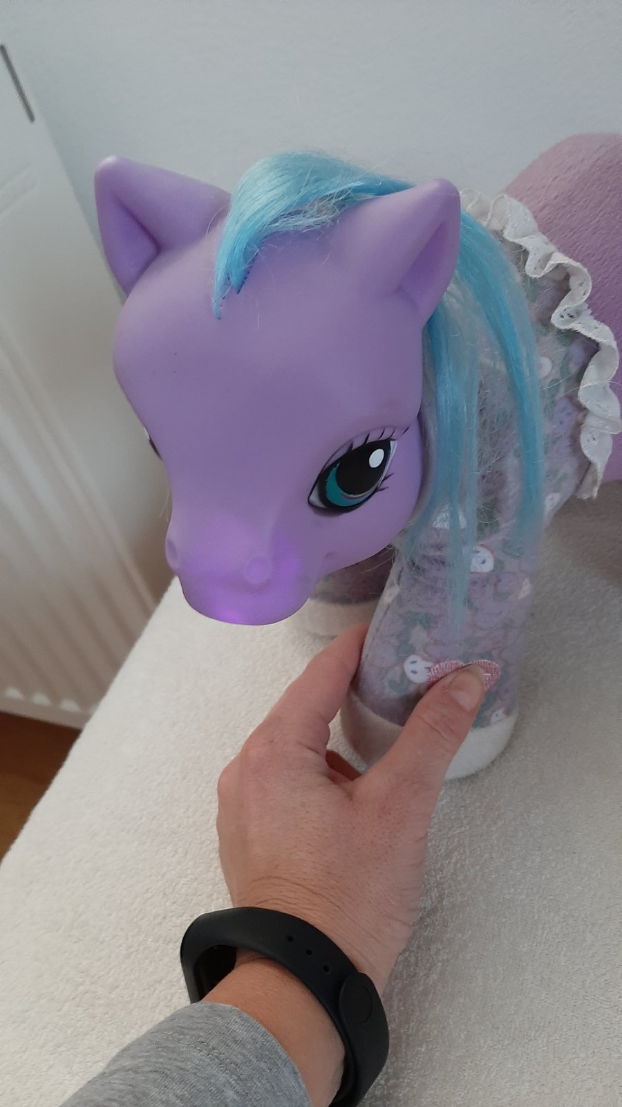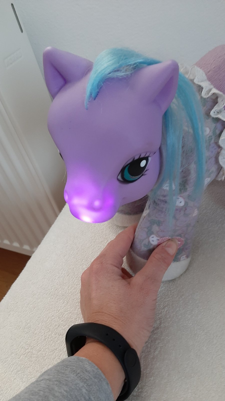 💜💜💜Plyšový,hlavu ma tvrdu gumu.Po stlaceni na nožičke sa mu rozsvieti papulka .Ponik sa rozveselí a vydá zvuk.