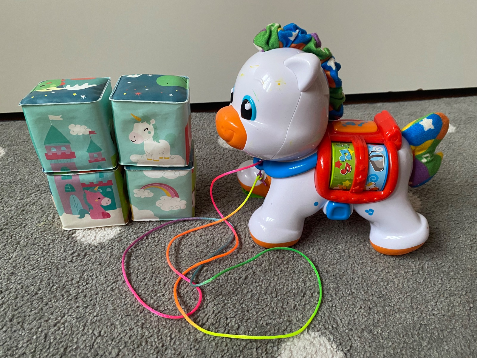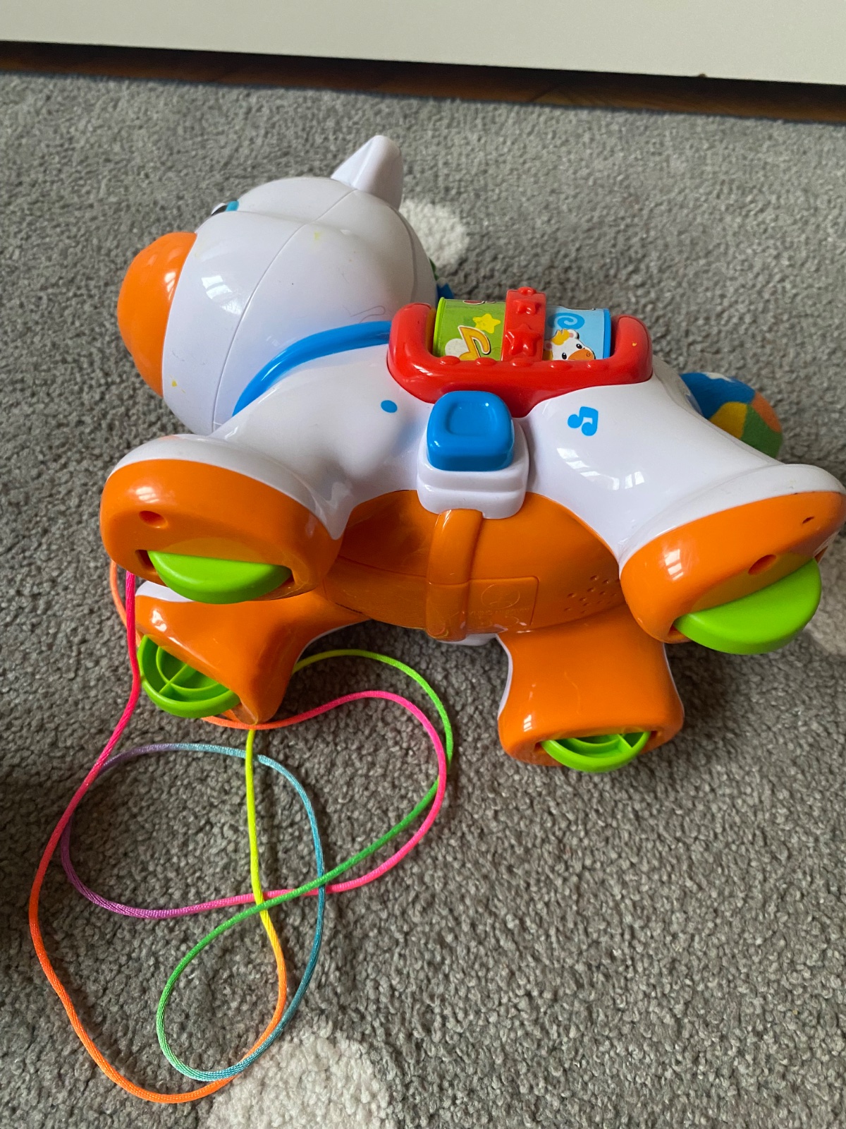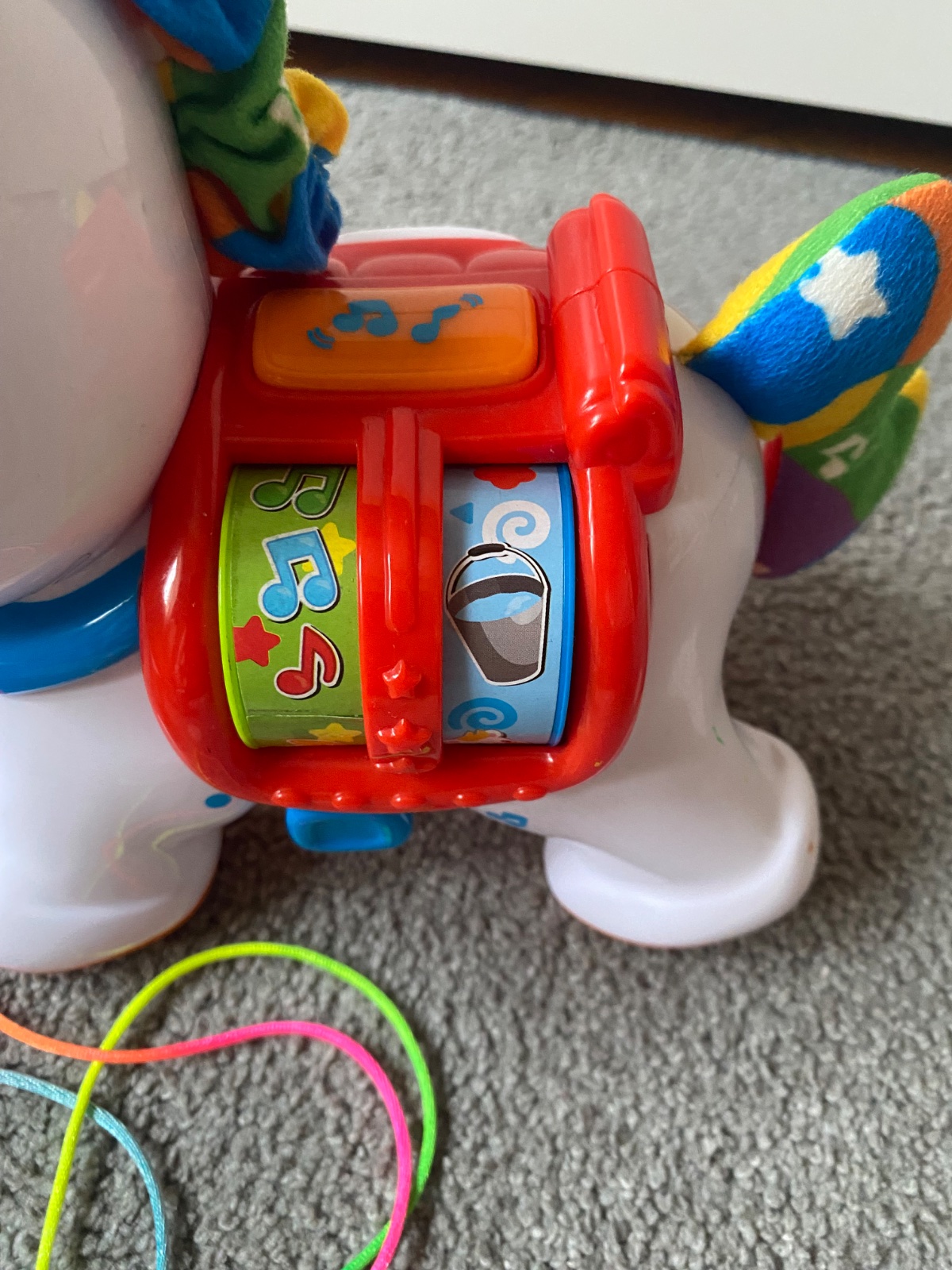 Priložim aj plastového koníka na kolieskach ako tzv. zvuková hračka, vhodný aj na ťahanie. Pri zapnutí vydáva rôzne zvuky a hrá melôdiu. Bočné obrázky sa dajú posúvať a tým sa menia aj zvuky, alebo sa stlačí vrchné oranžové tlačidlo.. Znacka baby Clementoni.