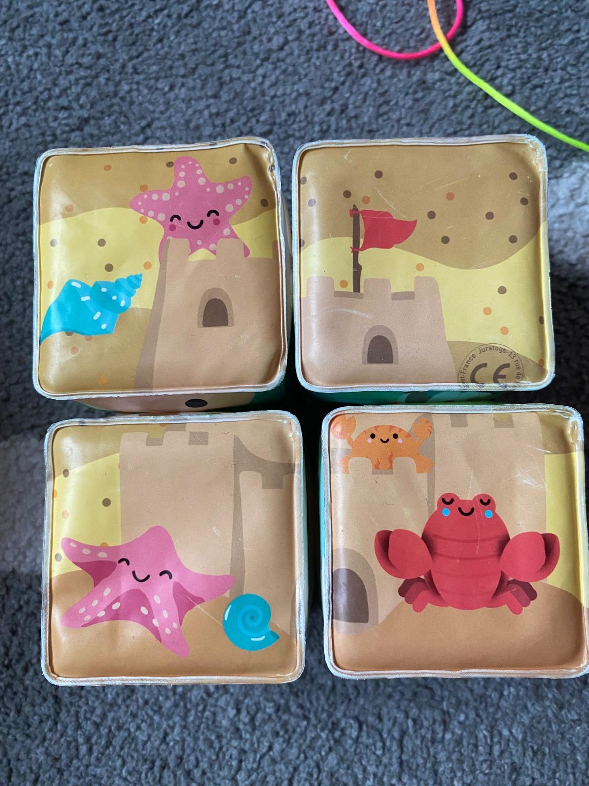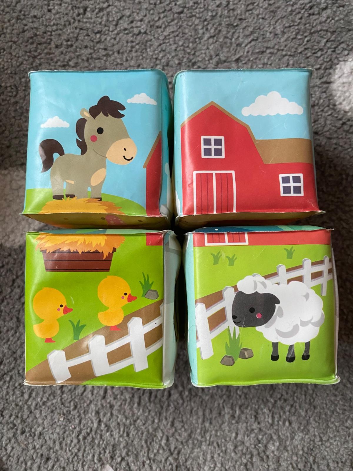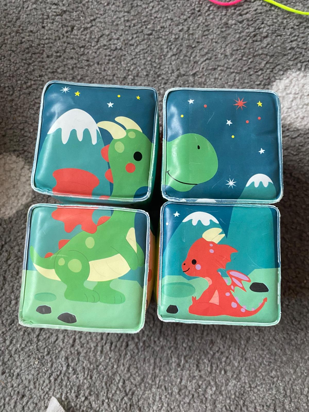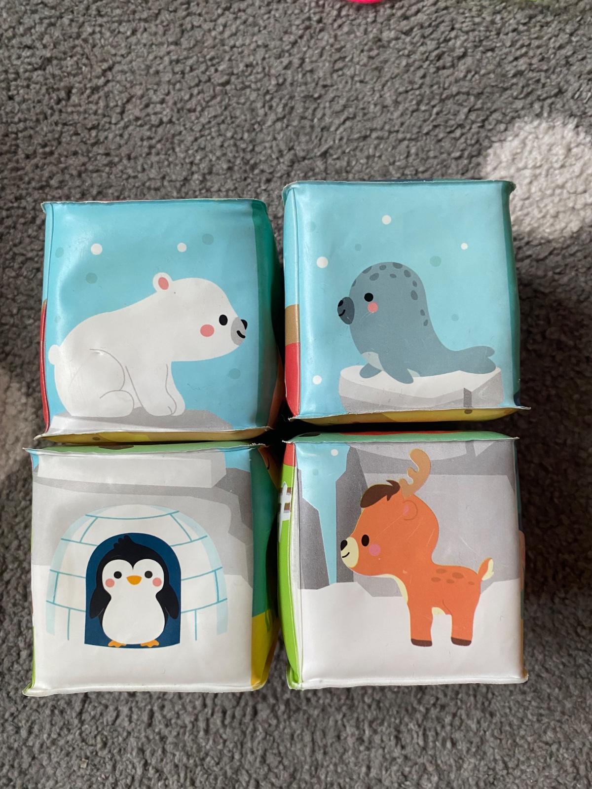 Mäkké plastové kocky pre najmenších s veselými motívmi zvieratiek od zn. Janod. Kocky sú vhodné na hru na suchu aj vo vode, vhodné pre bábätká od 10 mesiacov. Balenie obsahuje 4 kocky, z ktorých je možné poskladať 6 motívov – korytnačky, domáce zvieratká na farme, jednorožci, dráčiky, polárne zvieratká, morské zvieratká.