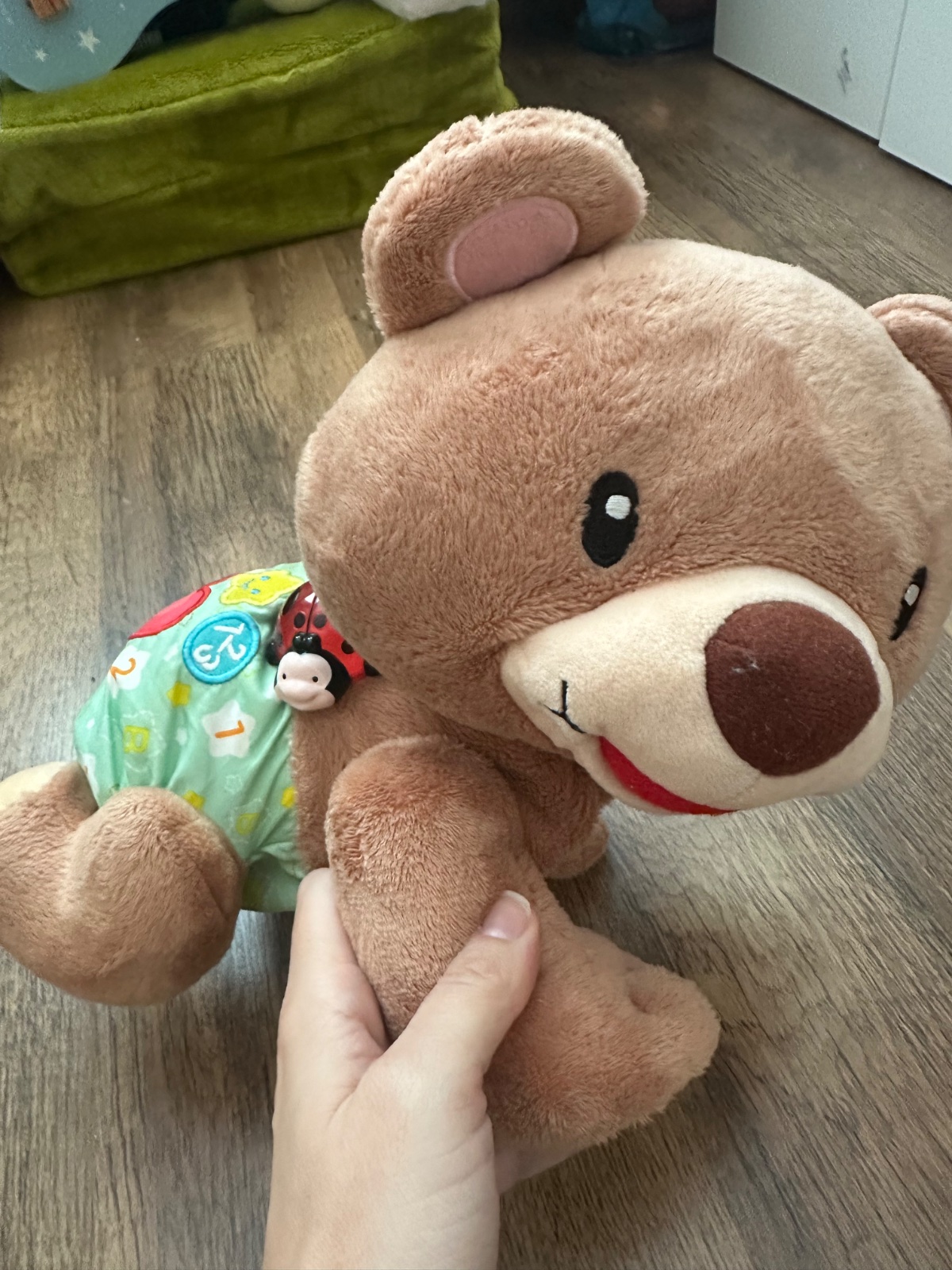 Značka Fisher price. Hrá upokojujúce melódie, bruško sa pohybuje hore dole, lampa svieti, hračka dýcha, bije mu srdiečko. Toto všetko sa dá zvlášť vypínať podľa potreby. Super pomôcka na zaspávani...