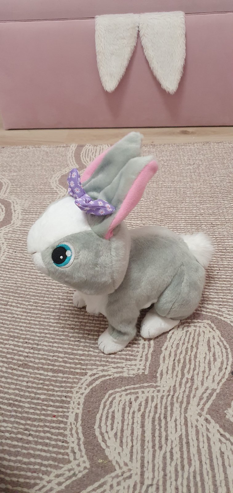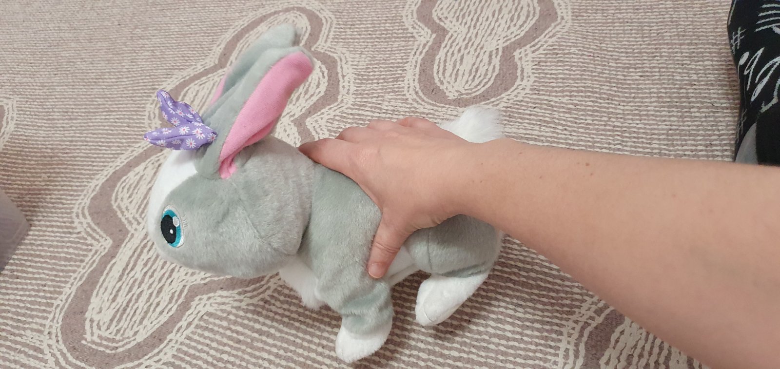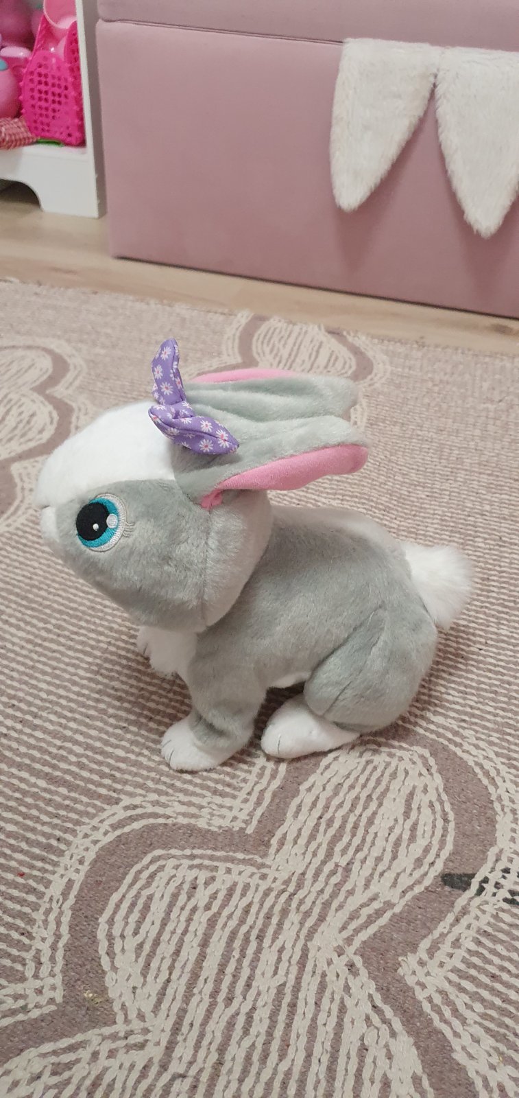 Zajacik hopka, reaguje zvukmi na pohladenie, v super stave, na baterie