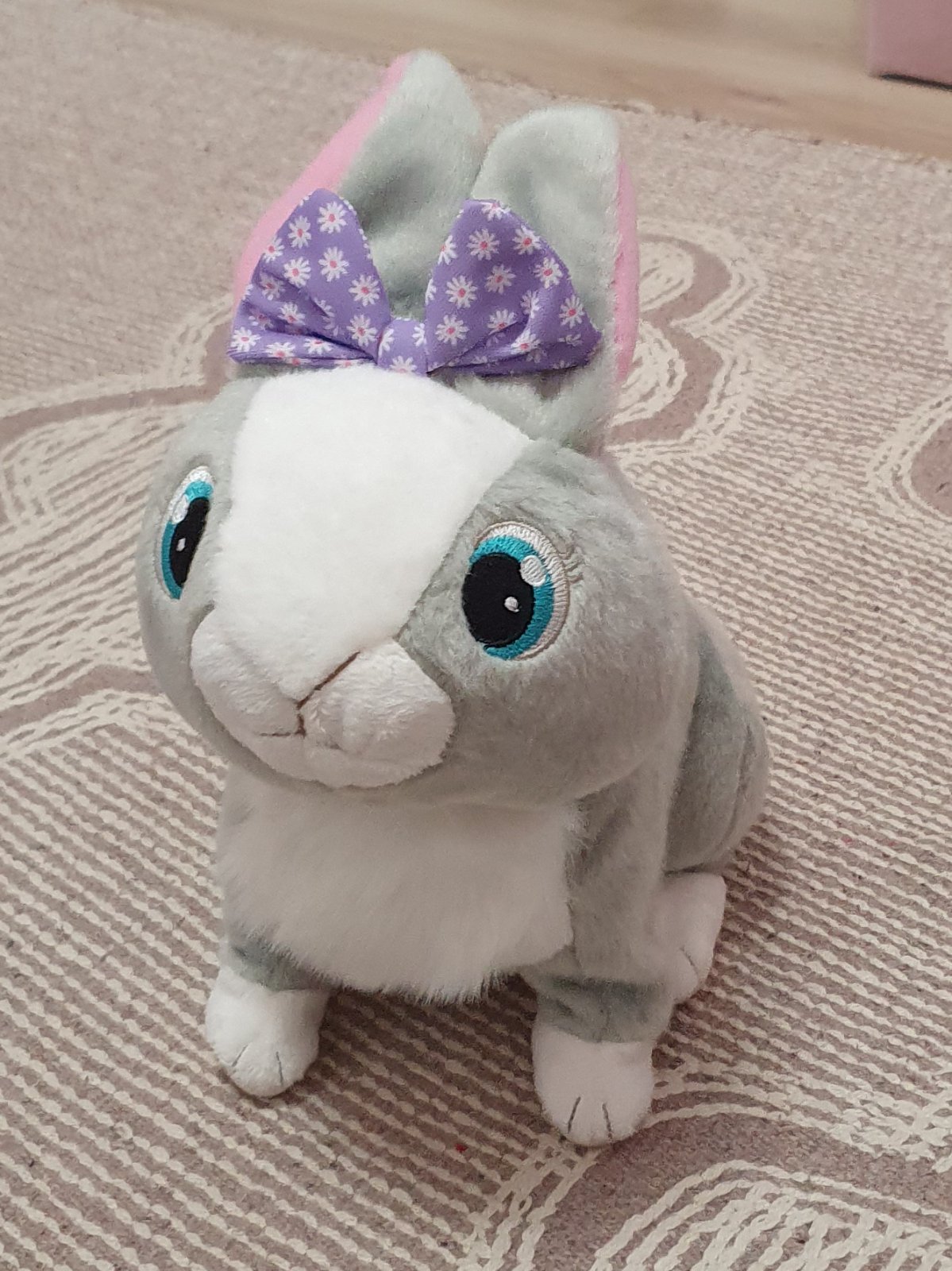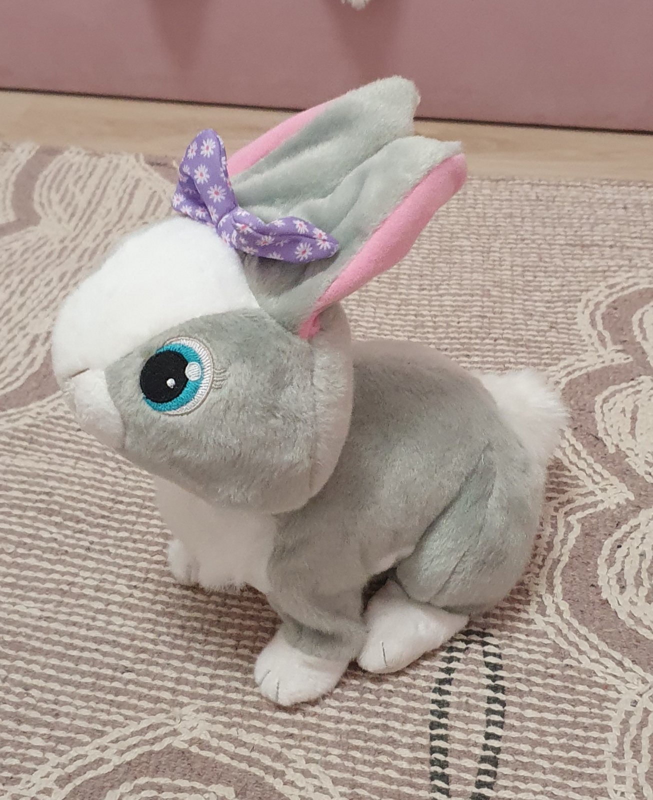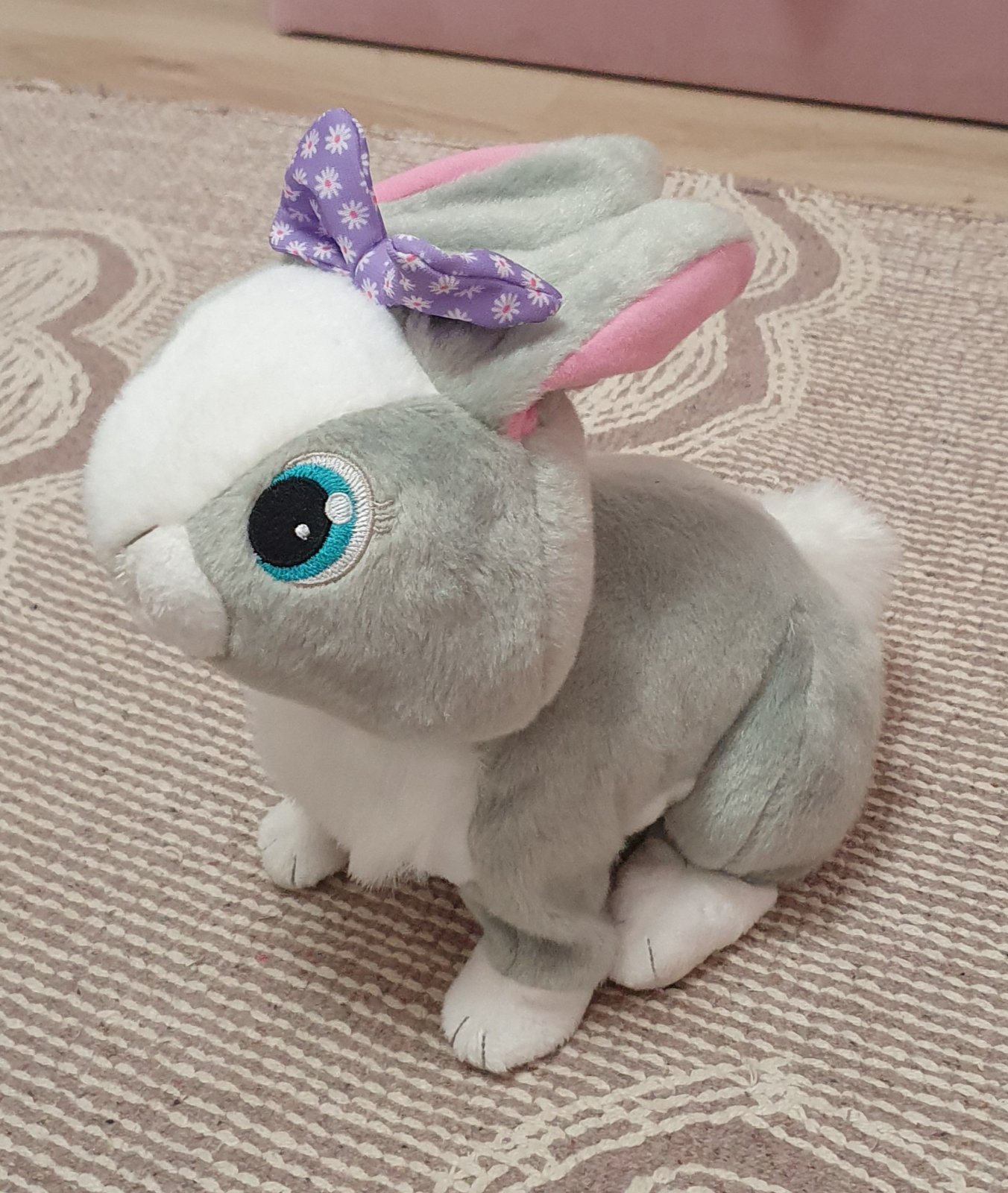 Zajacik hopka, reaguje zvukmi na pohladenie, v super stave, na baterie