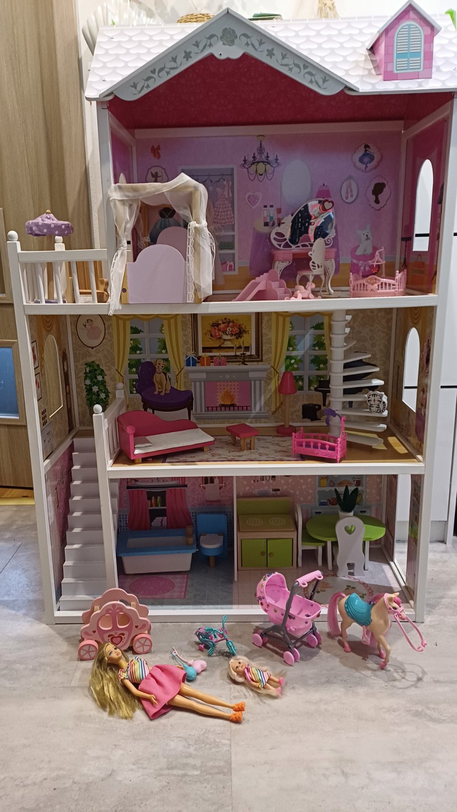 Rozprávkový domček pre bábiky, ktorý zaujme každé dievčatko :) Domček a doplnky majú krásne farebné prevedenie. Dom má 3 veľké podlažia s 5 izbami ako: obývačka, kuchyňa, jedáleň, spálňa a kúpeľ...
