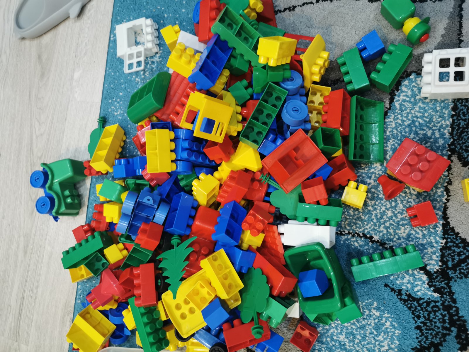 Truhlica obsahuje rôzne kocky, vláčiky, okná, strechy, stromy, panáčikov, vagóny, cca 180 ks.V