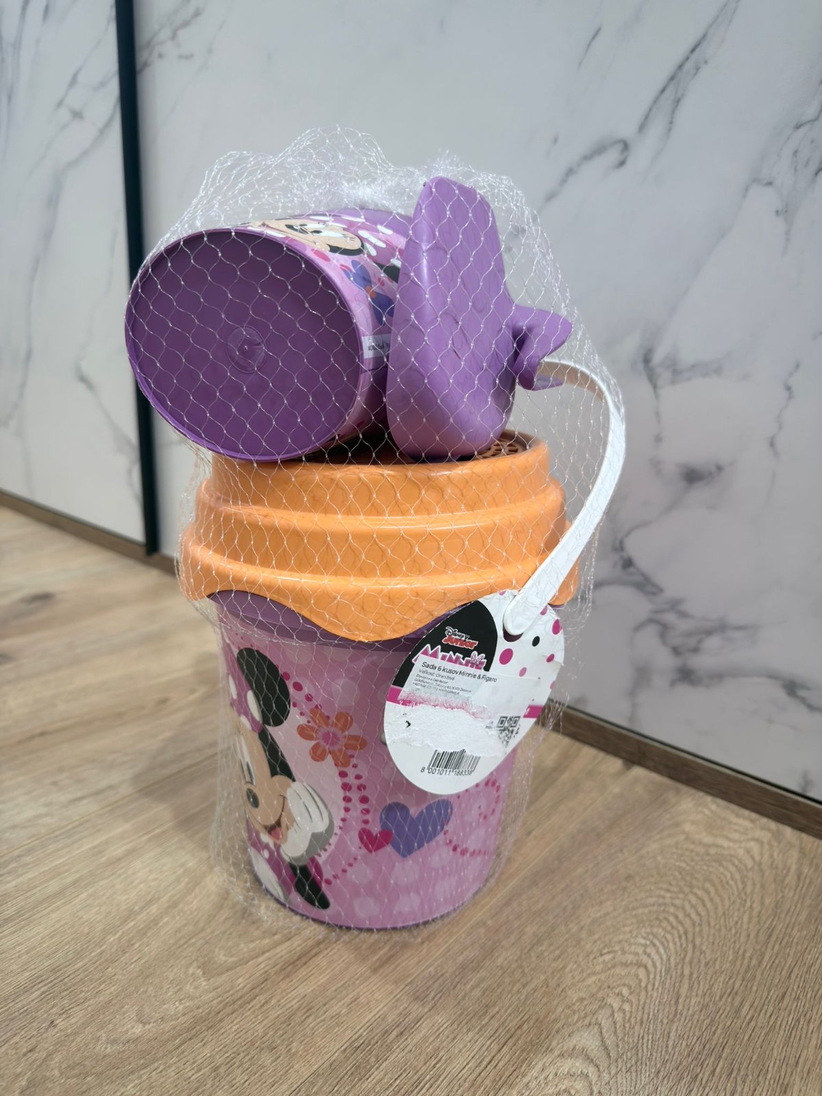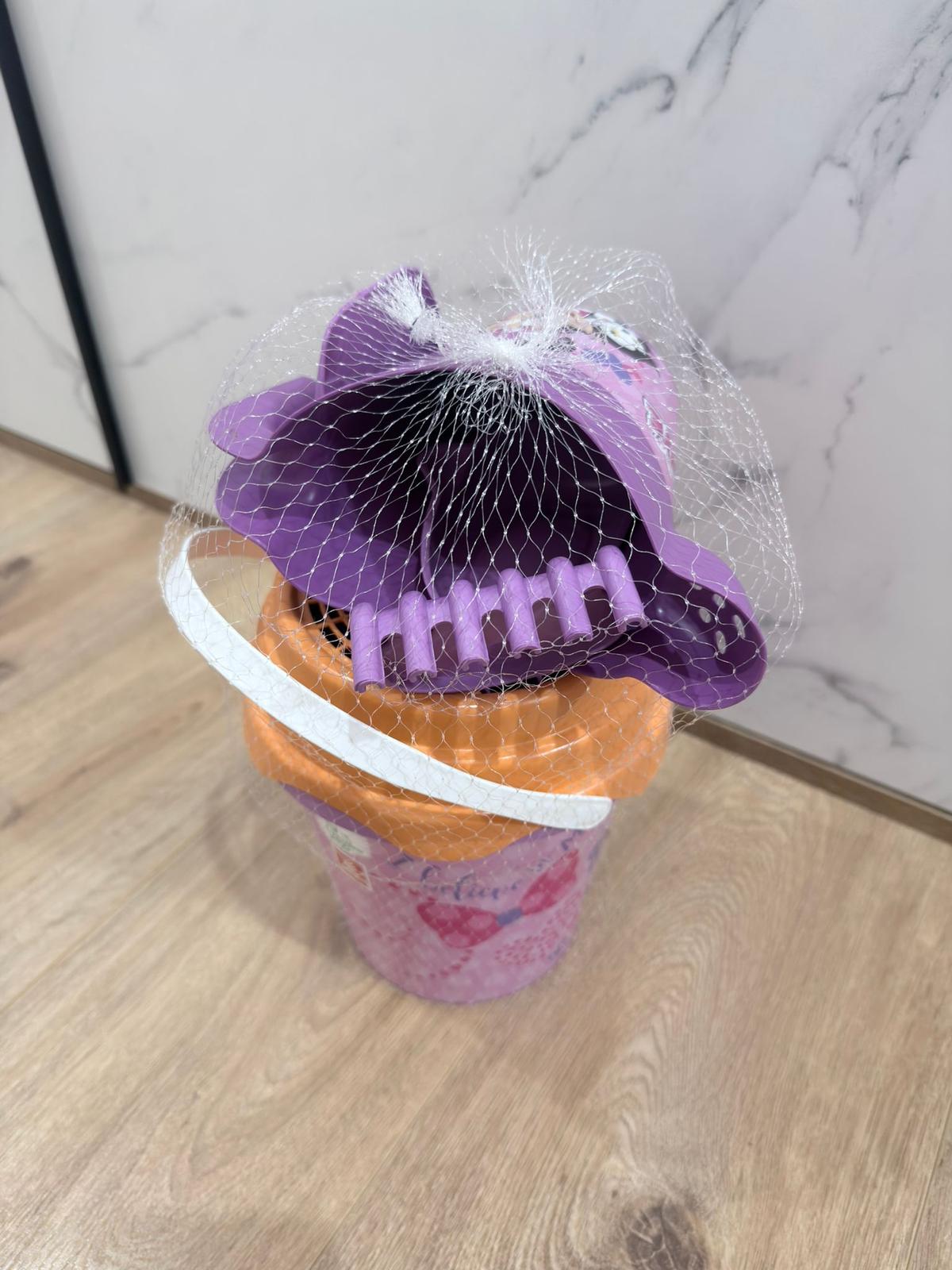 šesťdielna sada Minnie Mouse obsahuje: vedro, lopatku, hrable, sito, formu a krhličku - 2,69€
