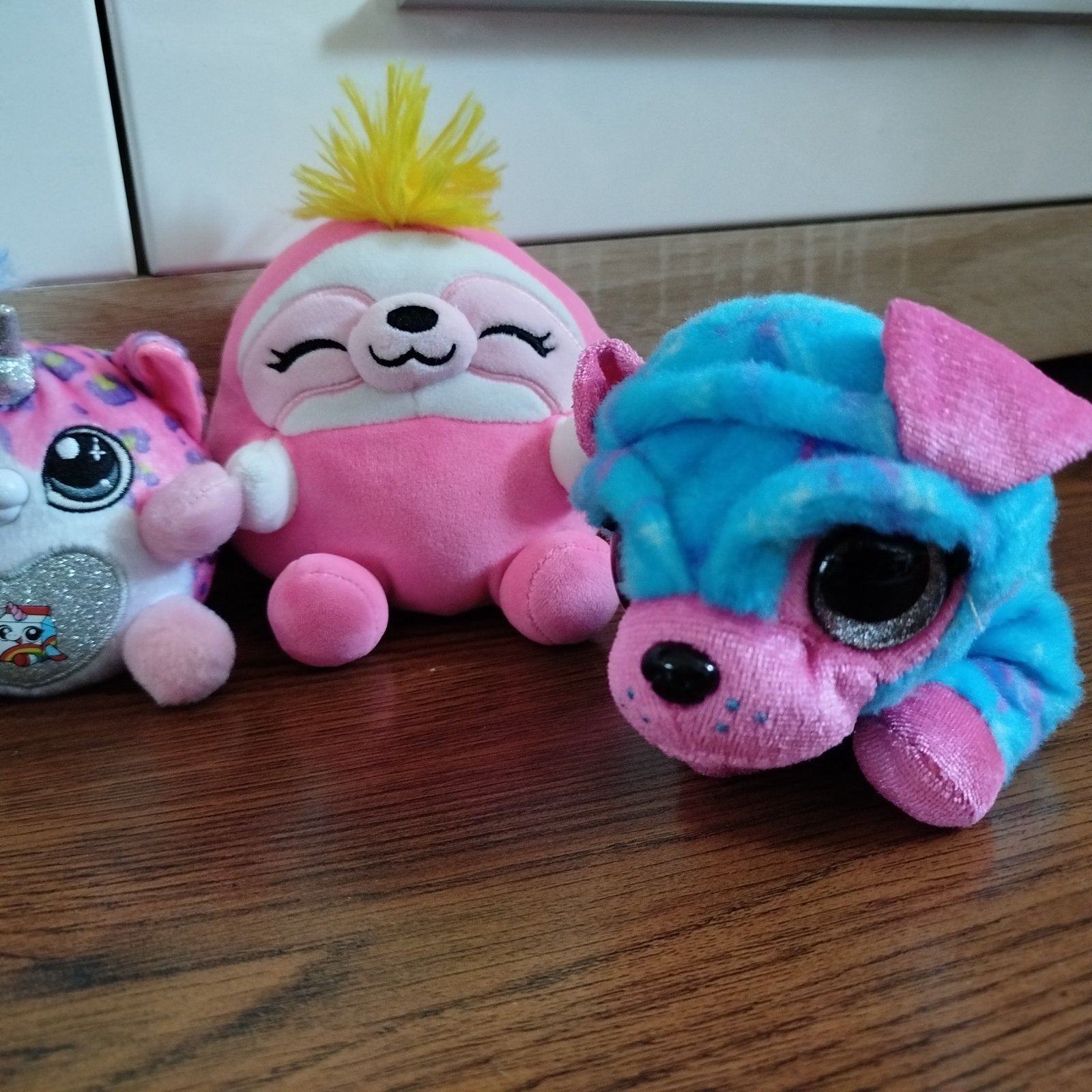 Populárne dievčenské plyšáky v super stave, niektoré úplne nové. Zvieratká ZURU s rohom majú trblietavé krídla. Žltý a ružový je mäkučký Squishmallows. Malý modrý je z kolekcie Present Pets. Modro ružový psík je ZURU Coco Neon. Žirafa je Ojo Plush Toy. Tučniak je squishy antistress, toho pridávam zdarma. Cena a predaj LEN SPOLU + pošta.
