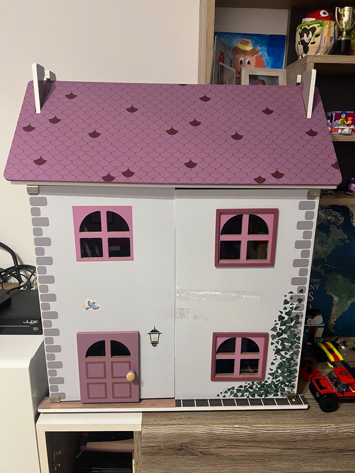 Hrany domcek, nema funkcne poskodenie, domcek sa z prednej strany otvara, hlavne dvere sa otvaraju (s pruzinkou) a otvara sa aj strecha. Rozmery 55x33x67cm. Vo vnutri su schody, nema prislusenstvo. Jedina mala vizualna vada je, ze deti prilepili na prednu cast lepiacu pasku a vidiet po nej 2 jemne ciary - vid detail. Osobny odber v Košiciach, viem aj priniest.