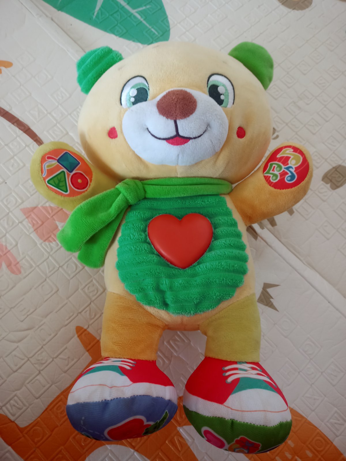Má 5 interaktívnych tlačidiel: 4 na labkách a jedno na brušku. Po stlačení týchto tlačidiel spieva, učia deti farby, tvary, písmená a číslice. A to všetko v 3 jazykoch (CZ, SK, HU). Tlačidlo na brušku v tvare srdiečka sa rozsvieti, rozbliká a medvedík spieva roztomilým hlasom veselú melódiu. ušká medvedíka sú vhodné na cumľanie a ohryzávanie. Sú vyrobené z materiálu, ktorý to umožňuje.