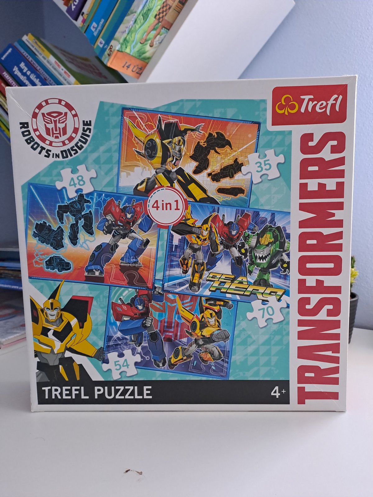 Detské puzzle s motívom animovaného seriálu Transformers. Zložiť možno celkom 4 obrázky puzzle s rôznou obtiažnosťou - 35, 48, 54 a 70 dielov.