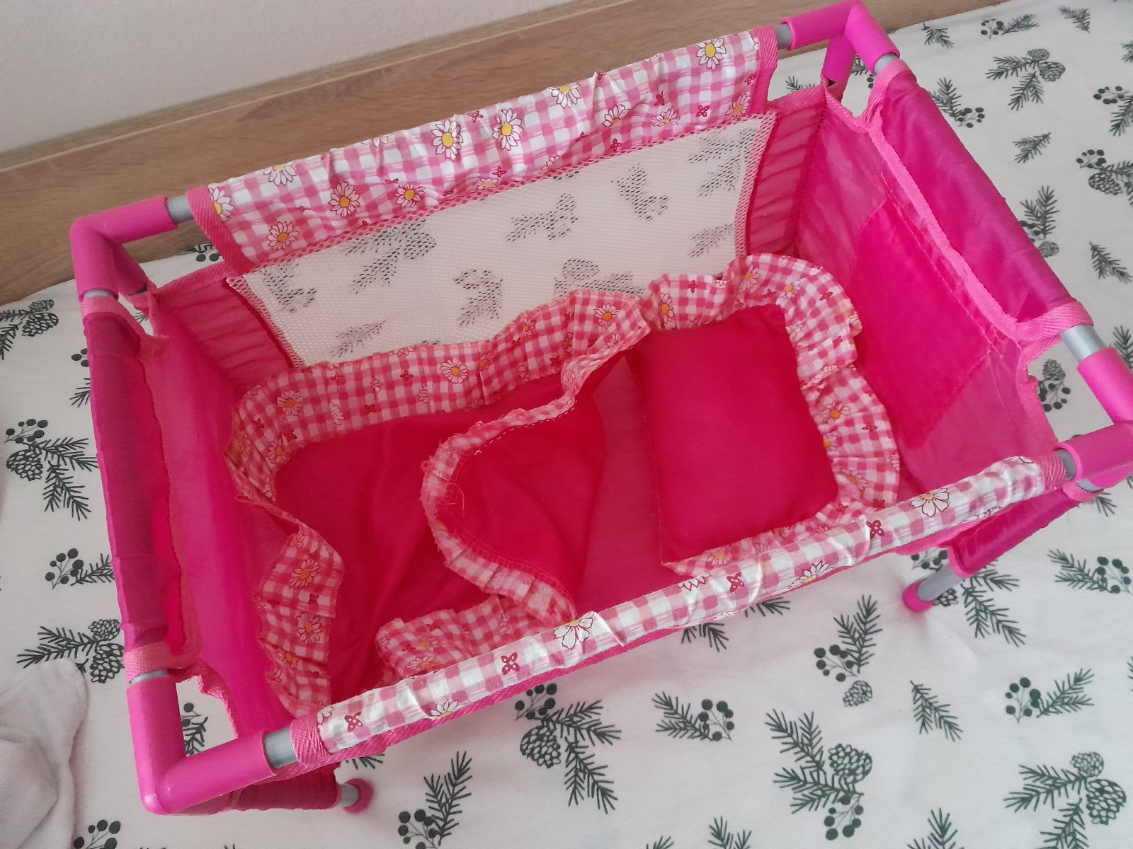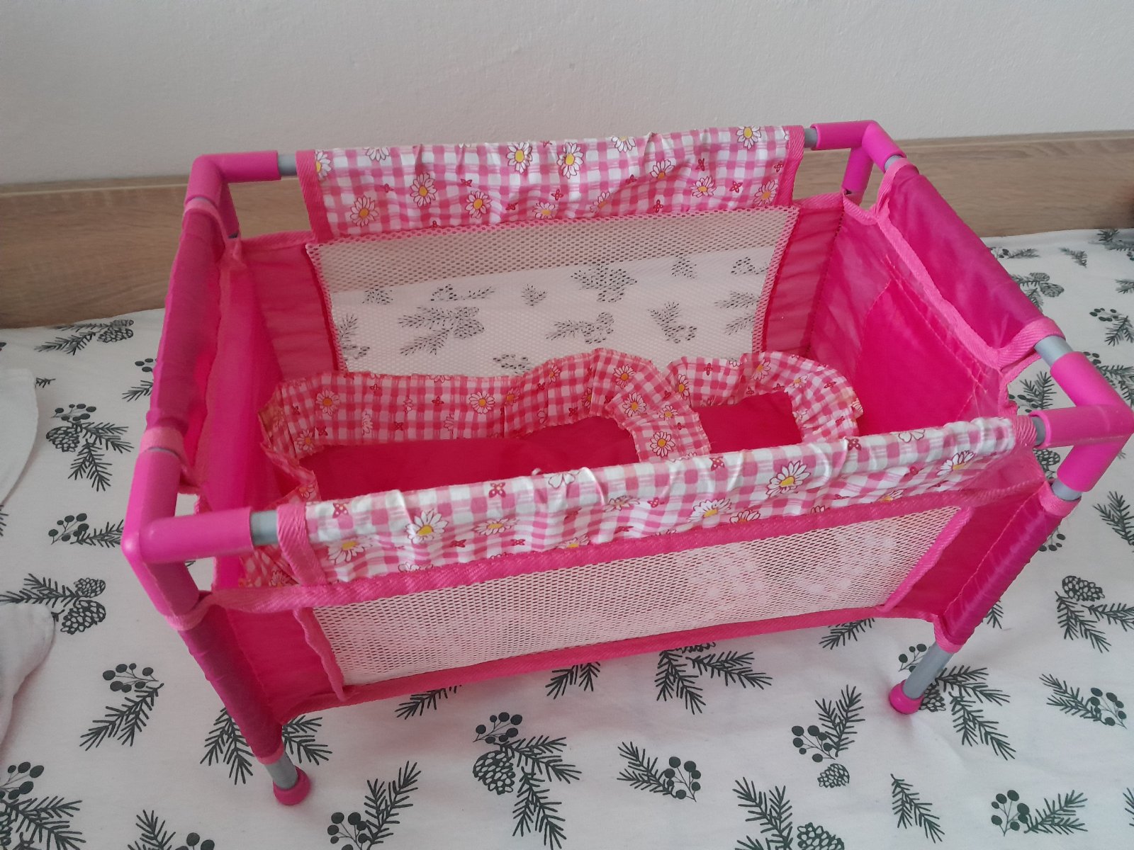 Postieľka pre bábiky, s kovovou konštrukciou, ktora sa dá zložiť a odložiť do skrinky.